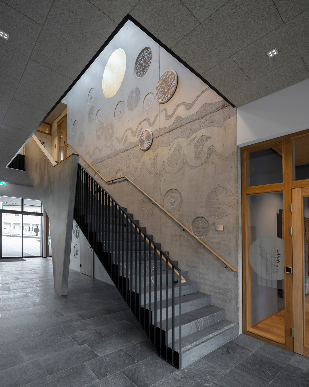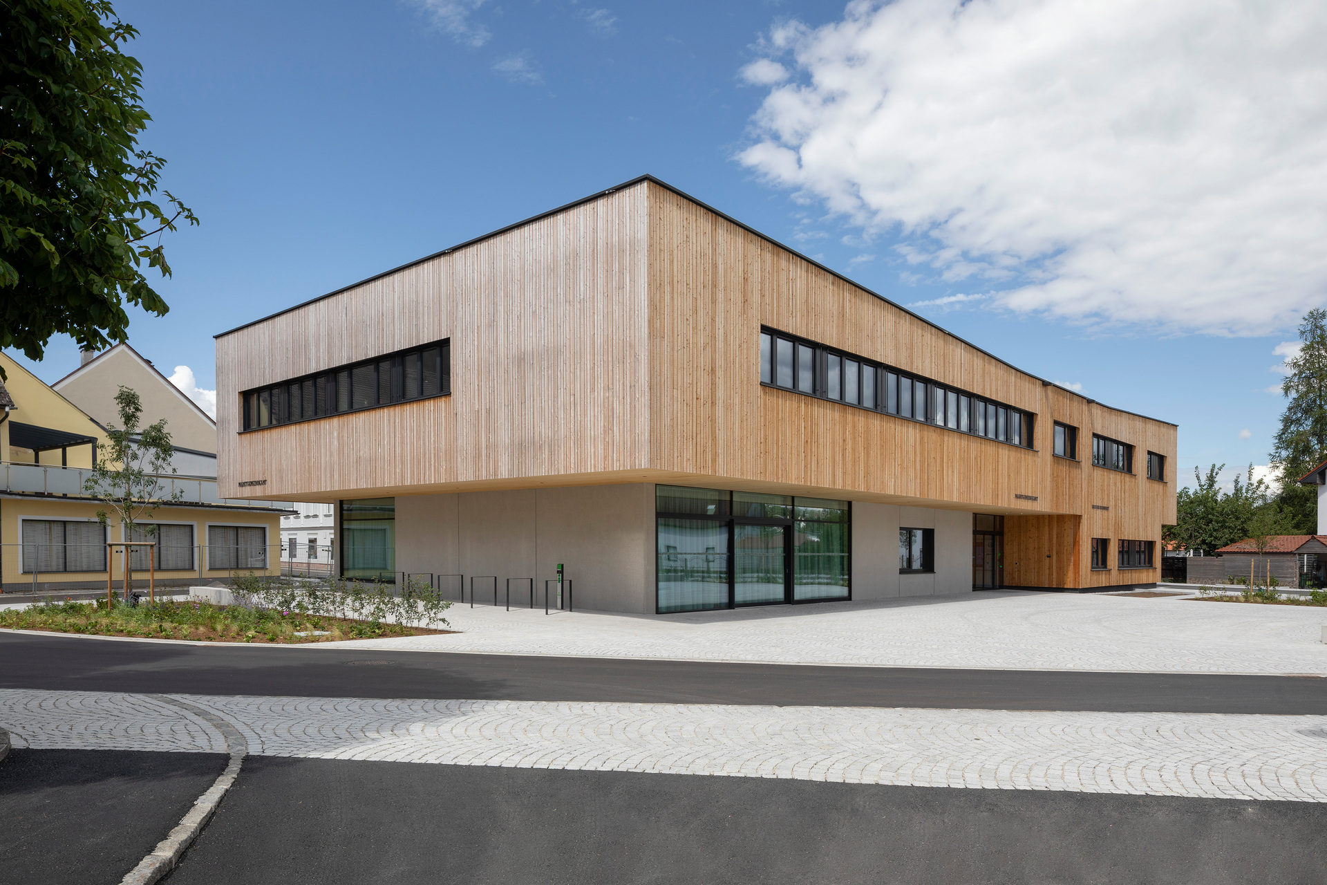 Dunkle Fensterbänder und querformatige Einzelfenster betonen die Horizontalität des Gebäudes. In seiner Bauhöhe passt sich der Neubau in die umgebende Bebauung ein. Die auf der Südseite vorgelagerte Platzfläche erhält durch den Neubau einen wirkungsvollen Abschluss. Zur Eingangshalle hin neigen sich die Dachflächen als leicht abfallende Pultdächer. Sie betonen damit die Gebäudemitte und erzeugen eine moderate Dynamisierung des Baukörpers. Eine eigenständige Gestaltung erfuhr die große Haupttreppe in der Eingangshalle. Die V-förmig aufgespaltene Treppenwange wirkt als eigenständiges, skulpturales Element. Die konstruktiv als versteifendes „Rückgrat“ des Gebäudes fungierende Betonwand wurde durch das bewegte Relief „Licht/Kosmos_Vöckla“ von Wilhelm Scheruebl künstlerisch gestaltet und prägt die Atmosphäre der Halle. (Text: Georg Wilbertz, bearbeitet)