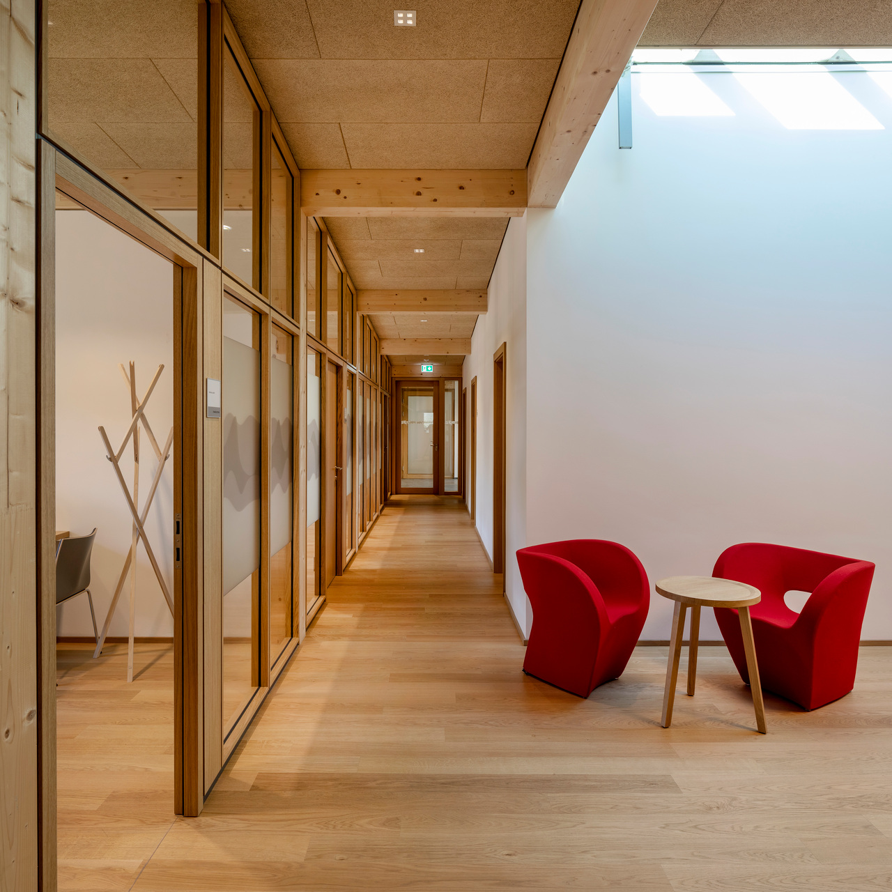 Beim „Haus der Gesundheit“ im Ostflügel sind Erd- und Obergeschoss formal und konstruktiv nicht voneinander unterschieden. Hier verlaufen die Fassadenlatten durchgängig über die gesamte Gebäudehöhe und unterstreichen so die innere Struktur des Primärversorgungszentrums, das sich mit seinen unterschiedlichen medizinischen Angeboten über beide Etagen zieht. Konstruktiv wurde der Ostflügel als Hybrid aus Massiv- und Holzbauweise ausgeführt. Zwischen West- und Ostflügel wurde die zentrale, von zwei Seiten aus zugängliche Eingangshalle gesetzt. Sie funktioniert als Durchgang von der Süd- zur Nordseite, wodurch eine Riegelwirkung des Gebäudes verhindert wird. Die zentrale Position der Halle schafft Transparenz und Durchlässigkeit zum Stadtraum und minimiert die Erschließungs- und Wegeflächen im Inneren.