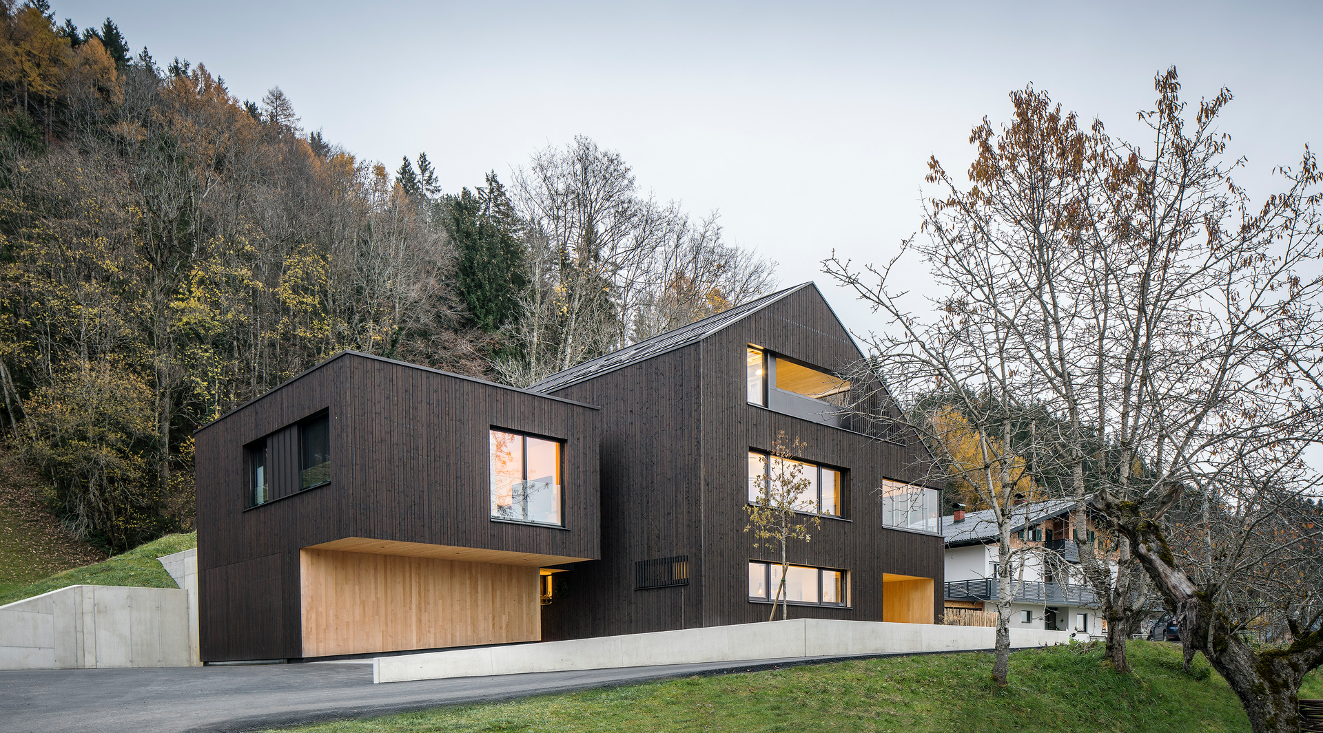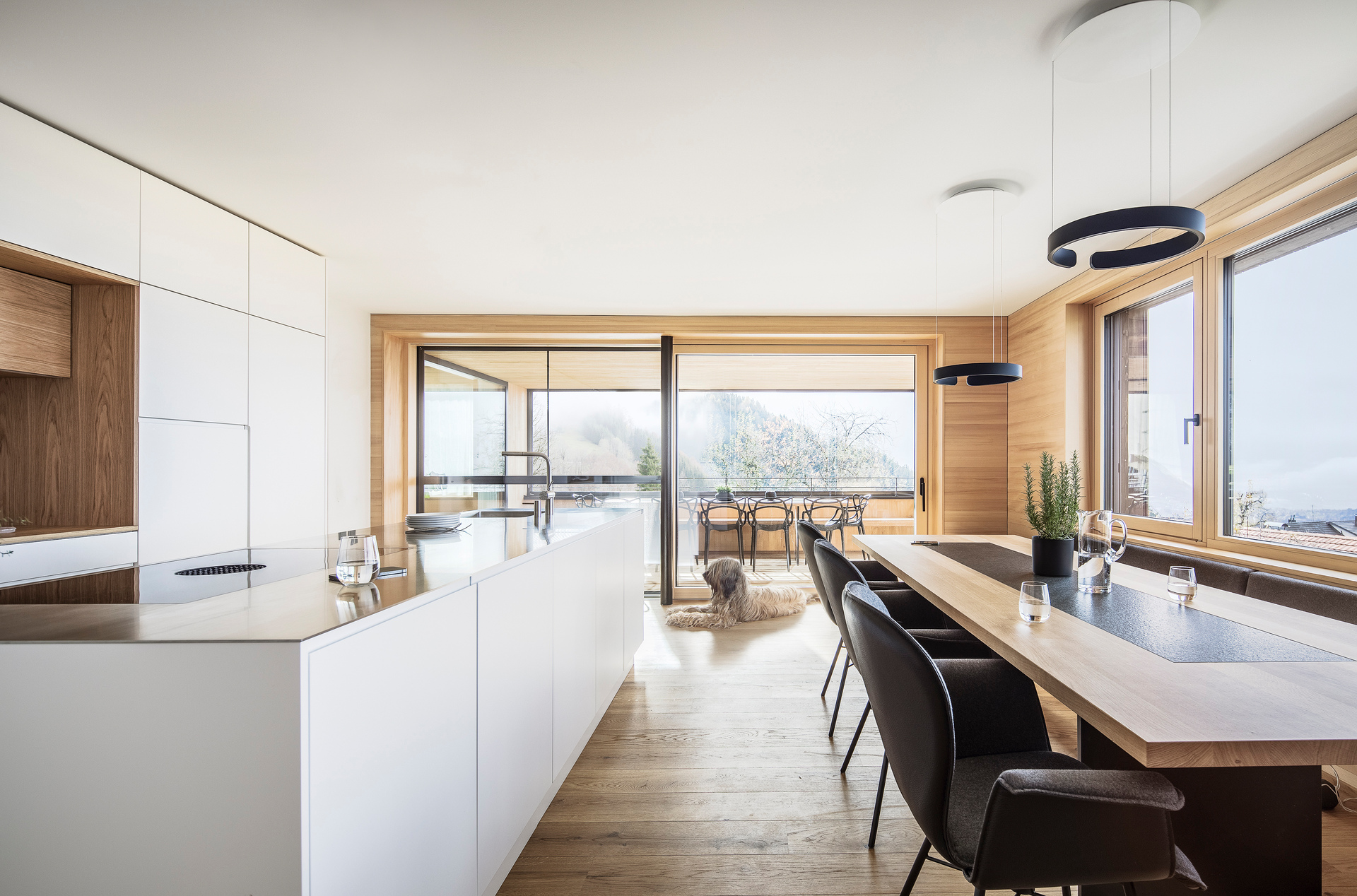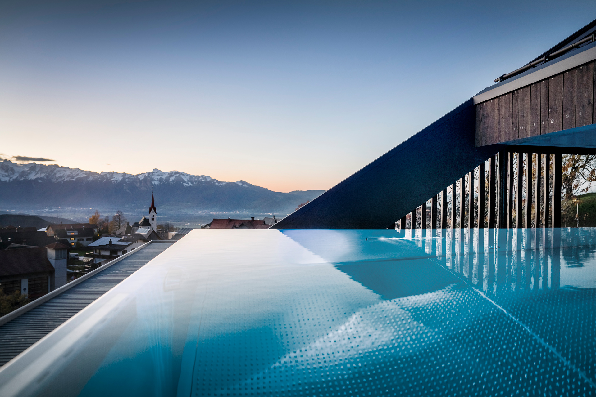 Der Bestand wurde thermisch saniert, die Fenster durch Passivhausfenster in Holz ersetzt. Eine schwarze, stehende Holzfassade bettet die großzügige Kubatur stimmig ihre Umgebung ein. Die Innenräume sind mit Weißtannentäfer, Lehmoberflächen und Holzböden gestaltet. Das Haus wird mit einer Wärmepumpe, Erdsonde und Photovoltaik-Anlage über den Fußboden beheizt. Das Haus Matino beweist, dass sich bestehende Strukturen, moderne Technik, sowie ein traditionelles Verständnis von Handwerkskunst verbinden lassen. Die eingesetzten Materialien vermitteln Behaglichkeit, geschickt geschnittene Räume und Blickachsen in die Natur schaffen hohe Wohnqualität. Absolutes Highlight: Der Dachpool mit Infinity-Blick auf die umgebende Bergwelt. Dieser geglückte Aus- und Umbau zeigt, dass sich Bestand sehr gut langfristig und nachhaltig aufwerten lässt. (Text: Isabella Marboe, nach einem Text der Architekten)