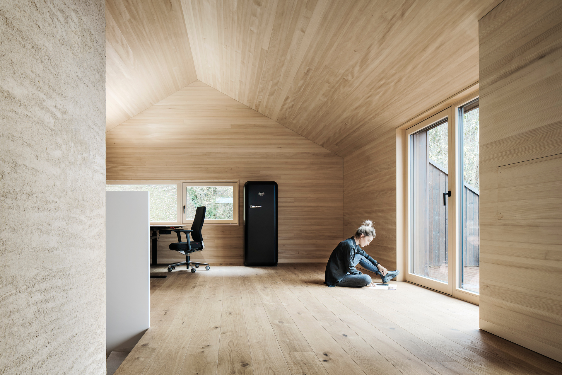 Die Mutter bewohnt nun im Erdgeschoss eine barrierefrei und separat zugängliche Einliegerwohnung. Darüber lebt das junge Paar mit seinen drei Kindern im Obergeschoss. Die großzügige Familienwohnung besteht aus einer Wohnküche mit einer großen gedeckten Terrasse und einem Schlaftrakt für die Eltern und die zwei kleineren Kinder. Die größere Tochter im Teenageralter hat unweit der Stiege ihr kleines eigenes Refugium im Wohnungsverband. Das Dachgeschoss ist ein multifunktionelles Studio für Homeoffice, Wellness- und Ruhebereich. Alle Terrassen und Außenbereiche sind bewusst unterschiedlich ausgerichtet, um die Privatsphäre für jeden zu wahren. Dadurch sind die Bereiche klar Trennung getrennt, was auf für eine etwaige künftige Vermietung von Vorteil ist.