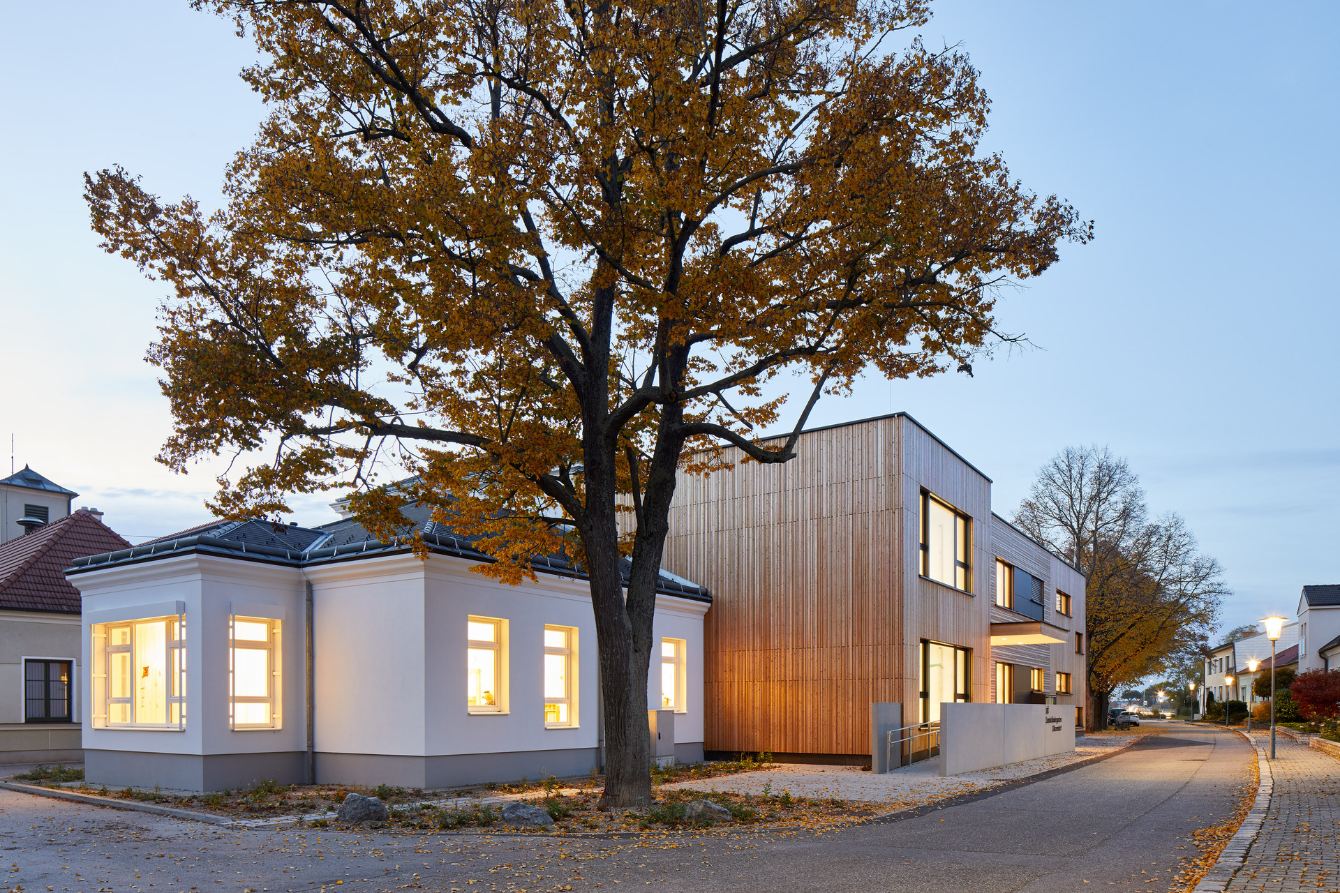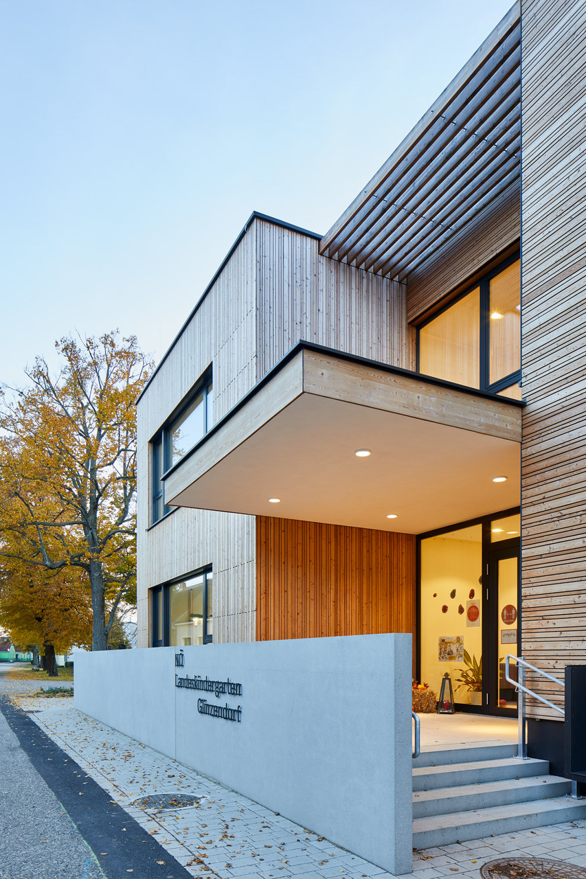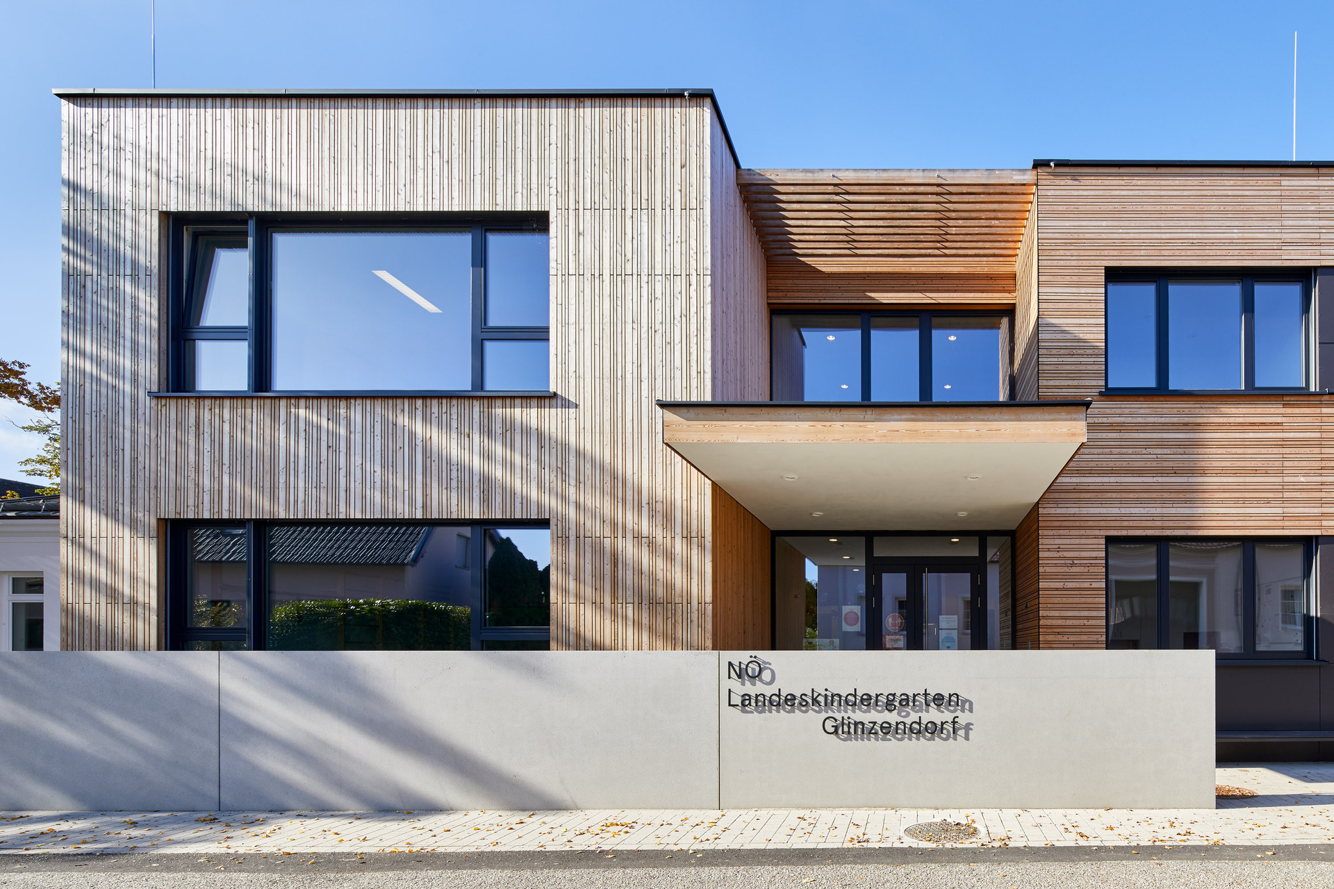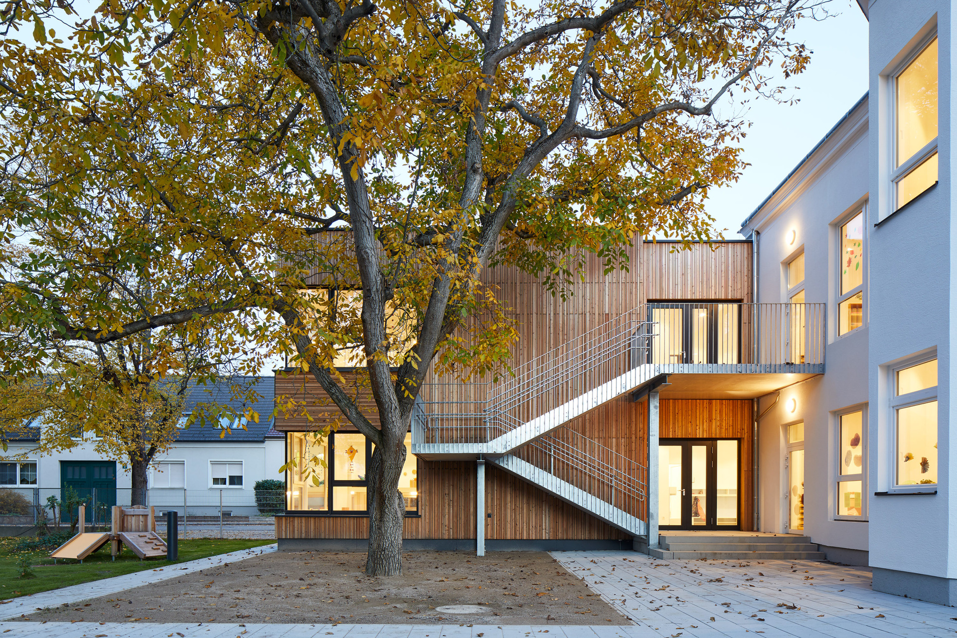 Das Grundkonzept sieht eine klare Trennung von Alt- und Neubau vor: Das Bestandgebäude blieb erhalten, das neue Gebäude mit den zusätzlichen Räumen und dem neuen Haupteingang wurde in Holzbauweise daneben gestellt, ein zweigeschoßiger, durch den neuen Eingang des Kindergartens gegliederter Baukörper an der Ostseite des Bestandes. Je Geschoß verbindet ein großer Durchbruch den Zubau mit dem Bestand und verknüpft die vorhandene Erschließung mit dem neuen hellen Eingangsbereich im EG und dem multifunktionalen Gangbereich im OG.