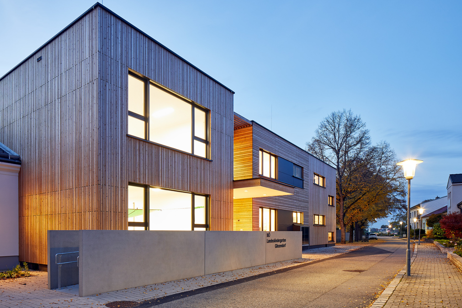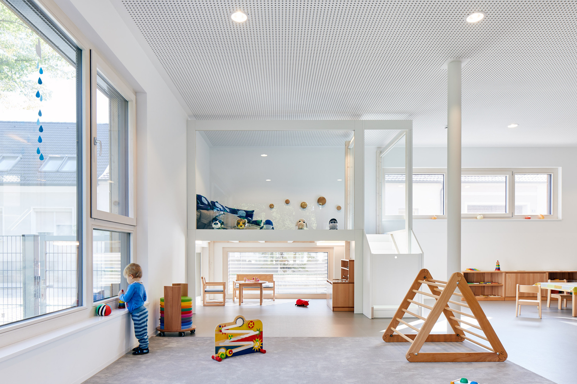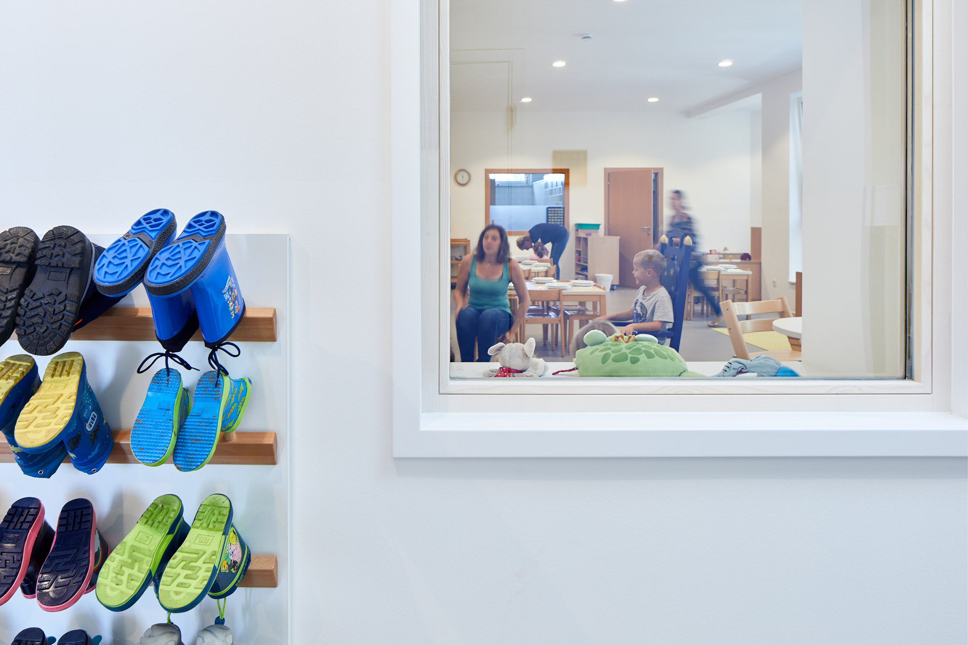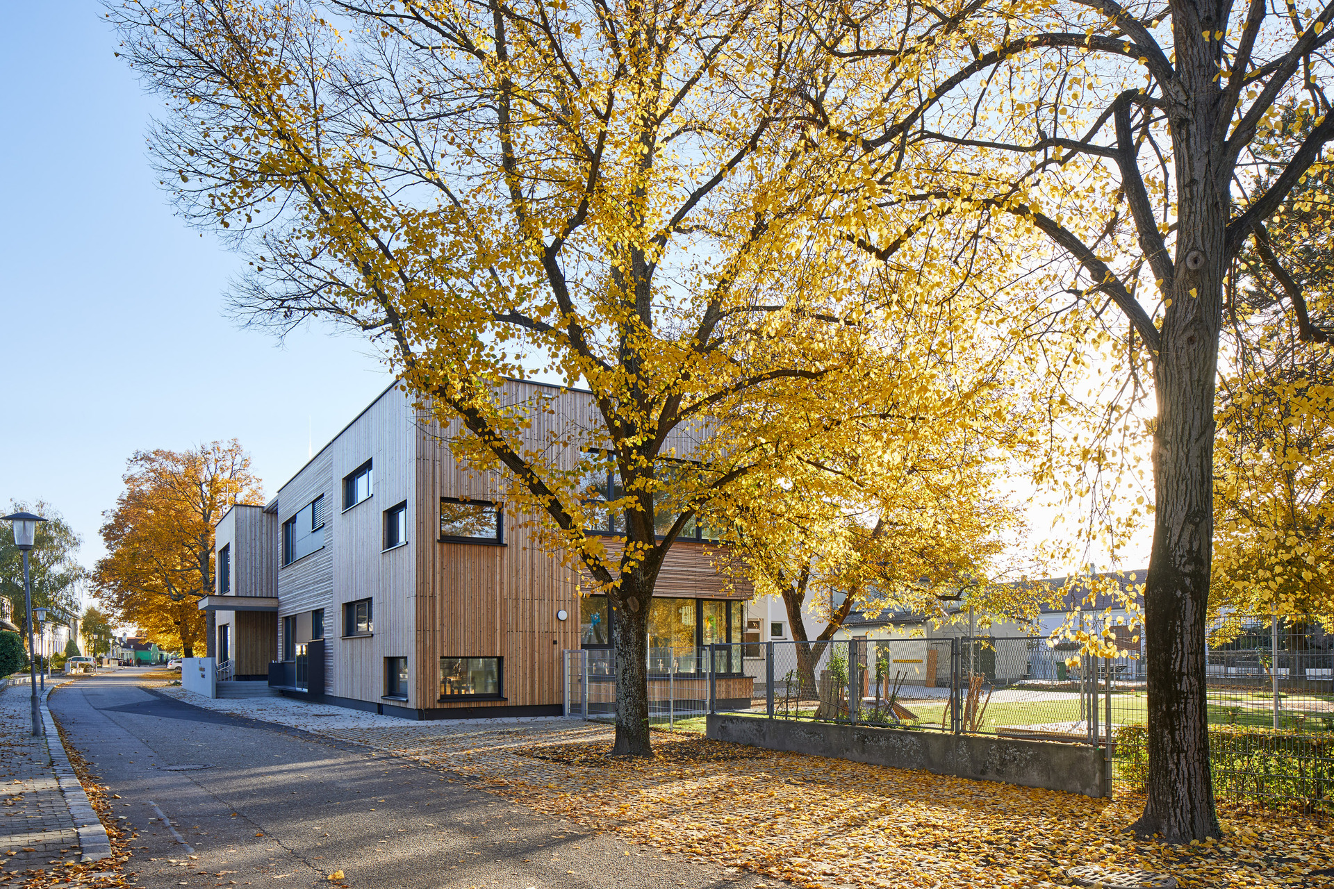 Um eine kurze Bauzeit bei laufendem Betrieb (eine Gruppe verbleibt im Kindergarten) zu ermöglichen, wurde das Projekt in Holzbauweise umgesetzt. Die Holzdecken sind Massivdecken aus Brettschichtholz, die großen Spannweiten der Gruppen- und Bewegungsräume wurden mit einem in die Decke integrierten Stahlträger überspannt (kein sichtbarer Unterzug), die großen Fensteröffnungen mit einem Brettschichtträger.