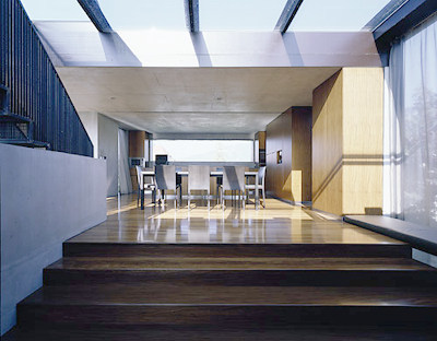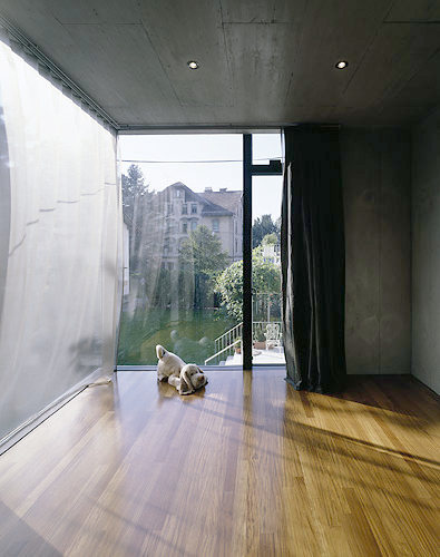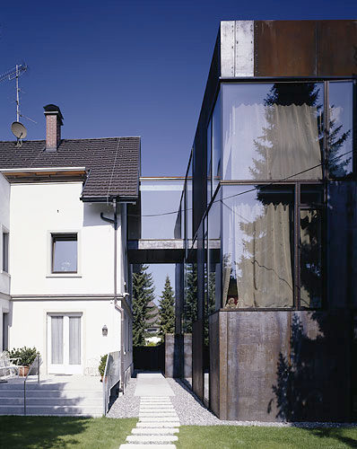 In dem stählernen Kubus verbirgt sich ein Splitlevel, der mit einer überhohen, repräsentativen Eingangshalle beginnt, diesen Versatz durch das gesamte Gebäude schiebt und oben in der brüstungshohen Einfassung einer Dachterrasse endet. Die Raumhöhen verkürzen sich allerdings nach oben hin und die betonte Höhe von 3,15 m im Eingang und 2,90 m in den Zimmern verkehrt sich im Wohnbereich mit seinen 2,30 m zu einer auffallend flachen Proportion, die sich durch die offene Raumfolge von Wohnzimmer, Wohnküche und Verbindungssteg zu einer horizontalen Grosszügigkeit entwickelt. Die präzis gesetzten Gebäudeöffnungen holen den umgebenden Baumbestand und einzelne Ausblicke wie Bilder ins Innere, umgehen aber geschickt den direkten Kontakt mit den dicht angrenzenden Nachbargebäuden. Die Ausrichtung des Wohnens nach oben entspricht einem Lebensgefühl, trifft sich aber auch mit der funktionellen Anbindung an das ausgebaute Dachgeschoß, das - jetzt nur mehr grosszügige Reservefläche - viel Raum für zukünftige Veränderungen lässt.