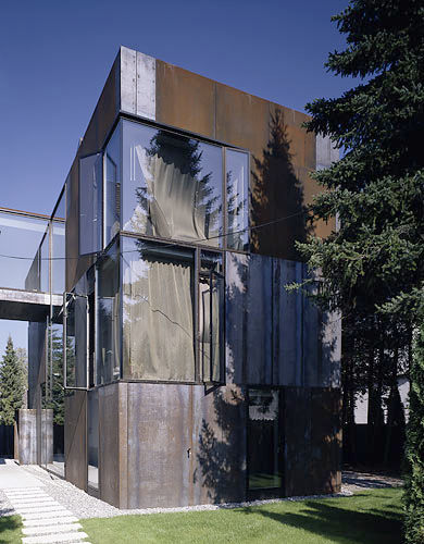 Die Oberflächen des Hauses in der Plattenstrasse sind tatsächlich echte „Rückseiten“, denn der 4mm dicke Stahl wurde mit keiner künstlichen Rostpatina versehen, sondern zeigt fürs erste noch deutlich die fleckigen Montagespuren, Kratzer und das ölige Schimmern an den rückseitigen Schweißstellen. Doch steht dahinter, wie bei einer Reihe anderer Ungewöhnlichkeiten die Logik neu gedachter Lösungen.