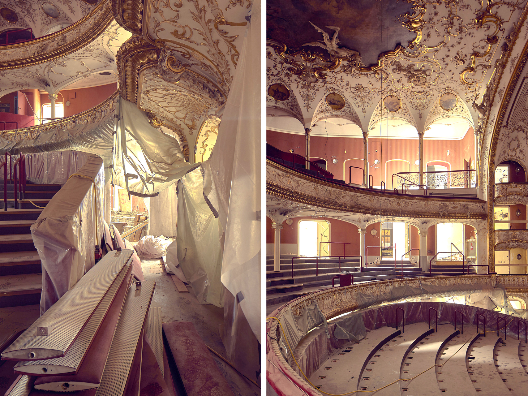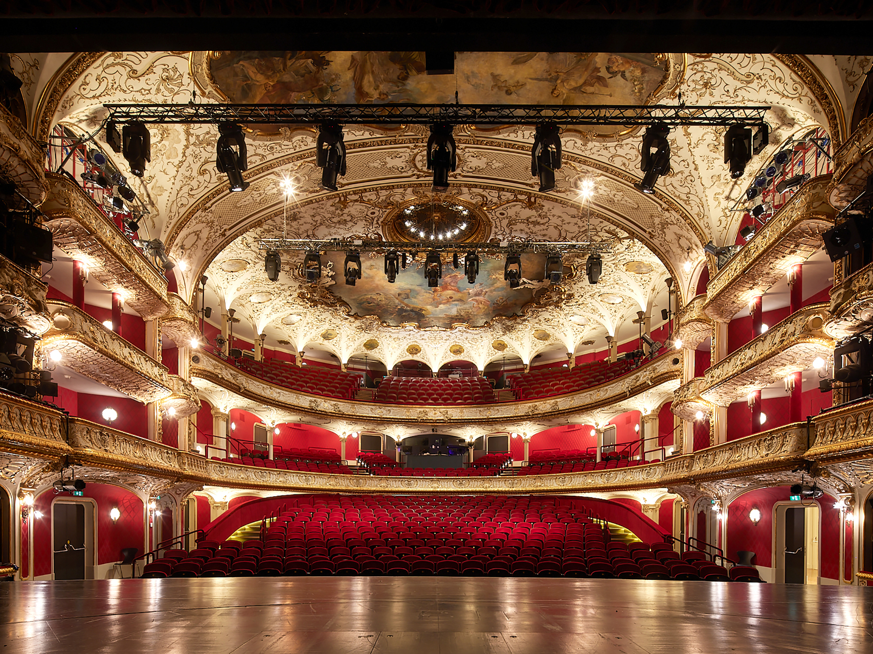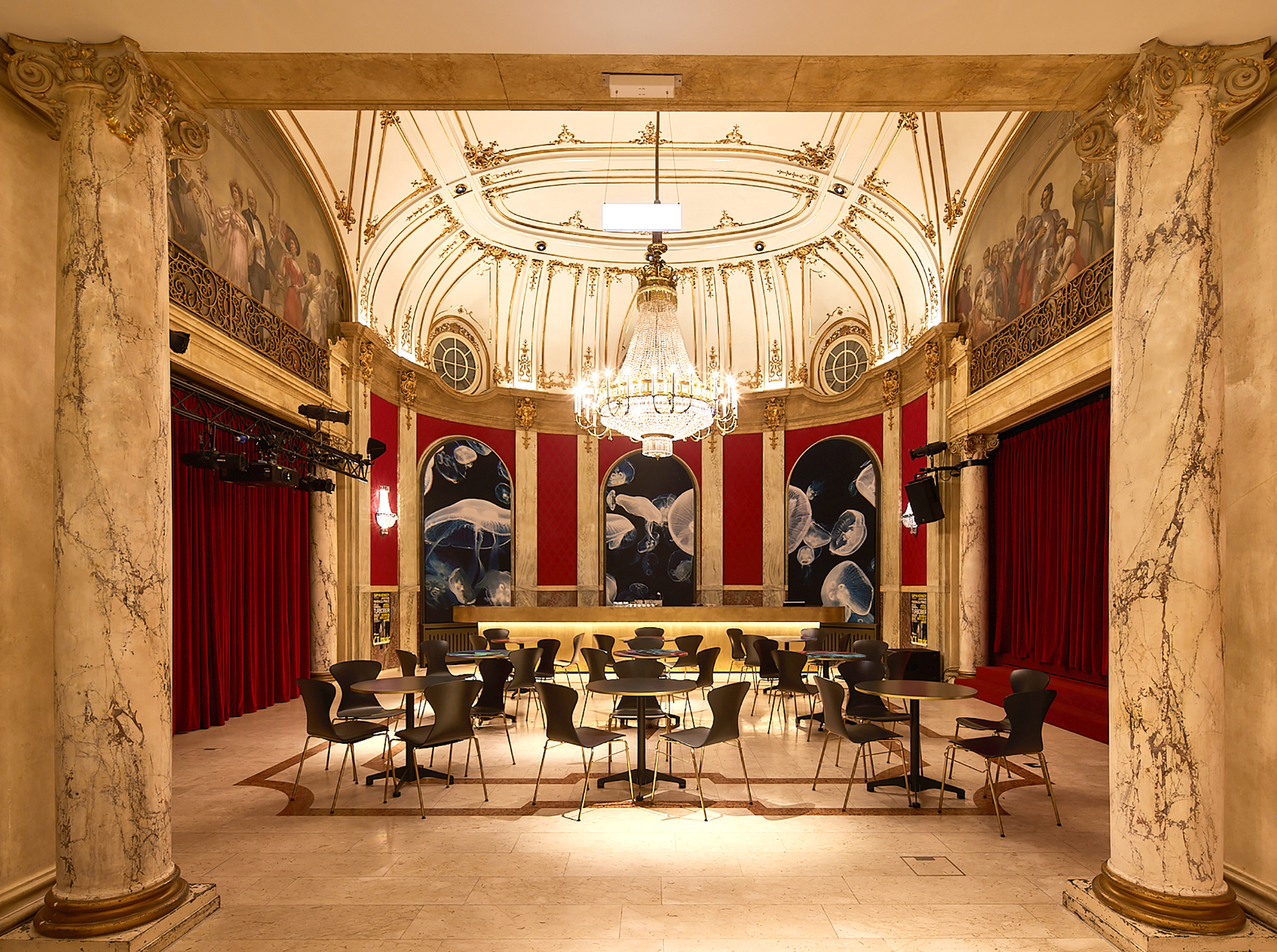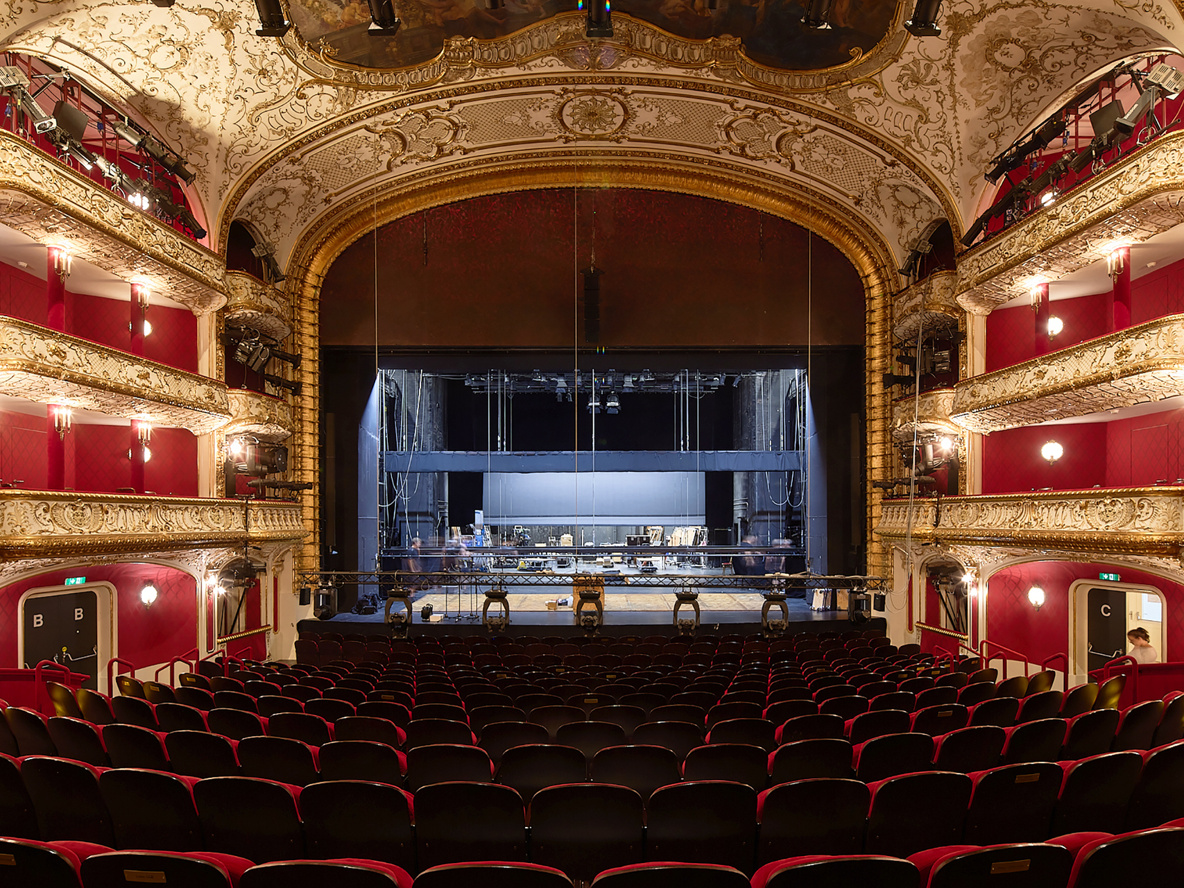 Theatersaal, Garderoben, Fluchttreppenhäuser und Rote Bar wurden jeweils als eigene Brandabschnitte ausgebildet, die Saaltüren erneuert und zwischen Garderoben- und Foyerflächen zusätzliche Brandschutzportale eingebaut.