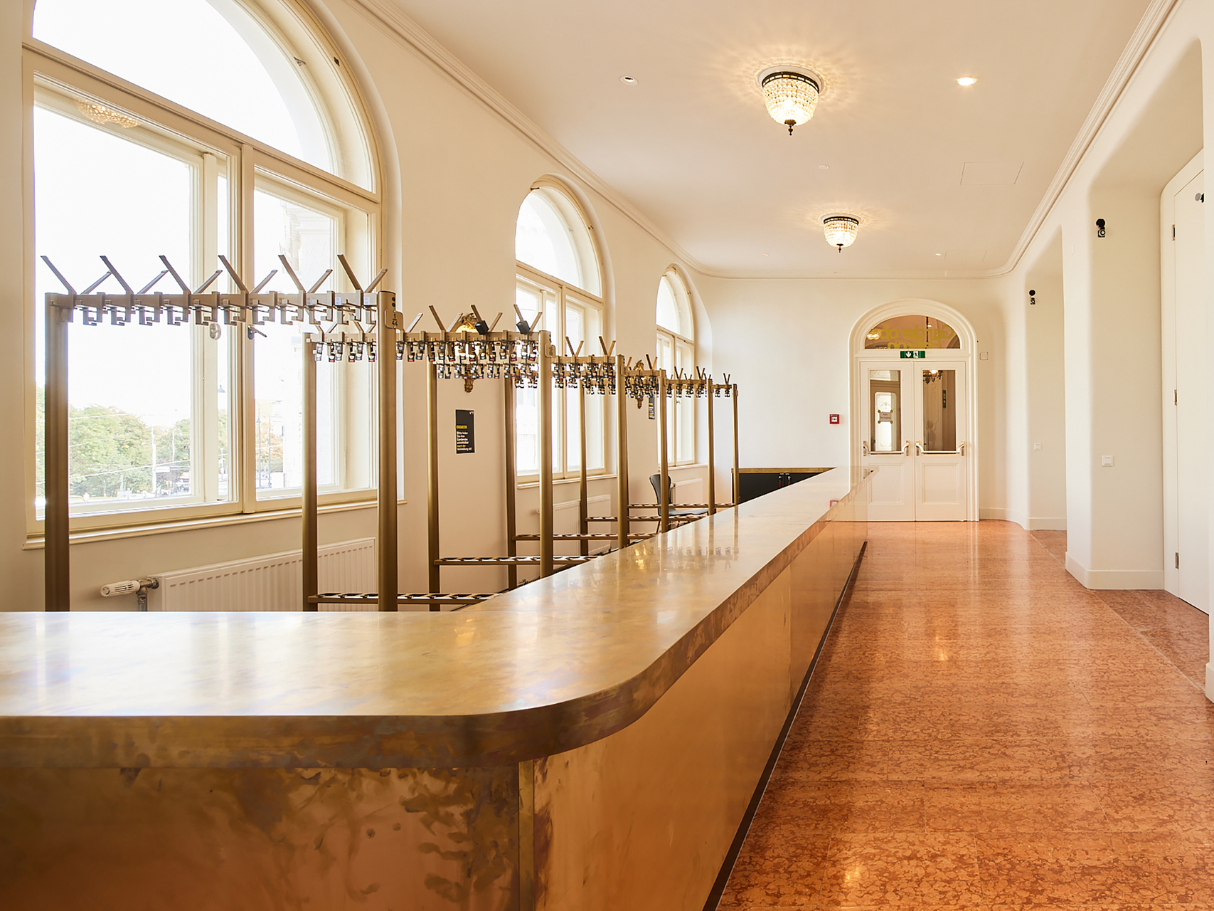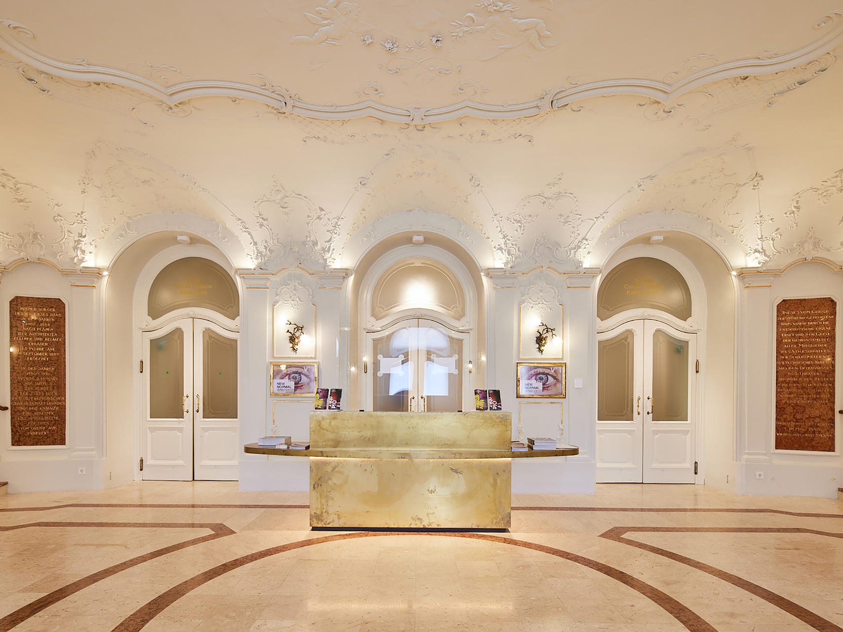 Die Abendkasse wurde ins Vestibül verlegt, im Parterre gibt es nun eine neue Zentralgarderobe, und die Tageskasse rutschte an die Seite zur Neustiftgasse hin. Wo sich früher Kartenbüro, Garderobe und Durchfahrt befanden, bietet nun ein großzügiges Foyer mit Café ein einladendes Entrée und entlastet den Haupteingang. Die zuvor verbauten Ausgänge zu den Arkaden hin wurden – ganz im Sinne eines offenen Hauses – freigelegt.
