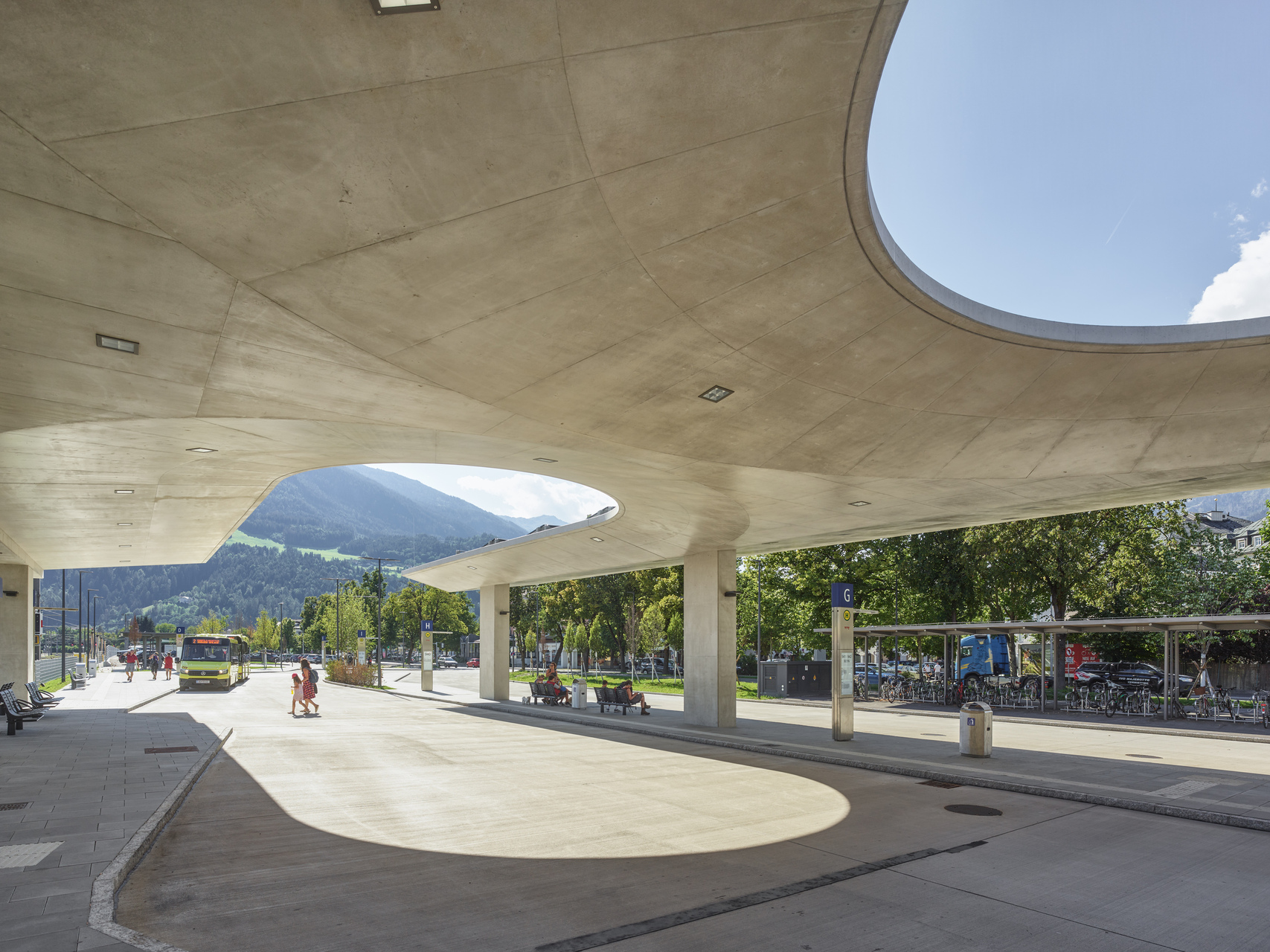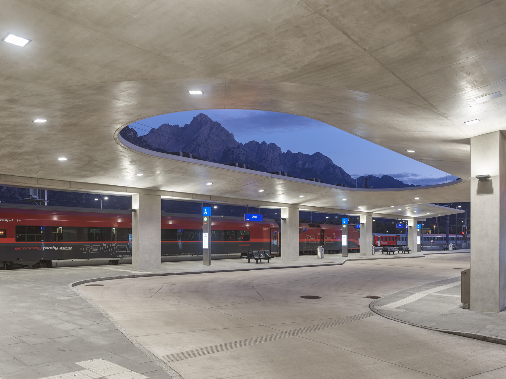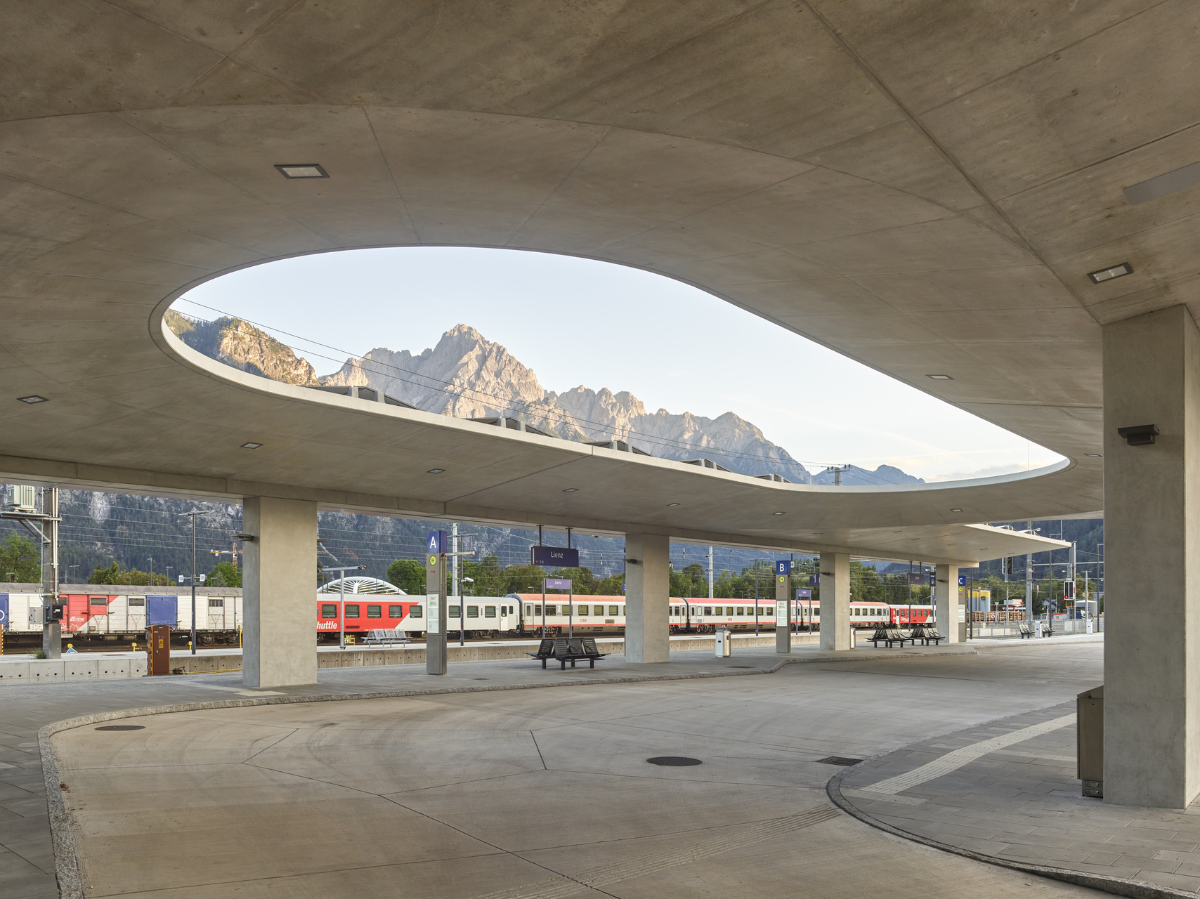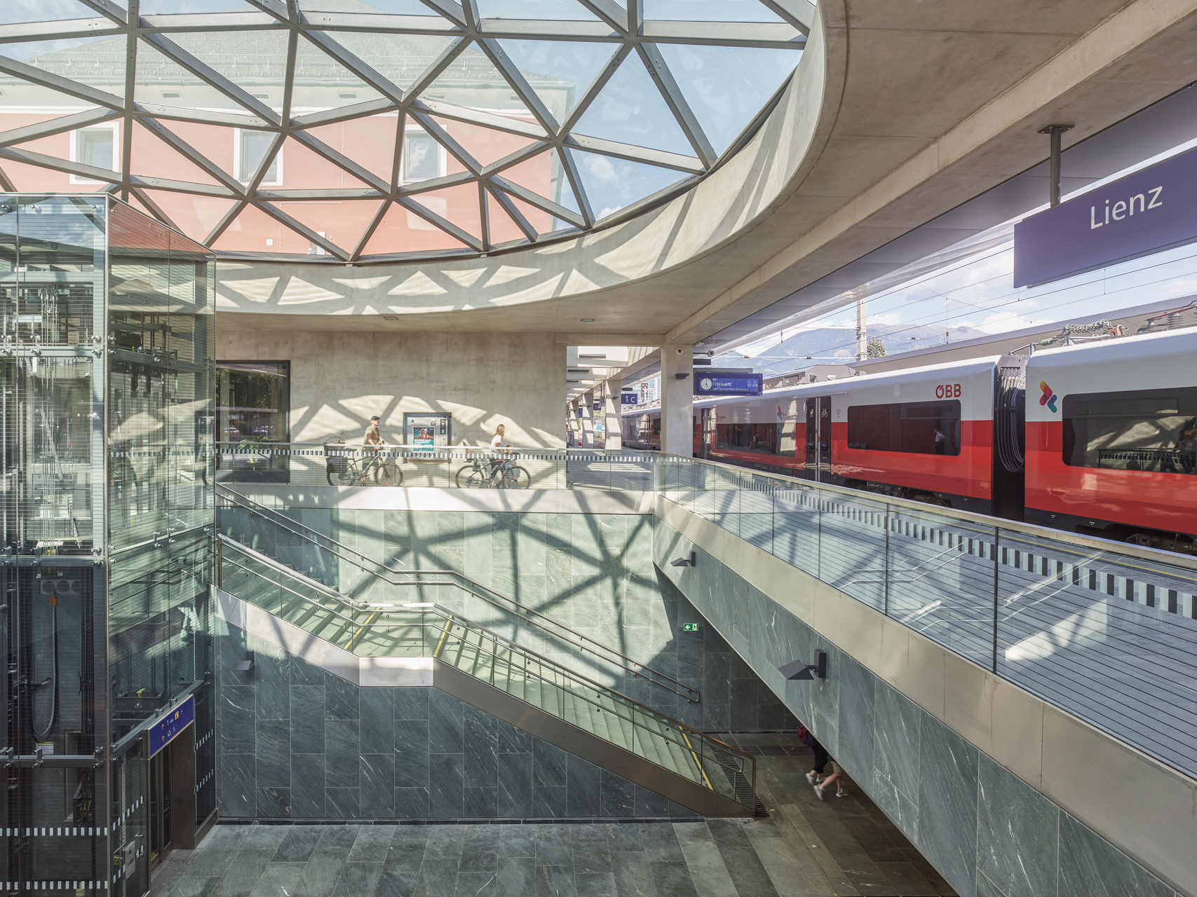 Herzstück des neuen urbanen Gelenks ist ein zentrales Atrium, eine offene, von einer gewölbten Glaskuppel belichtete Halle, von der aus die Bahnsteige barrierefrei erschlossen werden und durch die eine großzügig dimensionierte Unterführung durchführt. Diese bietet nun Fußgänger:innen und Radfahrer:innen eine direkte Verbindung zwischen den Quartieren im Süden der Stadt und dem historischen Stadtkern und integriert den touristisch bedeutenden Drauradweg. Angrenzend an das Atrium entstand ein Busterminal, das von einer Betonkonstruktion in Form von zwei freitragenden Schalen mit konisch geneigten Untersichten und markanten Öffnungen überdacht wird und an das sich ein zusätzlicher Bahnsteig anschließt. Der historische Bestandsbau wurde revitalisiert und beherbergt das ÖBB-Kundenzentrum, Toiletten und ein Restaurant sowie Diensträumen im ersten Obergeschoß. Direkt neben dem Bahnhofsgebäude wurde ein Erweiterungsbau errichtet, in dem sich ein Supermarkt befindet. Verbindendes Element dieser Sequenz baulicher Elemente zwischen Busterminal und Supermarkt stellt der helle Beton dar, der sich beginnend mit der Überdachung des Busterminals über dem Atrium und den beidseitig entlang des sanierten Hauptgebäudes verlaufenden Vordächern fortsetzt und in die Sichtbetonfassade des Erweiterungsbaus mündet. (Text: Claudia Wedekind, nach einem Text der Architekt:innen)
