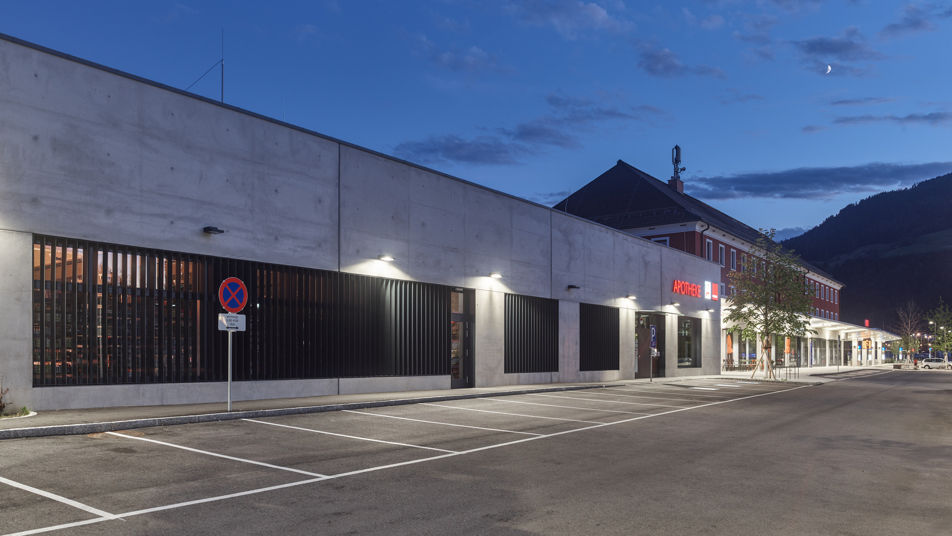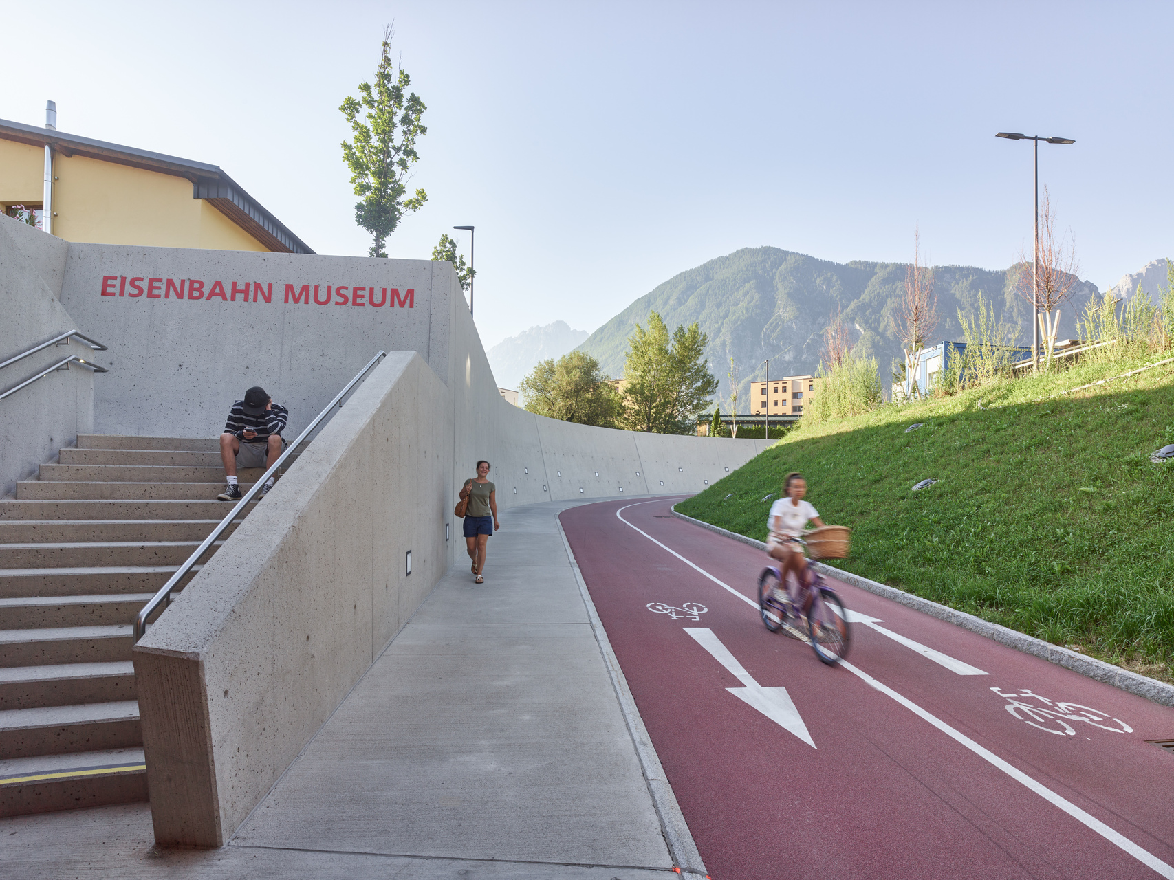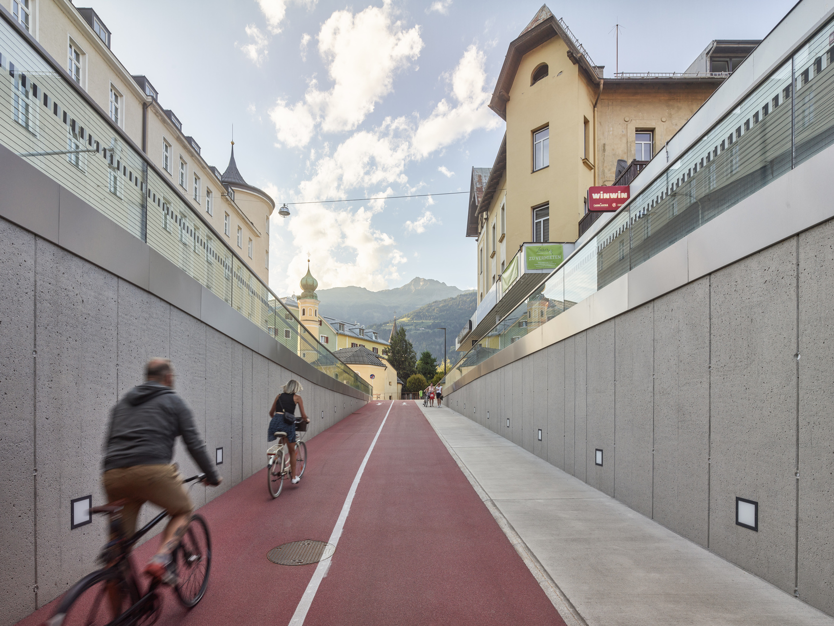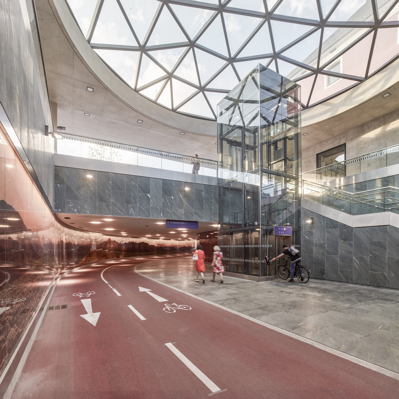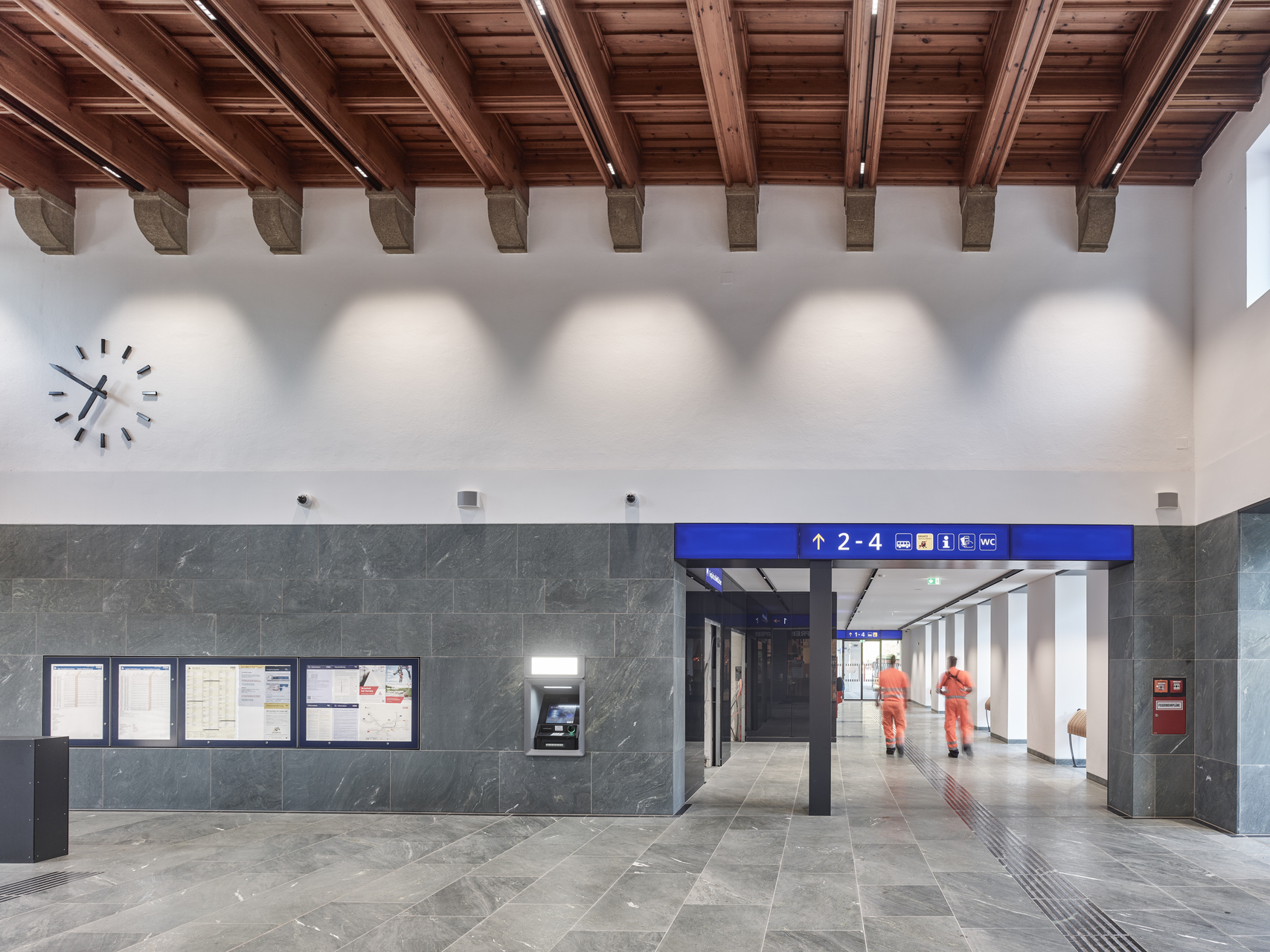 Herzstück des neuen urbanen Gelenks ist ein zentrales Atrium, eine offene, von einer gewölbten Glaskuppel belichtete Halle, von der aus die Bahnsteige barrierefrei erschlossen werden und durch die eine großzügig dimensionierte Unterführung durchführt. Diese bietet nun Fußgänger:innen und Radfahrer:innen eine direkte Verbindung zwischen den Quartieren im Süden der Stadt und dem historischen Stadtkern und integriert den touristisch bedeutenden Drauradweg. Angrenzend an das Atrium entstand ein Busterminal, das von einer Betonkonstruktion in Form von zwei freitragenden Schalen mit konisch geneigten Untersichten und markanten Öffnungen überdacht wird und an das sich ein zusätzlicher Bahnsteig anschließt. Der historische Bestandsbau wurde revitalisiert und beherbergt das ÖBB-Kundenzentrum, Toiletten und ein Restaurant sowie Diensträumen im ersten Obergeschoß. Direkt neben dem Bahnhofsgebäude wurde ein Erweiterungsbau errichtet, in dem sich ein Supermarkt befindet. Verbindendes Element dieser Sequenz baulicher Elemente zwischen Busterminal und Supermarkt stellt der helle Beton dar, der sich beginnend mit der Überdachung des Busterminals über dem Atrium und den beidseitig entlang des sanierten Hauptgebäudes verlaufenden Vordächern fortsetzt und in die Sichtbetonfassade des Erweiterungsbaus mündet. (Text: Claudia Wedekind, nach einem Text der Architekt:innen)