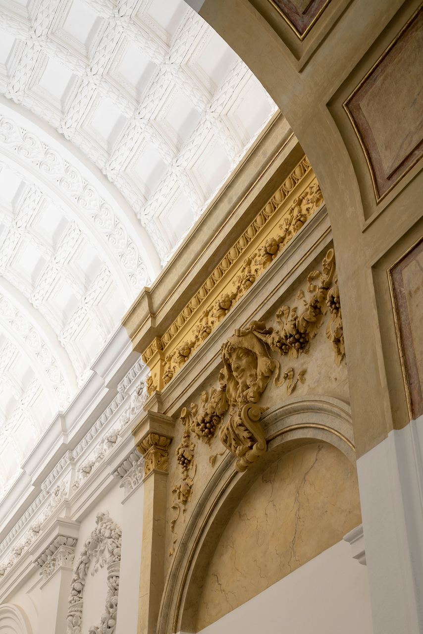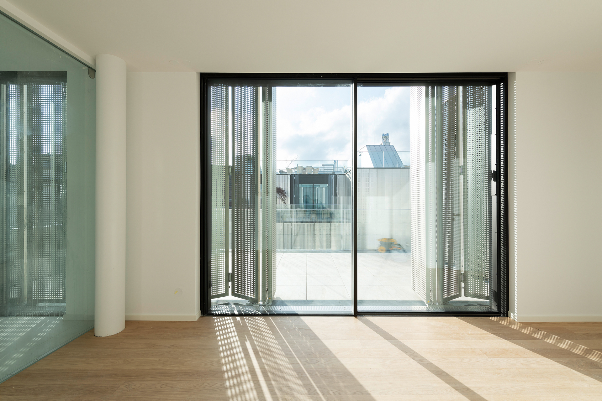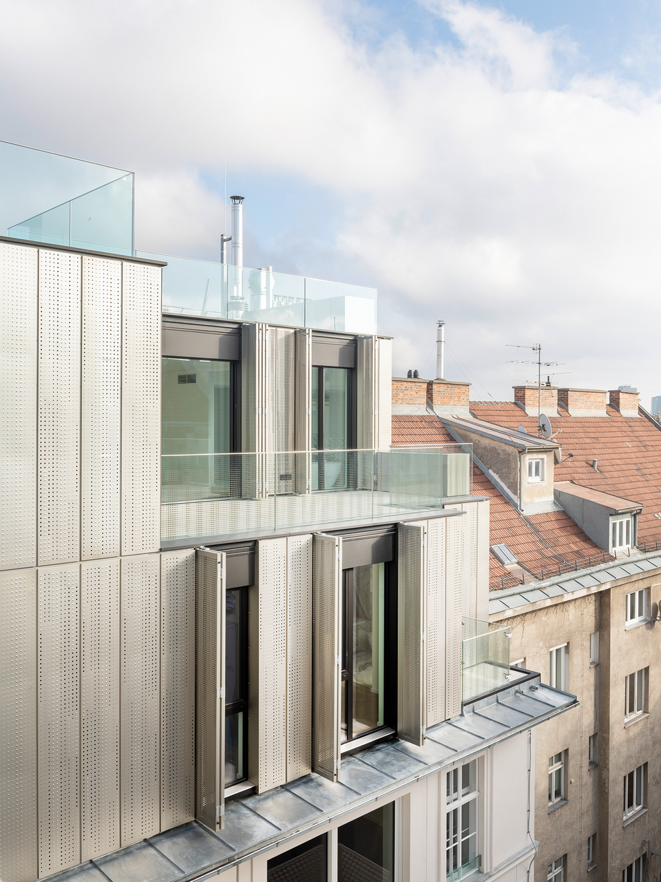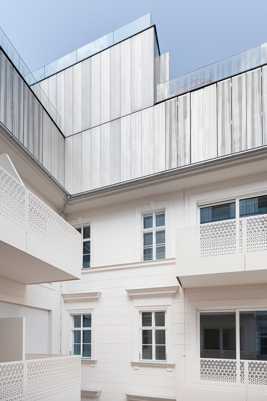 Hofseitig zeigt das Gebäude mit gestaffelter Kubatur, großzügigen Terrassen und Balkonen sein zeitgenössisches Gesicht. Dabei fügt sich das neue Dach unaufgeregt in eine Nebenrolle, wenn auch eine glamouröse, umhüllt von einem metallischen, fein perforierten Fassadenkleid mit verschieblichen Elementen. Die Themen hohe Transparenz in den Wohnungen mit Ausblicken, aber ohne Einsicht und mit individuell steuerbarer Privatheit prägen auch die neuen Balkone der unteren Geschosse, in deren Brüstungen aus massiven Stahlplatten Formen geschnitten sind, die an Spitzenstickereien erinnern.