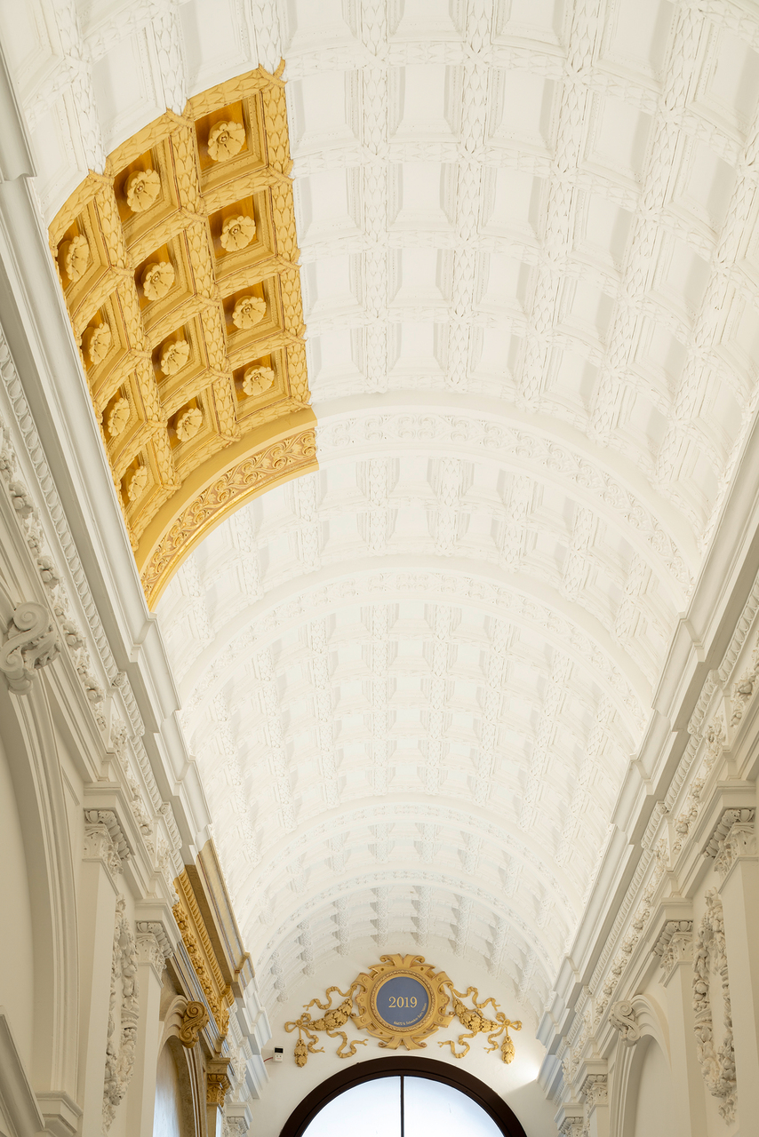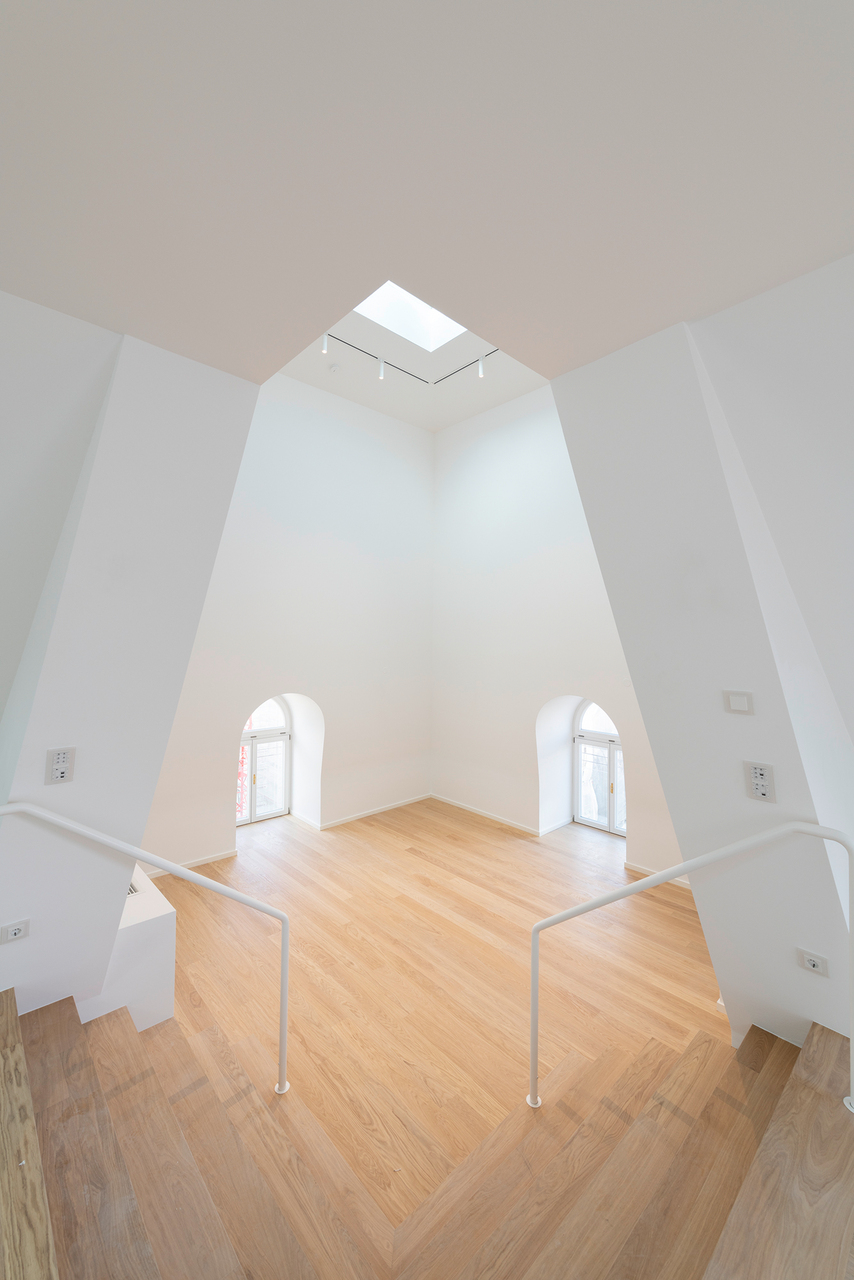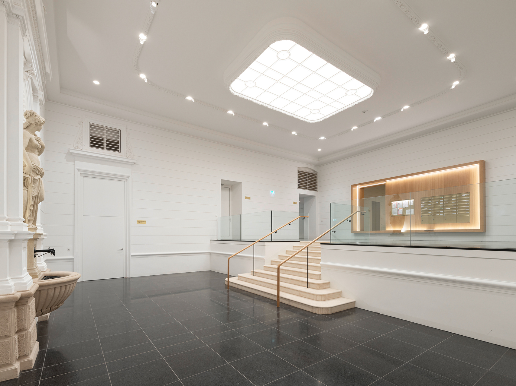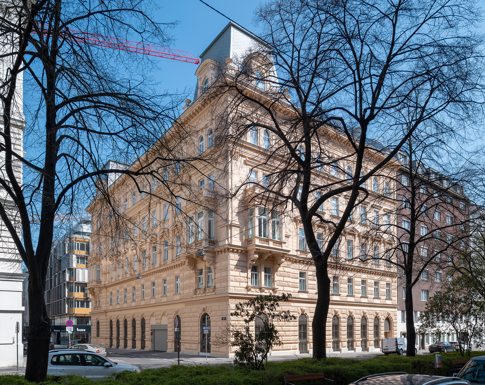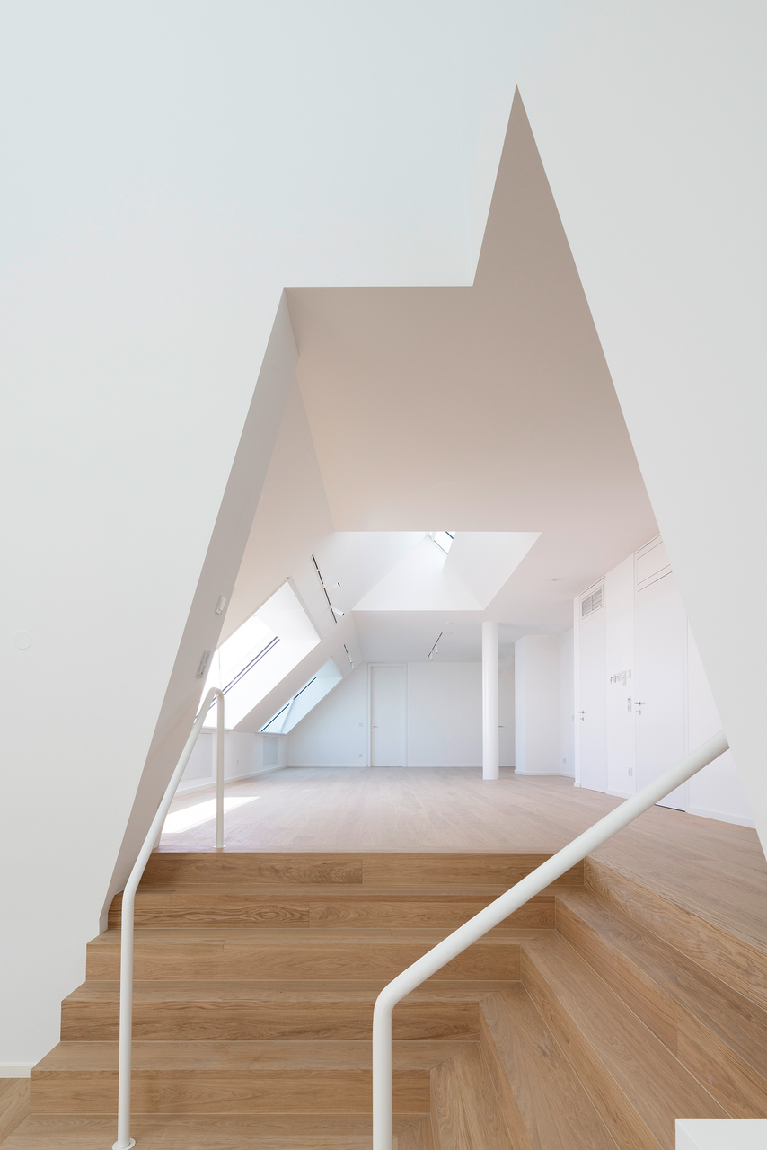 Bei der technisch notwendigen Erneuerung der Geschossdecke über dem 4. OG konnte diese geringfügig abgesenkt und dadurch innerhalb der bestehenden Dachkubatur ein zusätzliches Vollgeschoss geschaffen werden – eine Art „Zaubergeschoss“ mit straßenseitig vorgelagerten Terrassen, die, hinter dem ausladenden Traufgesims versteckt, großzügige Panoramablicke bieten.