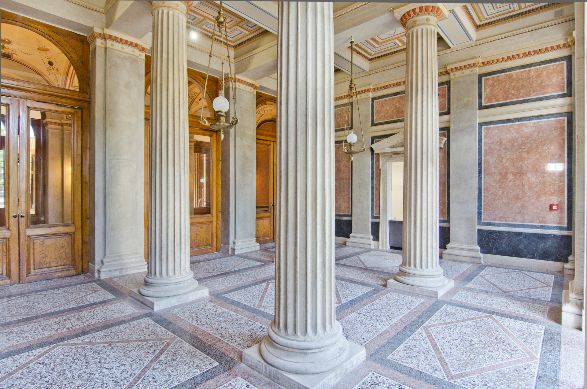 Sanierungen denkmalgeschützter Bauten stellen hohe Kommunikationsanforderungen an die Generalplaner:innen und scheinbar bleiben deren Eingriffe unsichtbar. Ja, es zählt zu den Herausforderungen, die technischen Neuanforderungen der Gegenwart möglichst unsichtbar zu machen. Dies betrifft etwa die enorm gestiegenen Brandschutzvorschriften, die den Einbau von Brandschutzwänden und -türen vorgeben. Auf Fachgutachten gestützt konnten die Architekt:innen die Brandschutztüren zu den Stiegenhaus-Aufgängen auf Rauchschürzen reduzieren, die im Ernstfall automatisch herabrollen, sodass die Halle als zusammenhängender Raum erlebbar bleibt.