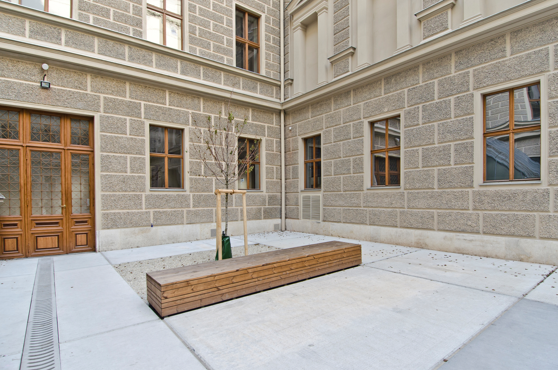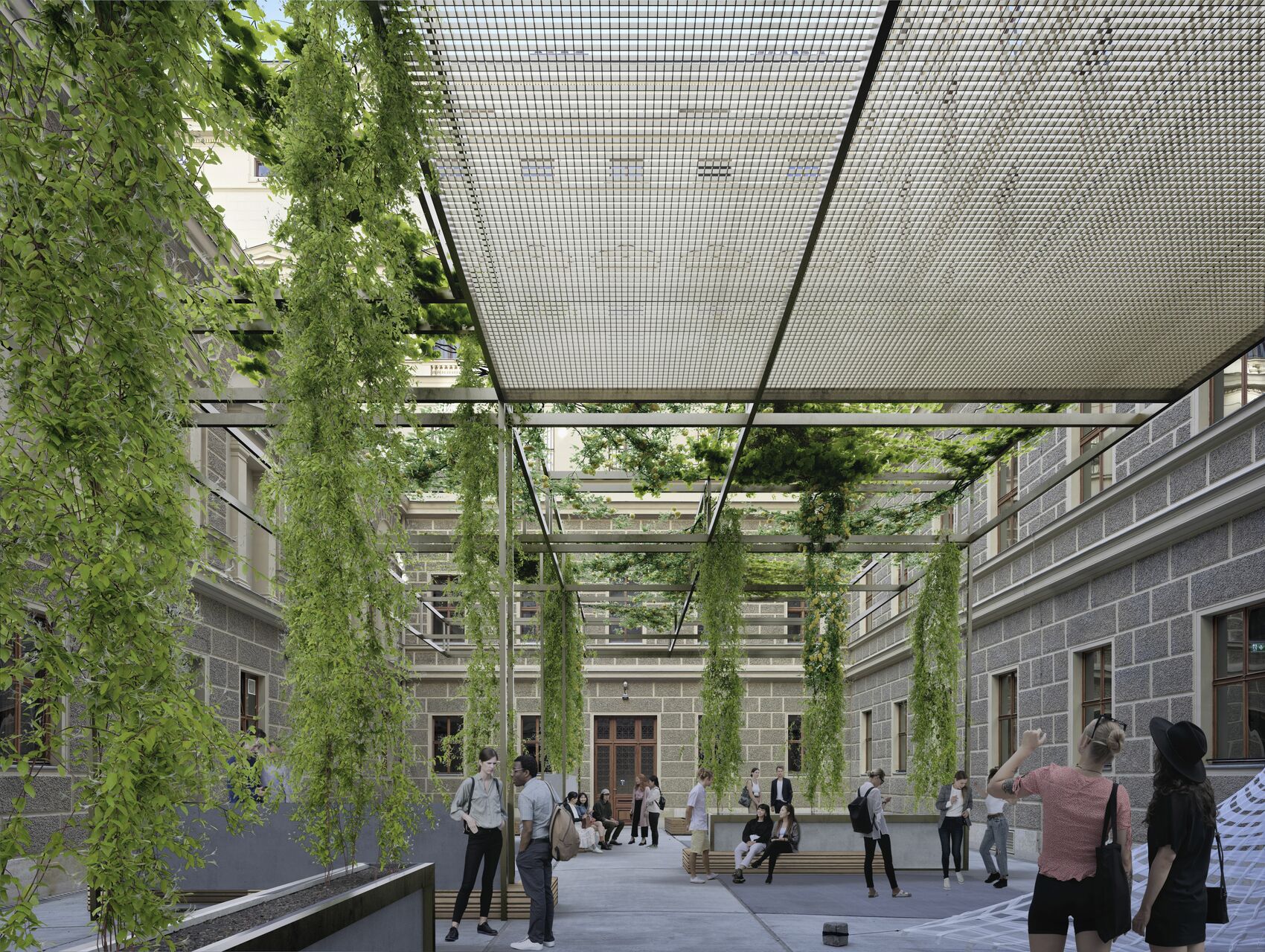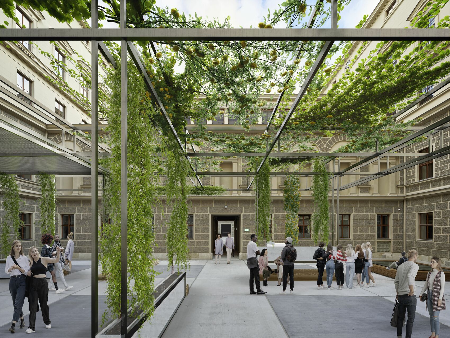 Eine weitere Anforderung der Ausschreibung waren Maßnahmen gegen die sommerliche Überhitzung. Die Architekt:innen planten eine Begrünung der Innenhöfe und Kühlung durch Wasserverdunstung (adiabate Kühlung) und Nachtlüftung. Dieses zukunftsweisende Low-Tech Konzept wurde jedoch in der Umsetzungsphase aus Kostengründen gestrichen. Dabei hält gerade die späte Ringstraßenperiode mit dem Belüftungssystem der Neuen Burg ein hervorragendes Beispiel für natürliche Kühlungssysteme parat.