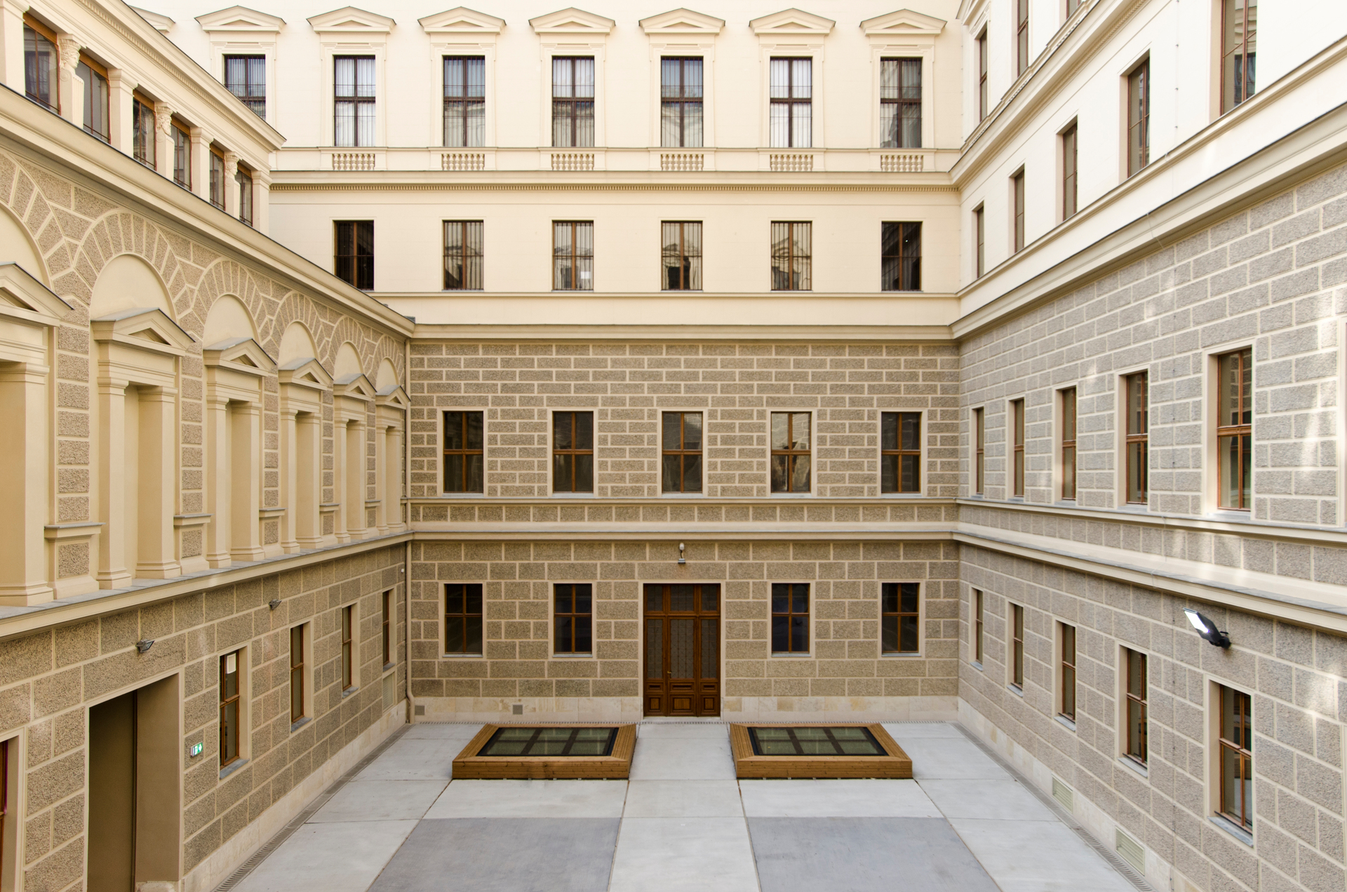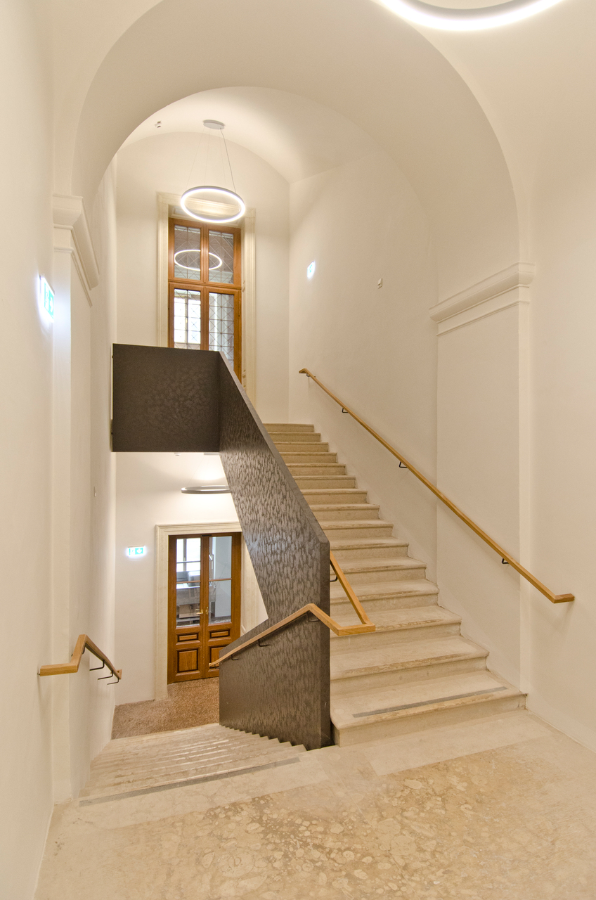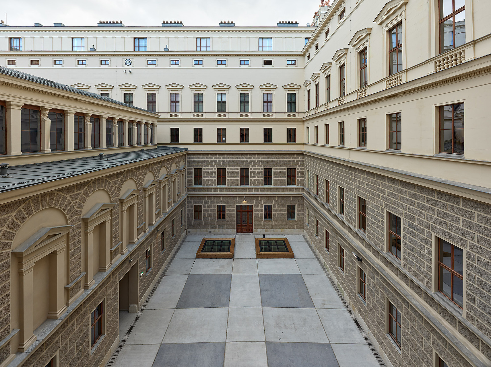 Eine Kernanforderung der Ausschreibung war die Erweiterung um ein Depot und einen Studiensaal für das Kupferstichkabinett. In diesen Bereichen kommt die zeitgenössische Architektursprache zur Wirkung, und die ist bereichernd für das historische Ambiente, ohne es zu stören. Das betrifft vor allem die Belichtung, die Form der Leuchtkörper und die Materialien – Stahl und Holz. Der Studiensaal erhält über Oberlichten in einem der beiden Innenhöfe natürliches Licht. Die Oberlichten wurden im Hof als Sitzbänke ausgebildet. Zur Wirkung kommen die zeitgenössischen Materialien auch im neuen barrierefreien Zugang an der Makartgasse.