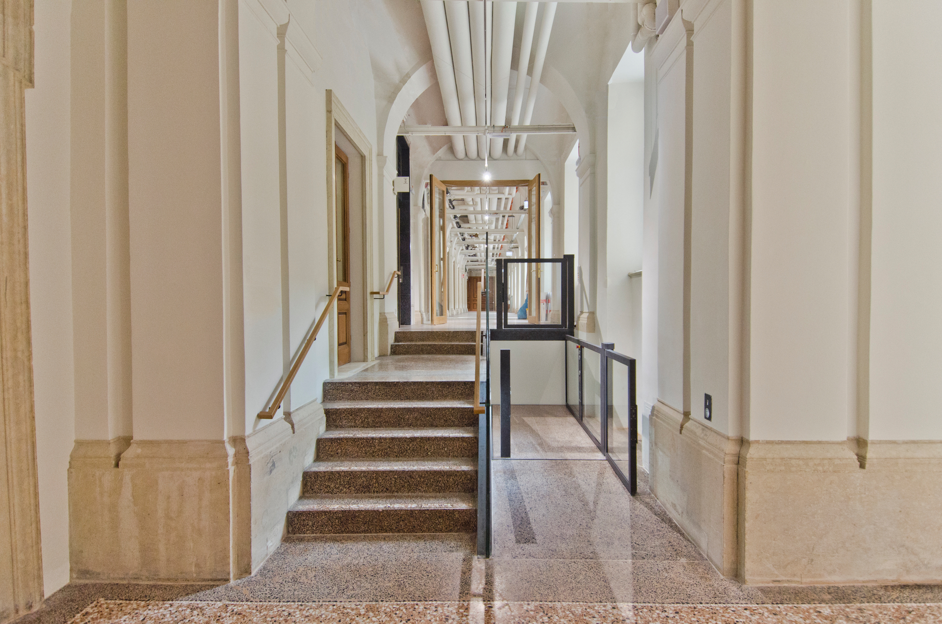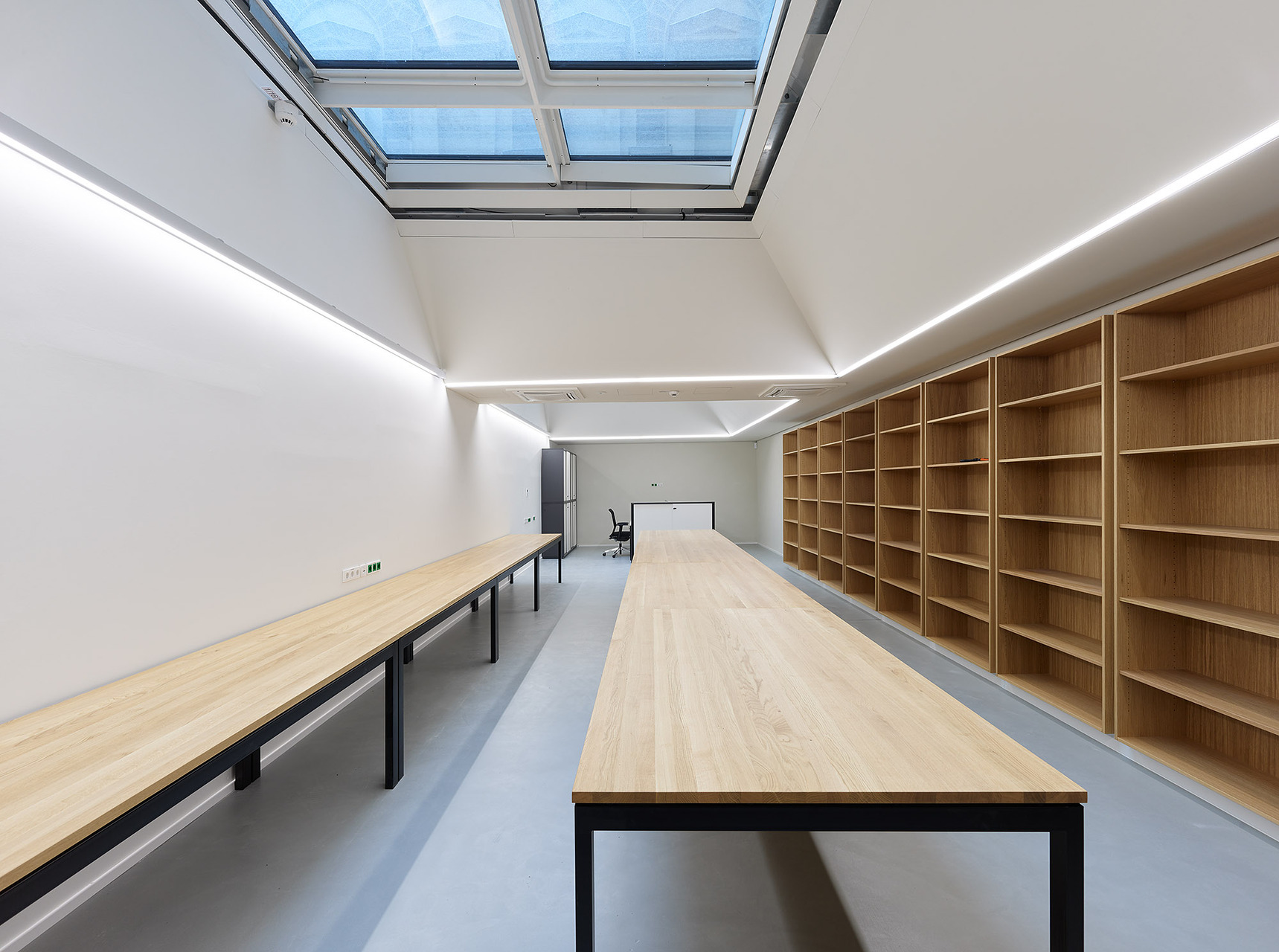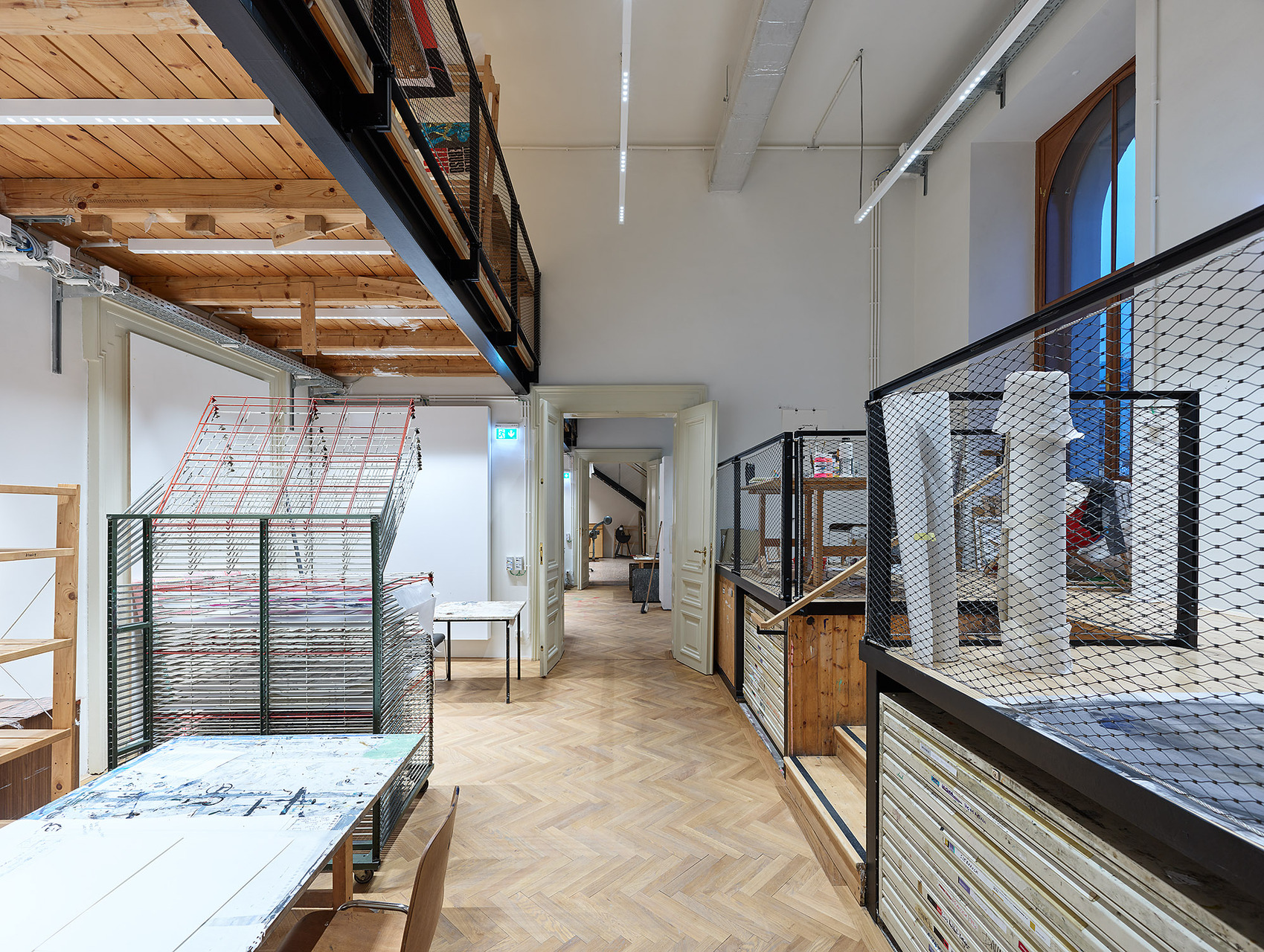 Eine Kernanforderung der Ausschreibung war die Erweiterung um ein Depot und einen Studiensaal für das Kupferstichkabinett. In diesen Bereichen kommt die zeitgenössische Architektursprache zur Wirkung, und die ist bereichernd für das historische Ambiente, ohne es zu stören. Das betrifft vor allem die Belichtung, die Form der Leuchtkörper und die Materialien – Stahl und Holz. Der Studiensaal erhält über Oberlichten in einem der beiden Innenhöfe natürliches Licht. Die Oberlichten wurden im Hof als Sitzbänke ausgebildet. Zur Wirkung kommen die zeitgenössischen Materialien auch im neuen barrierefreien Zugang an der Makartgasse.