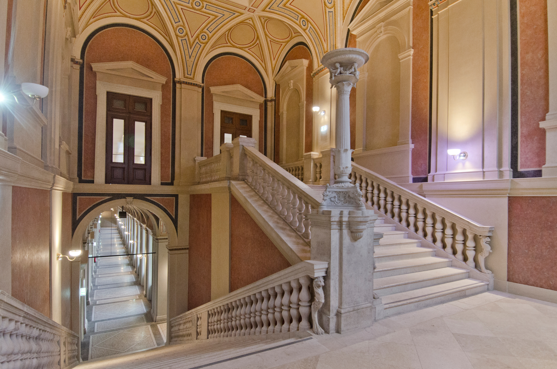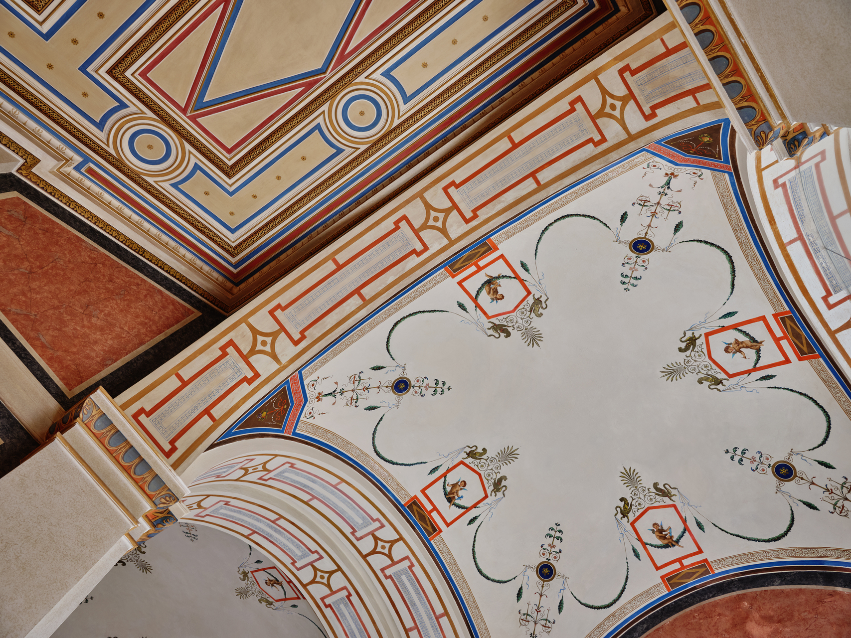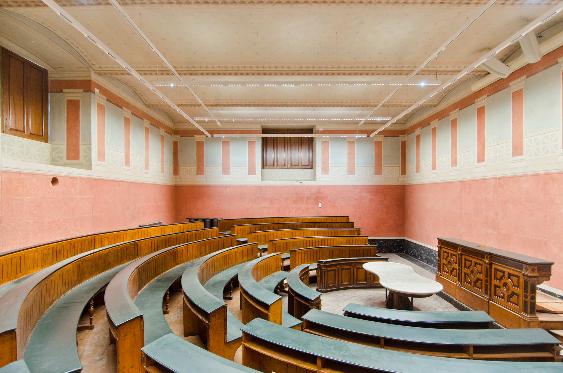 Die Deckenmalereien – Hansen vertrat im „Polychromie-Streit“ des 19. Jahrhunderts eine explizite „Farbposition“ – kommen nun wieder in ihrer ganzen Farbigkeit und Frische zur Wirkung. Im Zuge der Sanierung stellte sich heraus, dass auch sämtliche Wände farbig waren. Diese unter späteren Wandschichten verborgenen Malereien waren jedoch nur mehr rudimentär erhalten. Nach einem gemeinsamen Beschluss von Denkmalamt, Architekt:innen, Nutzerin und Bauherrin wurde im Anatomiesaal beispielhaft der ursprüngliche Raumeindruck mit den Wandbemalungen wiederhergestellt.