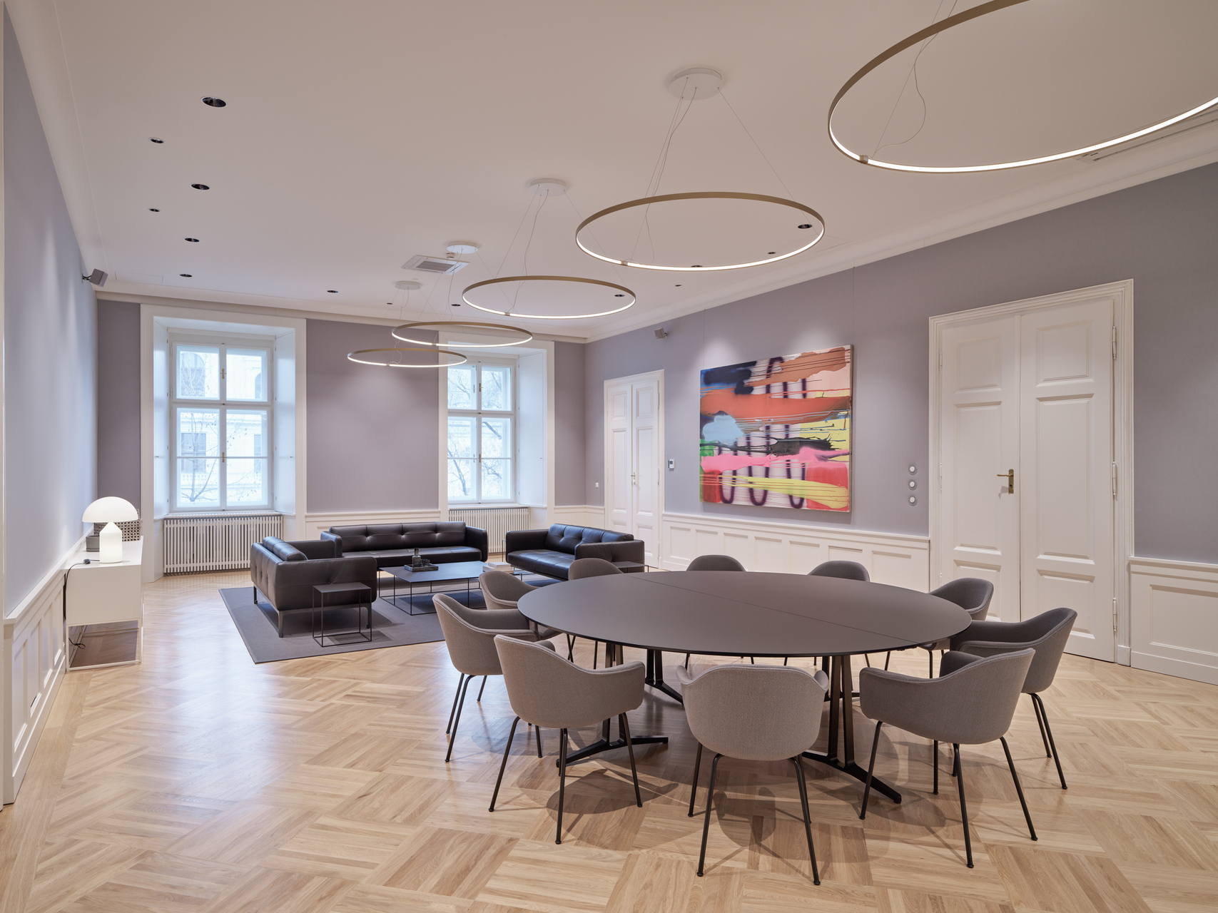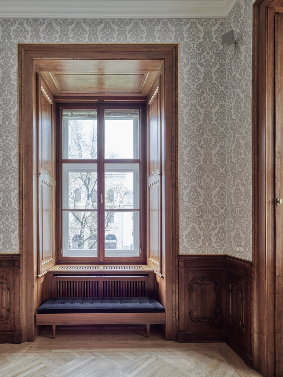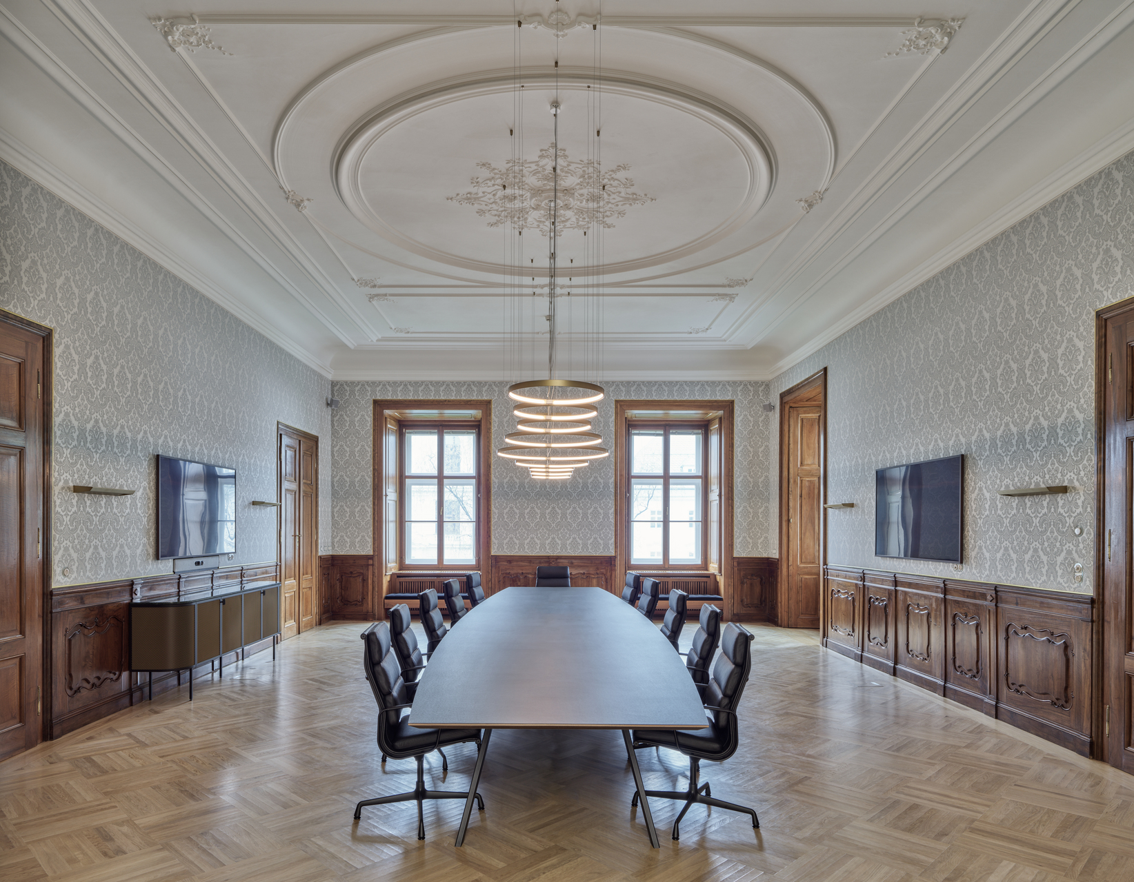 Das Regierungssitzungszimmer zeigt sich heute als gediegener Besprechungsraum, ausgestattet mit zeitgemäßer Medientechnik. Das Zimmer daneben wurde entkernt, verfügt nun wieder über Tageslicht und wird als Empfangsraum für offizielle Besuche aus dem In- und Ausland genutzt. Mit der respektvollen Renovierung konnten Würde und verblasster Glanz der Bestandsarchitektur wiederhergestellt werden. Ausdruck und Atmosphäre der Räumlichkeiten wurden allerdings durch präzise Ergänzungen der Ausstattung auf der Höhe der Zeit neu interpretiert. (Text: Tobias Hagleitner, nach einem Text der Architekt:innen)