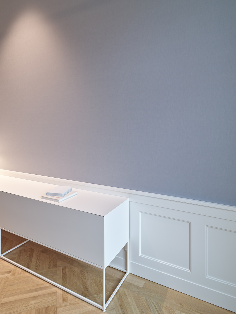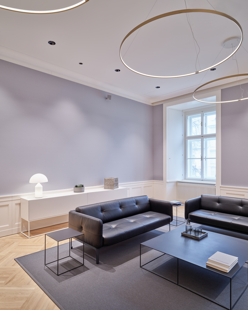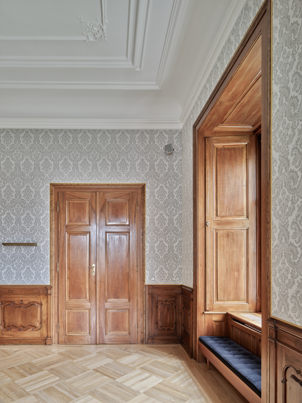 Das Regierungssitzungszimmer zeigt sich heute als gediegener Besprechungsraum, ausgestattet mit zeitgemäßer Medientechnik. Das Zimmer daneben wurde entkernt, verfügt nun wieder über Tageslicht und wird als Empfangsraum für offizielle Besuche aus dem In- und Ausland genutzt. Mit der respektvollen Renovierung konnten Würde und verblasster Glanz der Bestandsarchitektur wiederhergestellt werden. Ausdruck und Atmosphäre der Räumlichkeiten wurden allerdings durch präzise Ergänzungen der Ausstattung auf der Höhe der Zeit neu interpretiert. (Text: Tobias Hagleitner, nach einem Text der Architekt:innen)