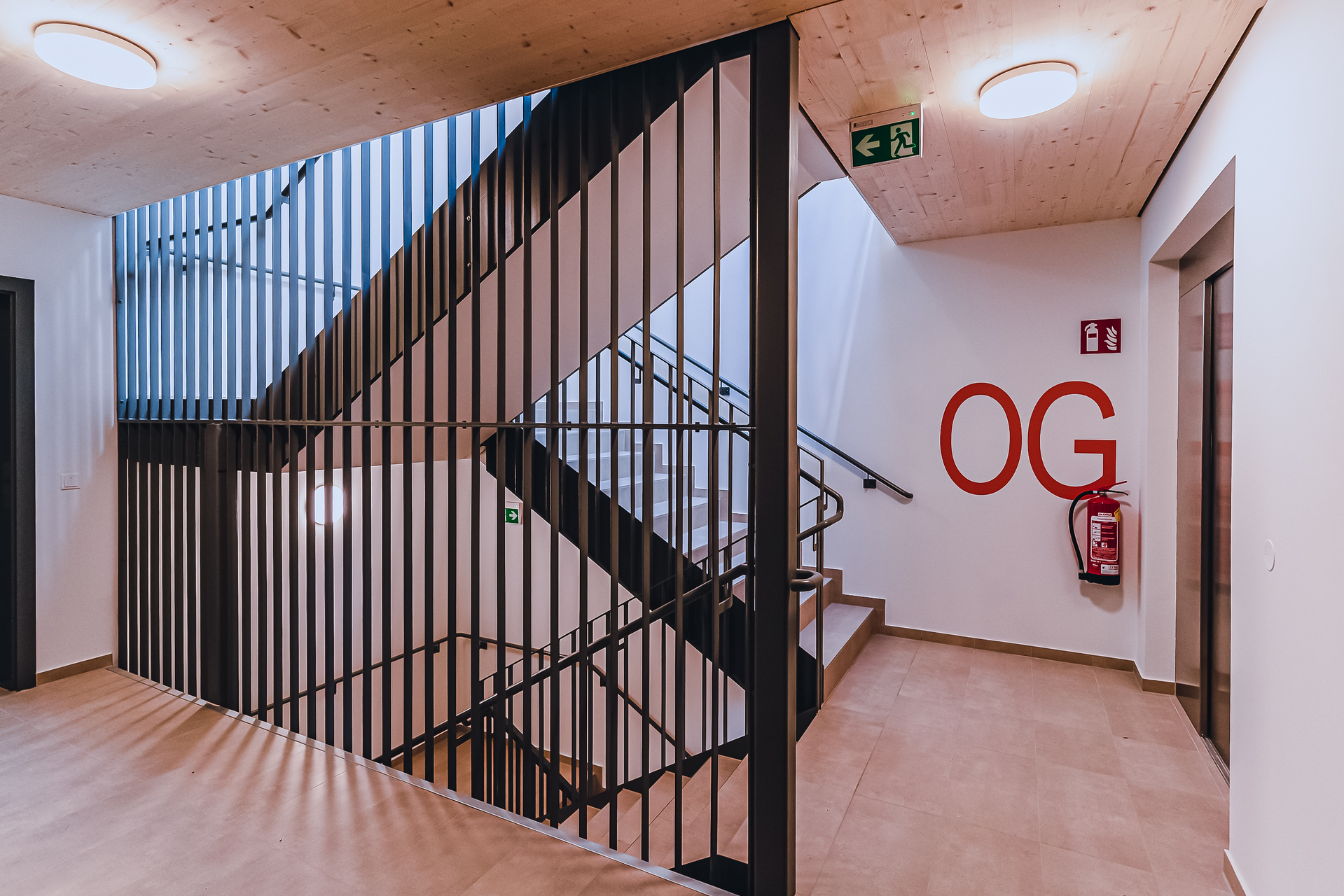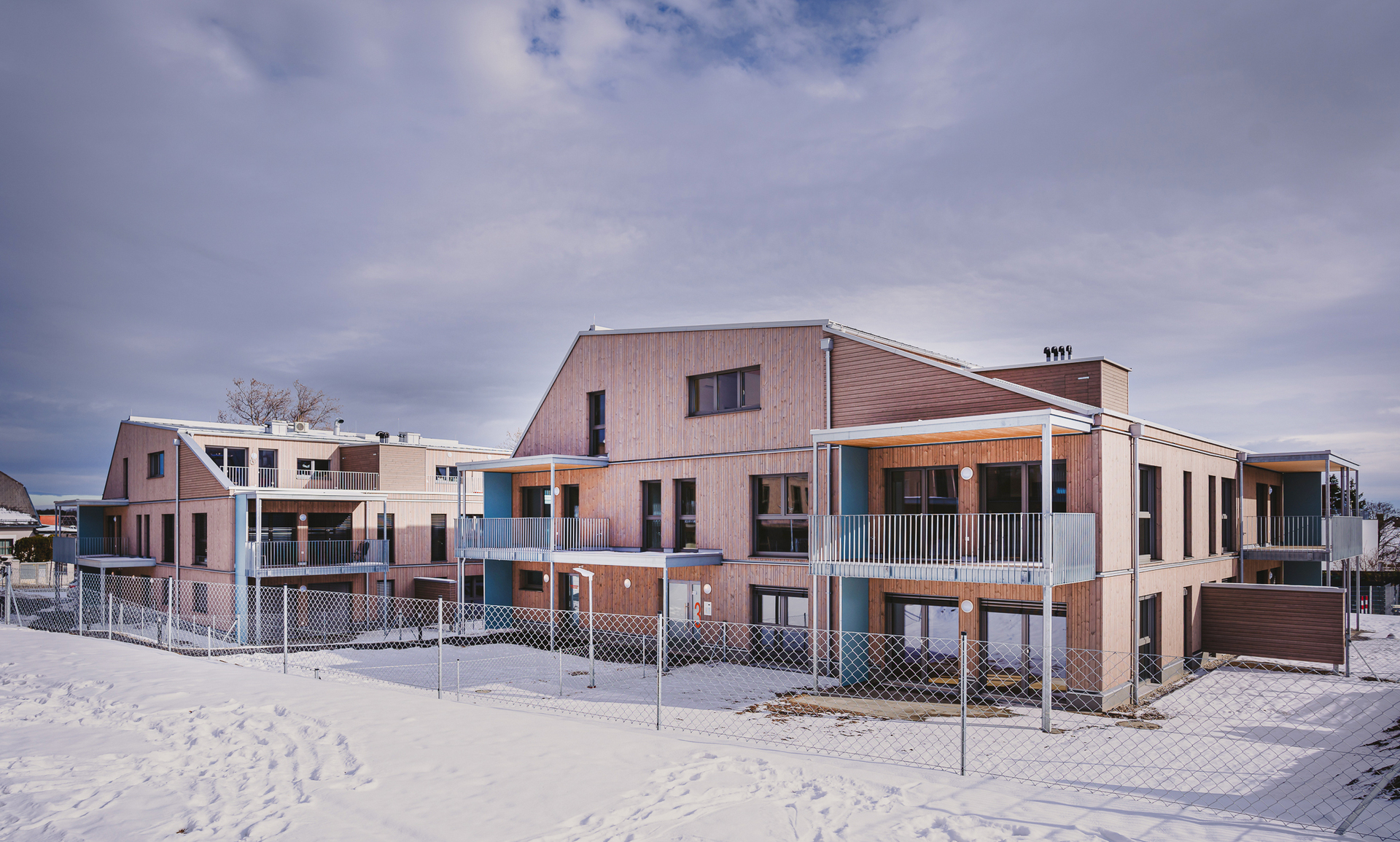 Als „grüne Lunge“ fungiert der Spielplatz, der das Zentrum der Anlage bildet. Alle Zugänge tangieren diese Mitte, welche als Kommunikationszone für alle Wohnungseigentümer dient. Sämtliche Hauszugangsbereiche sind barrierefrei über Rampen erreichbar. Erdgeschossig situierte Fahrradräume fördern klimafreundliche Mobilität. (Text: Architekt:innen, bearbeitet)