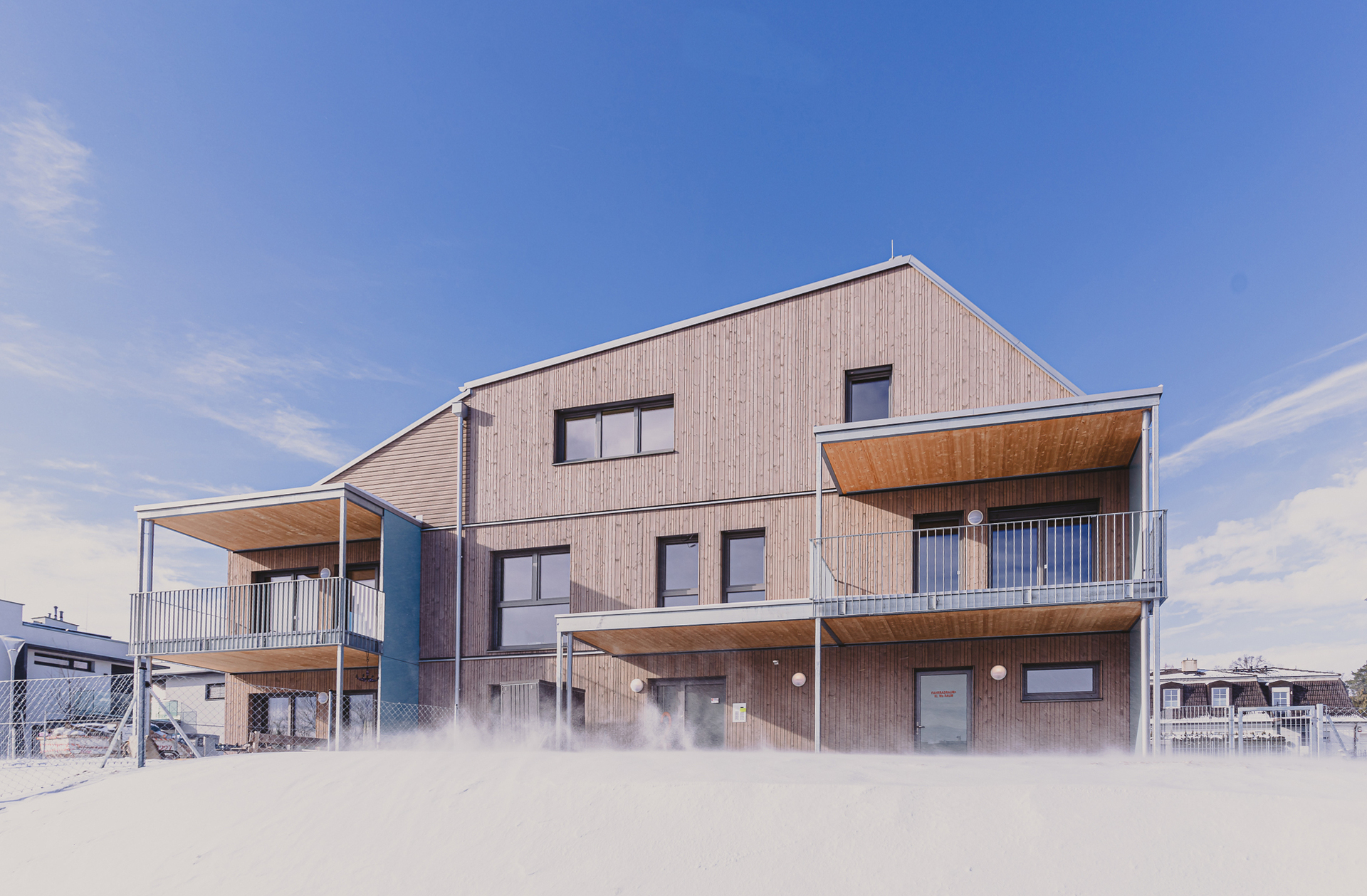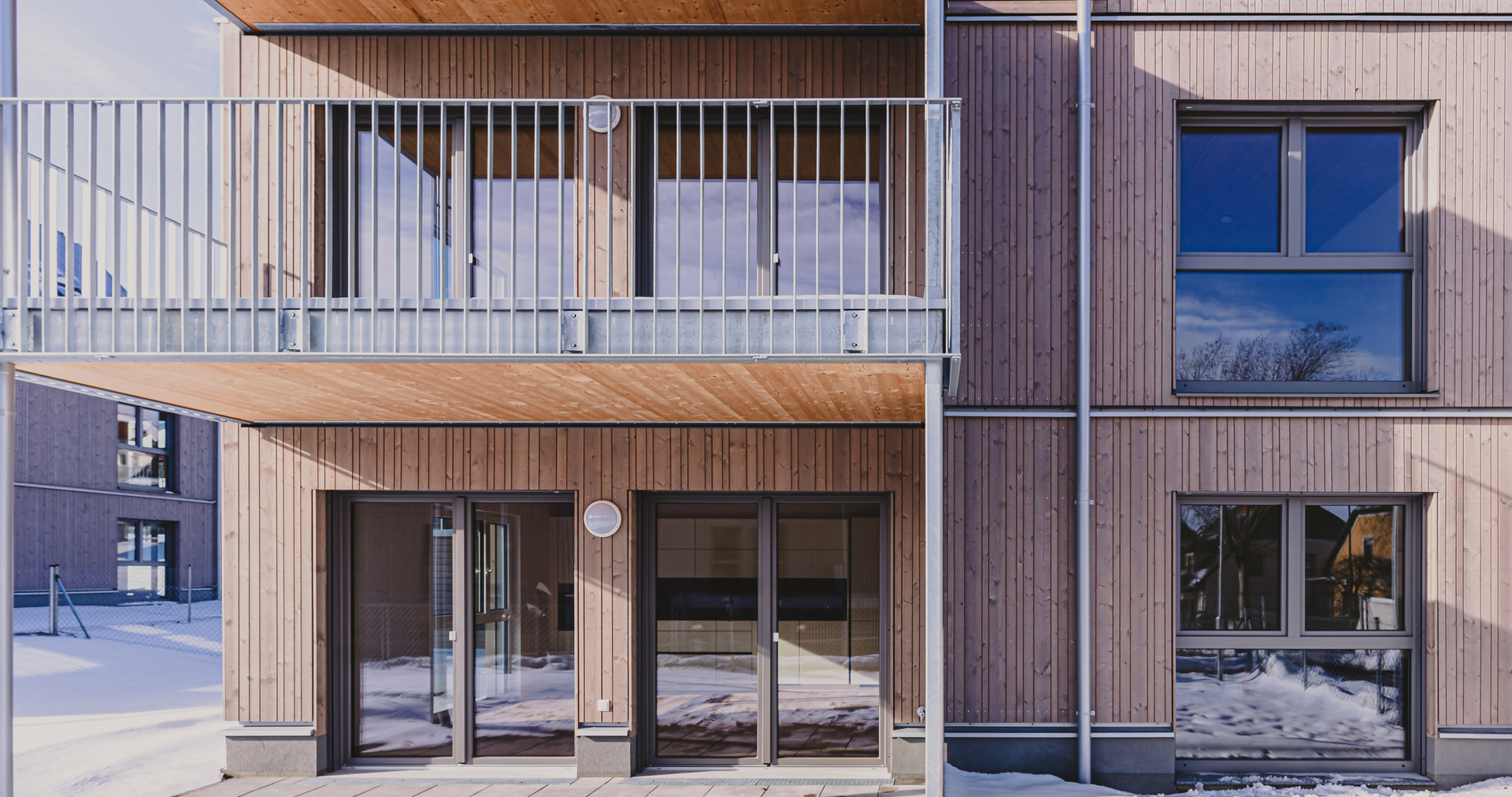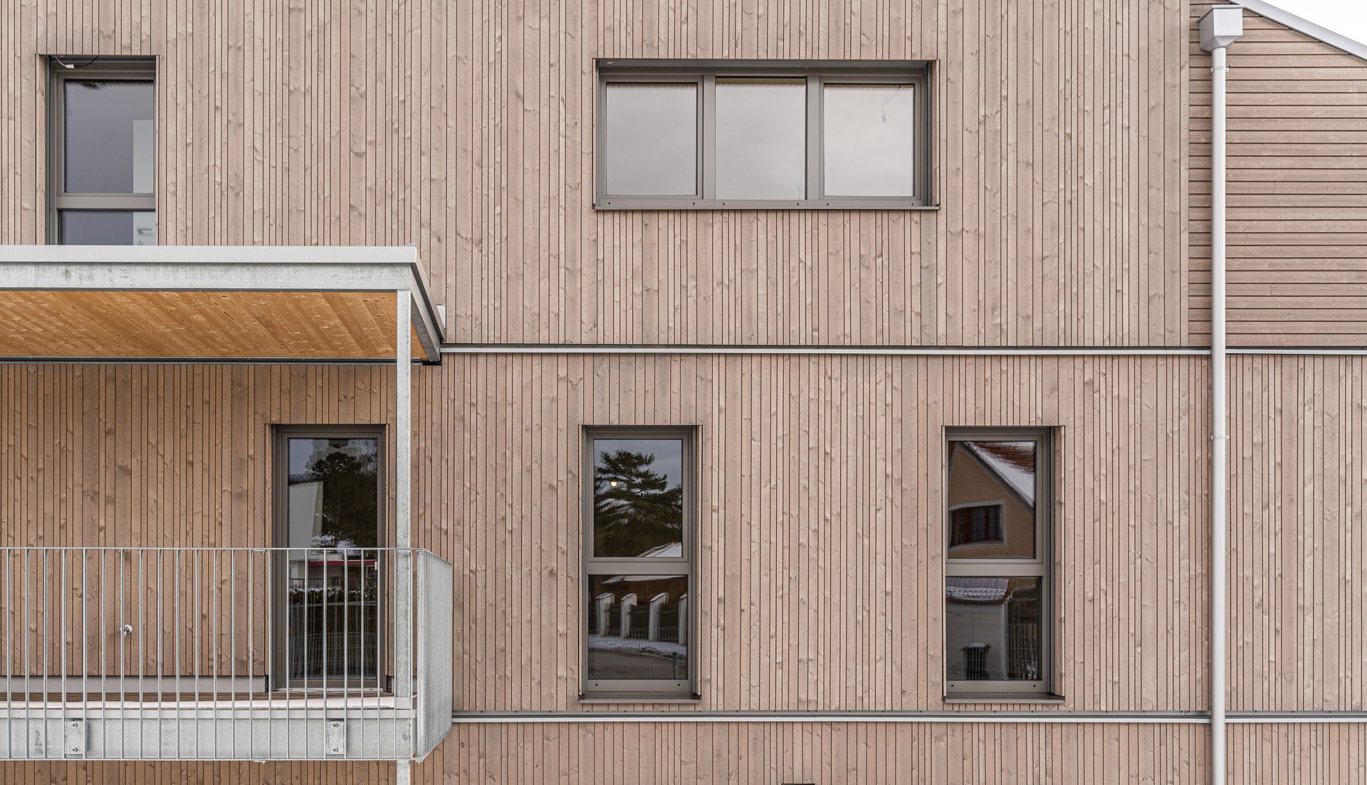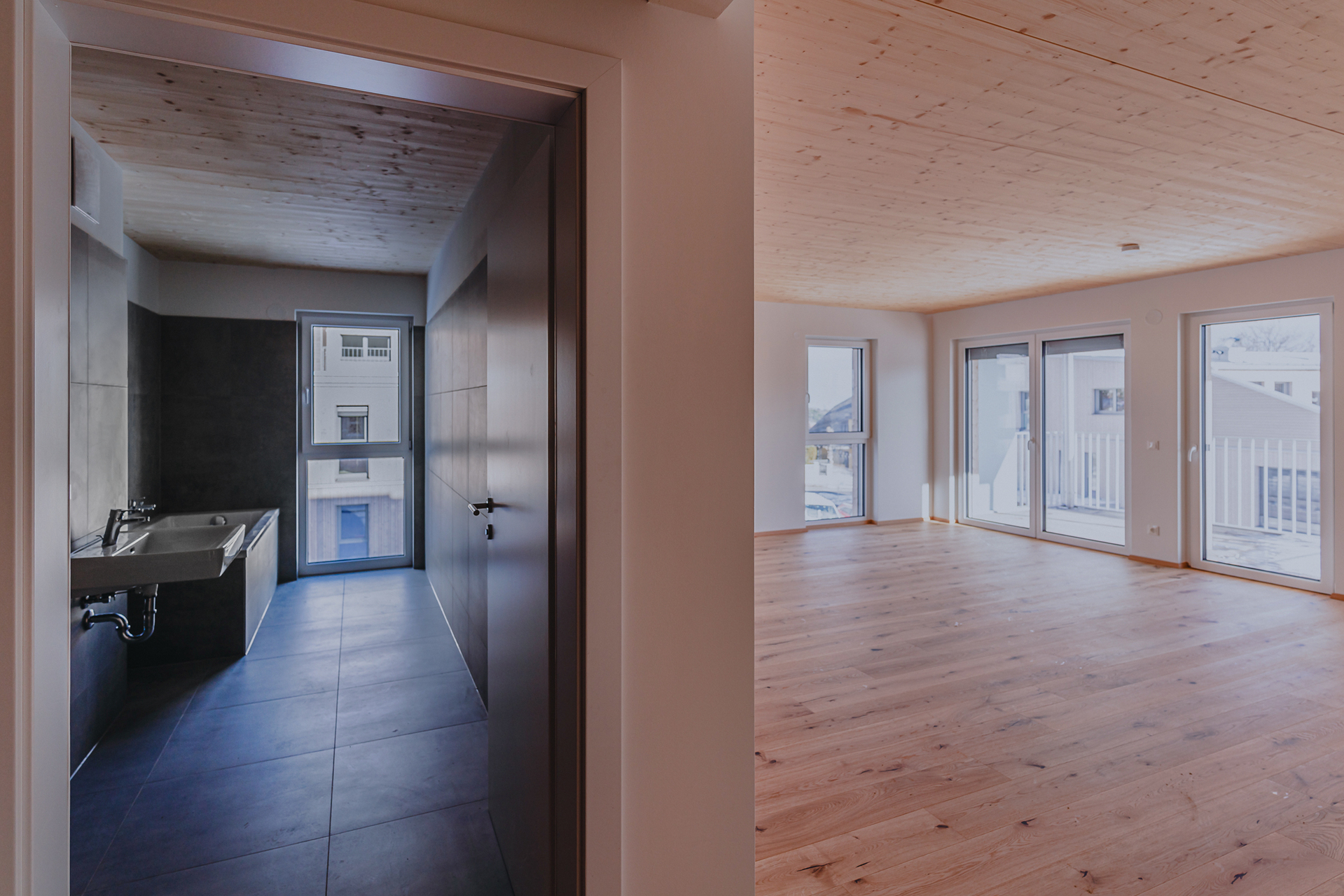 Jede Wohnung ist über Eck organisiert und bietet dadurch zweiseitige Belichtung bei einem hohen Maß an Intimität. Die Ausstattung ist hochwertig und einheitlich: Sichtbare Holzdecken, raumhohe Fenster, Holzböden und vorgelagerte Eigengärten, Loggien und Terrassen. Mit zusätzlichen Einlagerungsboxen auf den Dachterrassen sind die Dachgeschosswohnungen ausgestattet. Klarer Vorteil der vorgestellten Balkone sind die minimalen Durchdringungen und somit maximale Flexibilität an der Fassade. Außer den Aufzugsschächten, den Stiegenläufen und den Bodenplatten in Stahlbeton sind alle Wand- und Deckenbauteile in Holz ausgeführt. Die zweischaligen Sandwich-Holzwandelemente wurden mit Zellulose gedämmt und außen mit einer silbrig schimmernden vertikalen Fichtenschalung in drei verschiedenen Brettbreiten verkleidet.