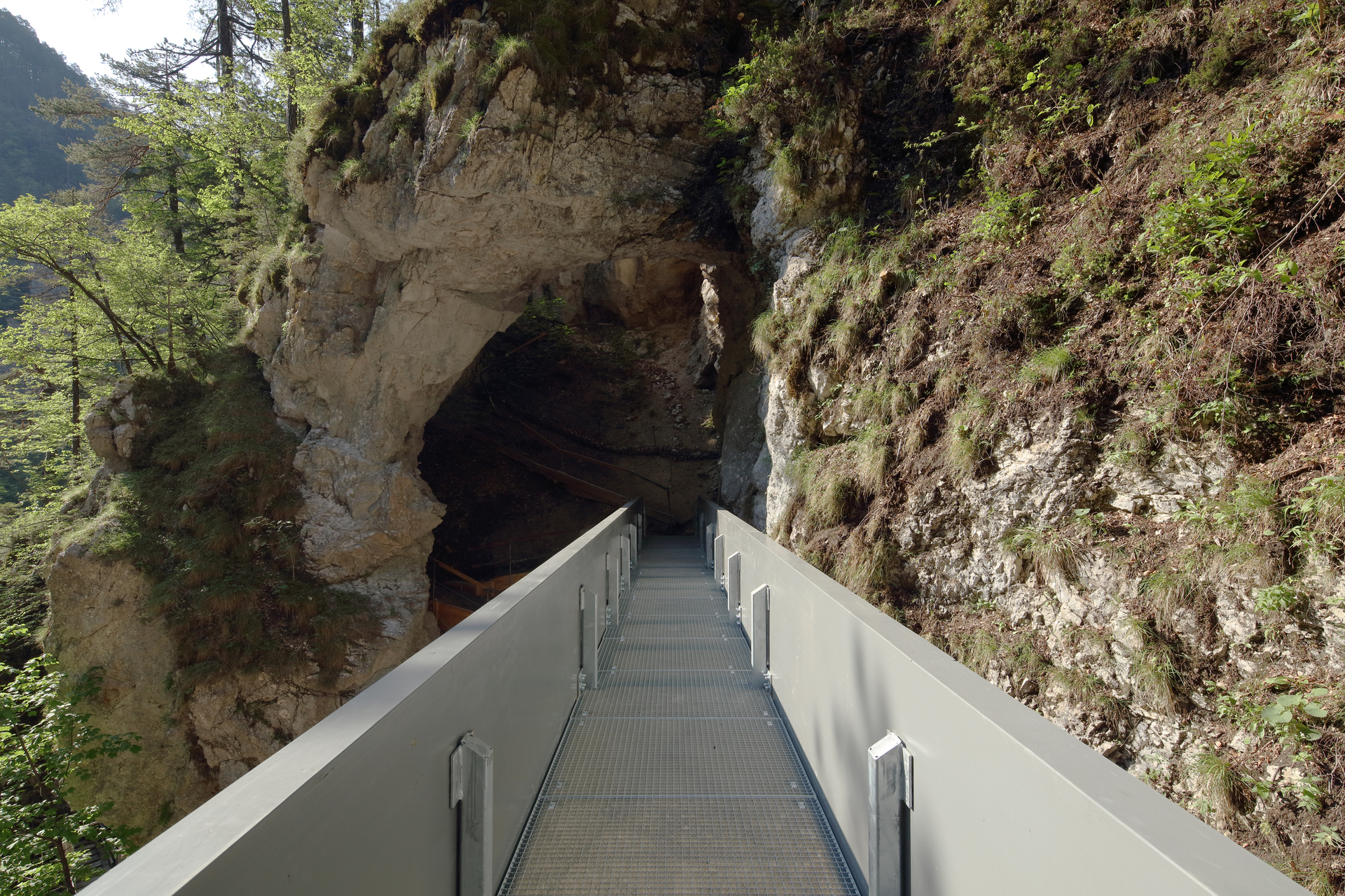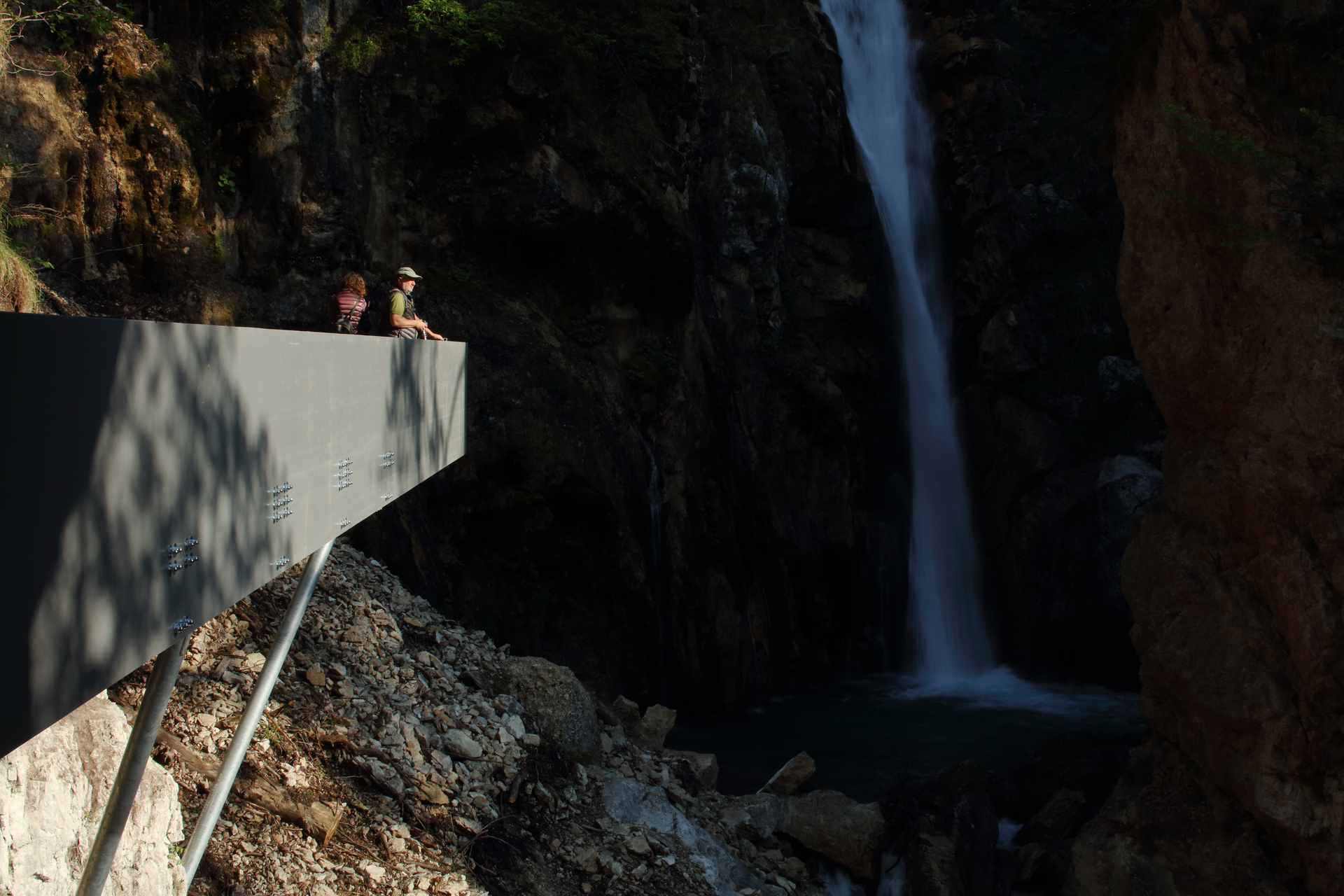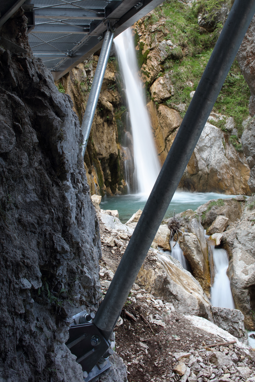 Der neue 18 Meter lange Steg, der in seiner Mitte am Felsen auflagert, kragt zweiseitig aus. Unter dem Felsentor berührt er beinahe das Gelände. Mit diesem Einstieg beginnt der leicht ansteigende Steg und endet, meterhoch über dem unwegsamen Geröll, schwebend an einem Punkt mit perfektem Blick in das Becken des Wasserfalles. (Text: Architekten)