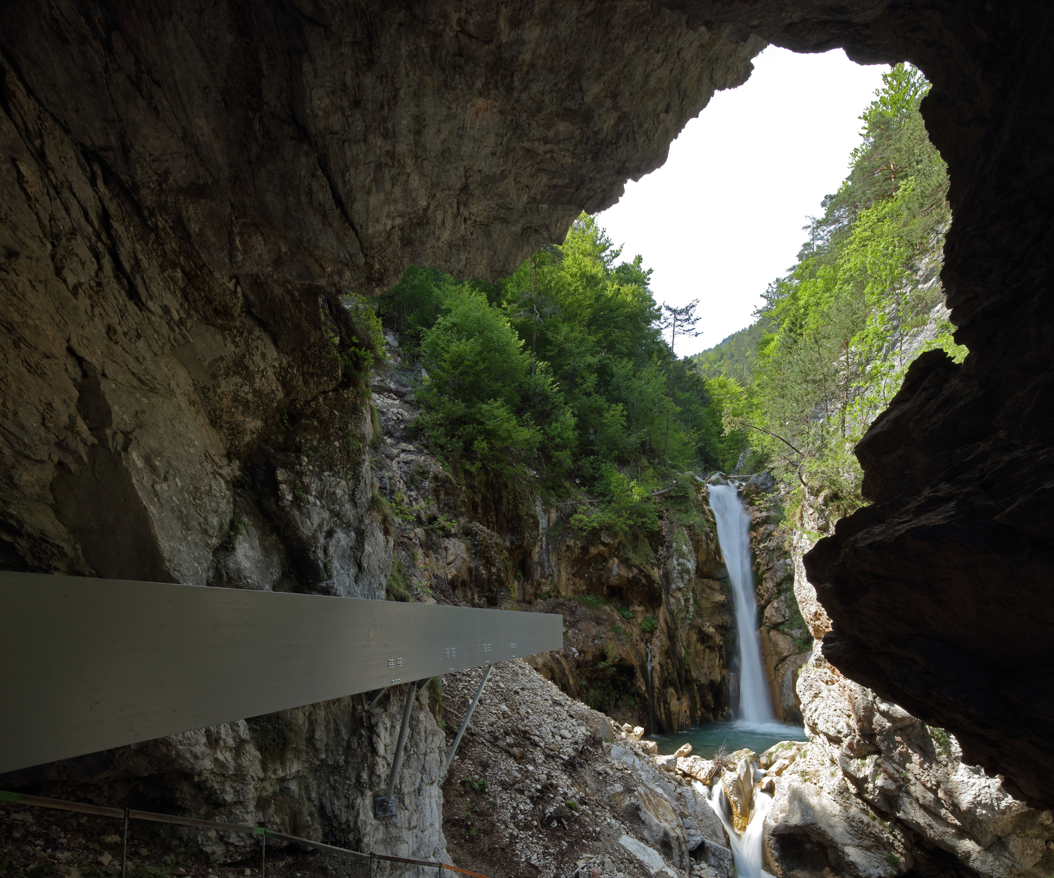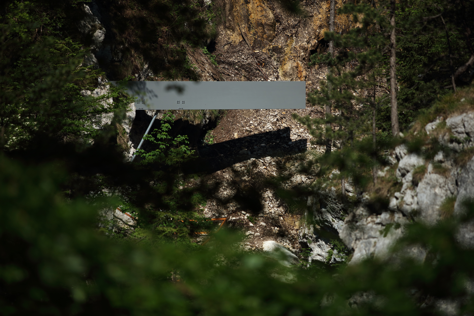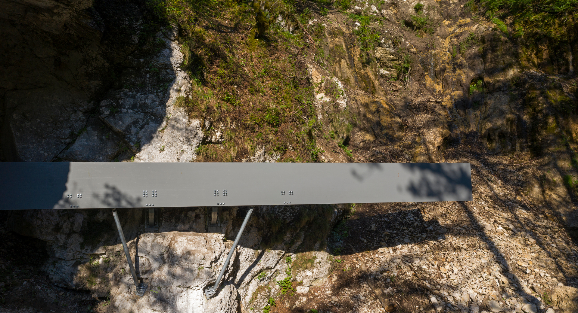 Der neue 18 Meter lange Steg, der in seiner Mitte am Felsen auflagert, kragt zweiseitig aus. Unter dem Felsentor berührt er beinahe das Gelände. Mit diesem Einstieg beginnt der leicht ansteigende Steg und endet, meterhoch über dem unwegsamen Geröll, schwebend an einem Punkt mit perfektem Blick in das Becken des Wasserfalles. (Text: Architekten)