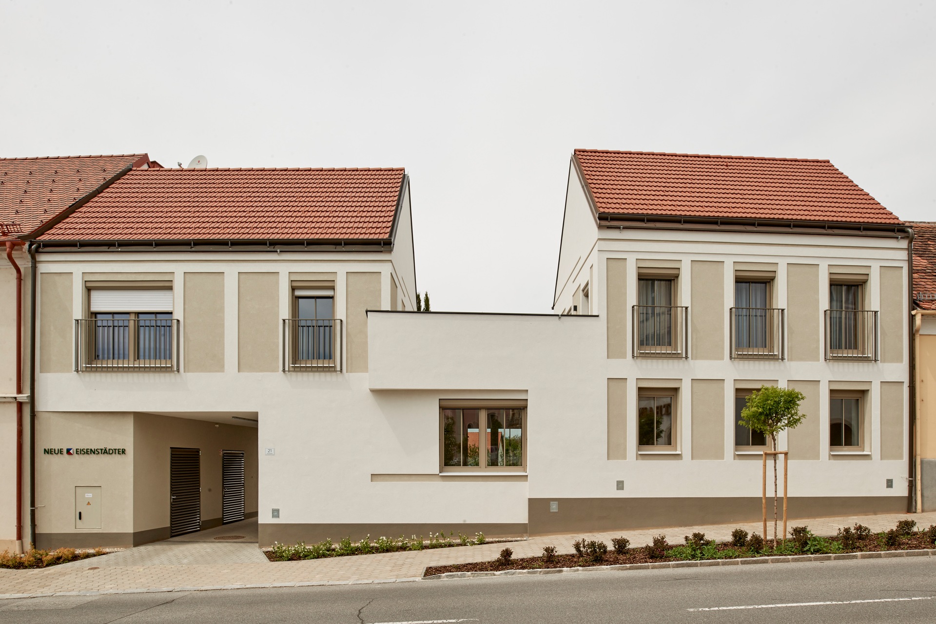 Dieses Schicksal widerfuhr auch der gegenständlichen Liegenschaft. Einst kleine Bäckerei, dann Modernisierung durch Errichtung einer neuen, größeren Betriebsstätte in den 70er Jahren auf der zugekauften Nachbarliegenschaft, dann Schließung und darauf folgender Leerstand wie oben beschrieben in genannter Reihenfolge. Die Ausgangslage für das Grundstück war eine alte, massiv geschädigte Bäckerei aus dem 17. Jahrhundert, die teilweise auf Fremdgrund stand, sowie ein geschichtsloses Haus aus den 1970er Jahren mit einer einsturzgefährdeten Betriebsstätte. Durch die Zusammenführung der beiden Grundstücke war eine wohnbauliche Nutzung des Innenhofs unter Einhaltung der Baugesetze möglich. Die gestalterischen Vorgaben beschränkten sich im Wesentlichen auf die Höhenanpassung, während für andere Aspekte keine festen Richtlinien vorgegeben wurden. Die Wahl, die bestehenden Strukturen weitgehend im Einklang mit der Bauaufgabe nachzubilden und dabei ein gewisses Maß an Anonymität in der Fassade des Hauptplatzes zu bewahren, wurde von der oben beschriebenen Sichtweise des Ortes inspiriert. Weitere Überlegungen in der Planung beinhalteten das Abrücken zu einer Grundstücksgrenze, um eine Querlüftung für die Wohnungen zu ermöglichen. Dies dient nicht nur der Belüftung der Räume, sondern gewährleistet auch eine effektive Kühlung im Sommer. Die Staffelung der Baukörper in der Höhe wurde entsprechend der umliegenden Bebauung und der Geländebeschaffenheit sorgfältig geplant. Die Hervorhebung der Achse zwischen dem Hochwechsel und der Pfarrkirche, die klare Darstellung dieser einzigartigen Lage des Gebäudes sowie die Integration von Ornamenten und Strukturen als gestalterische Elemente wurden ebenfalls in die Planung integriert. (Text: Architekt)