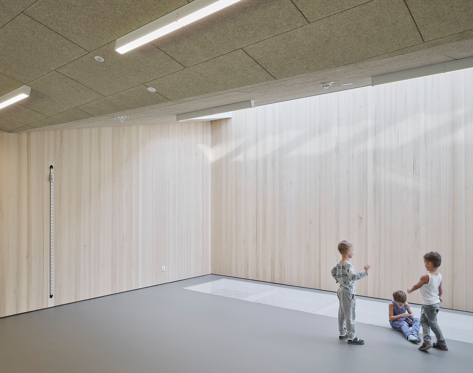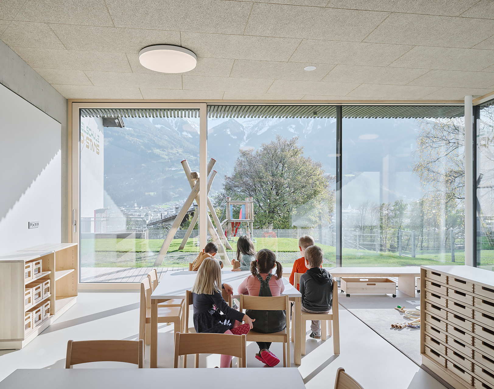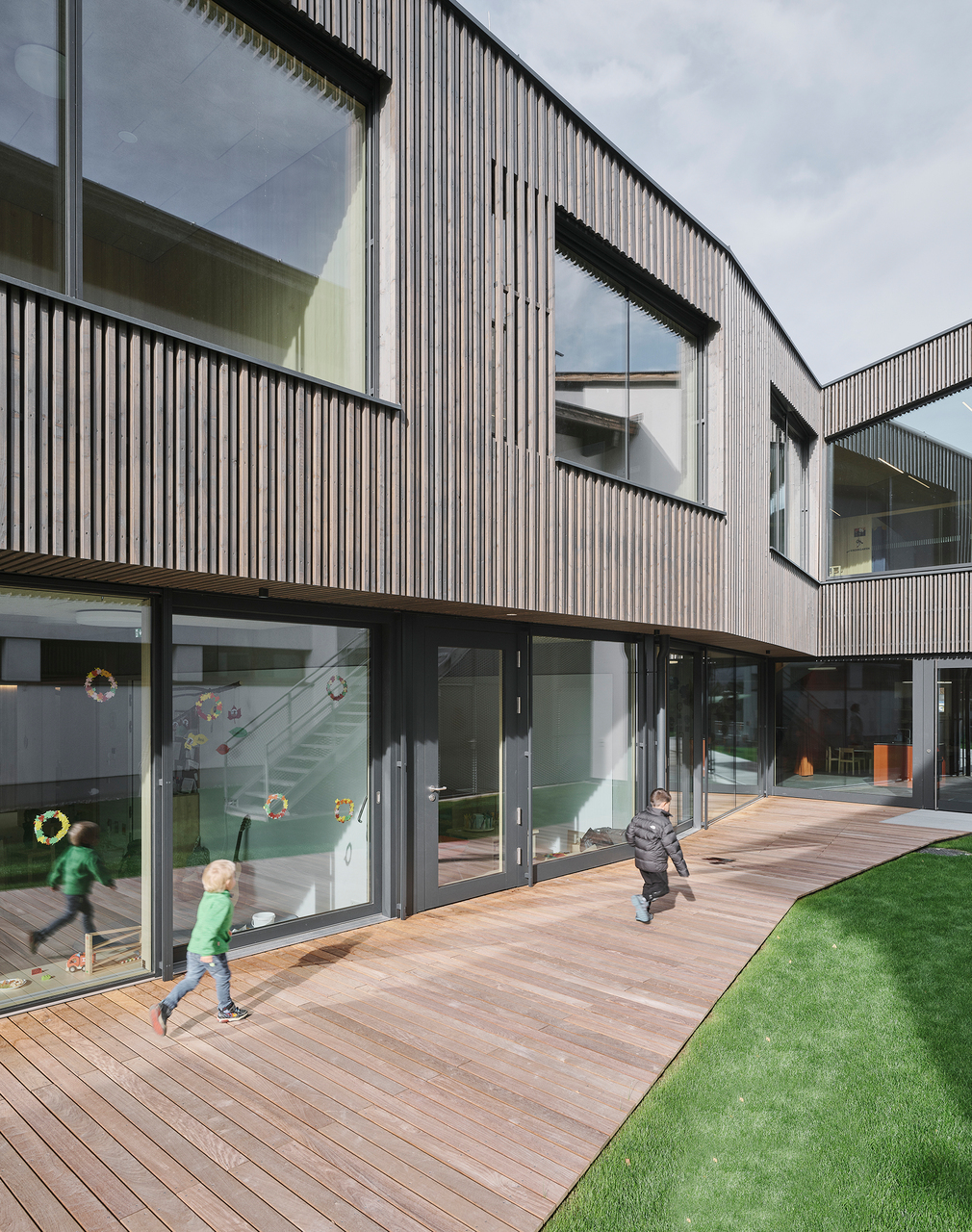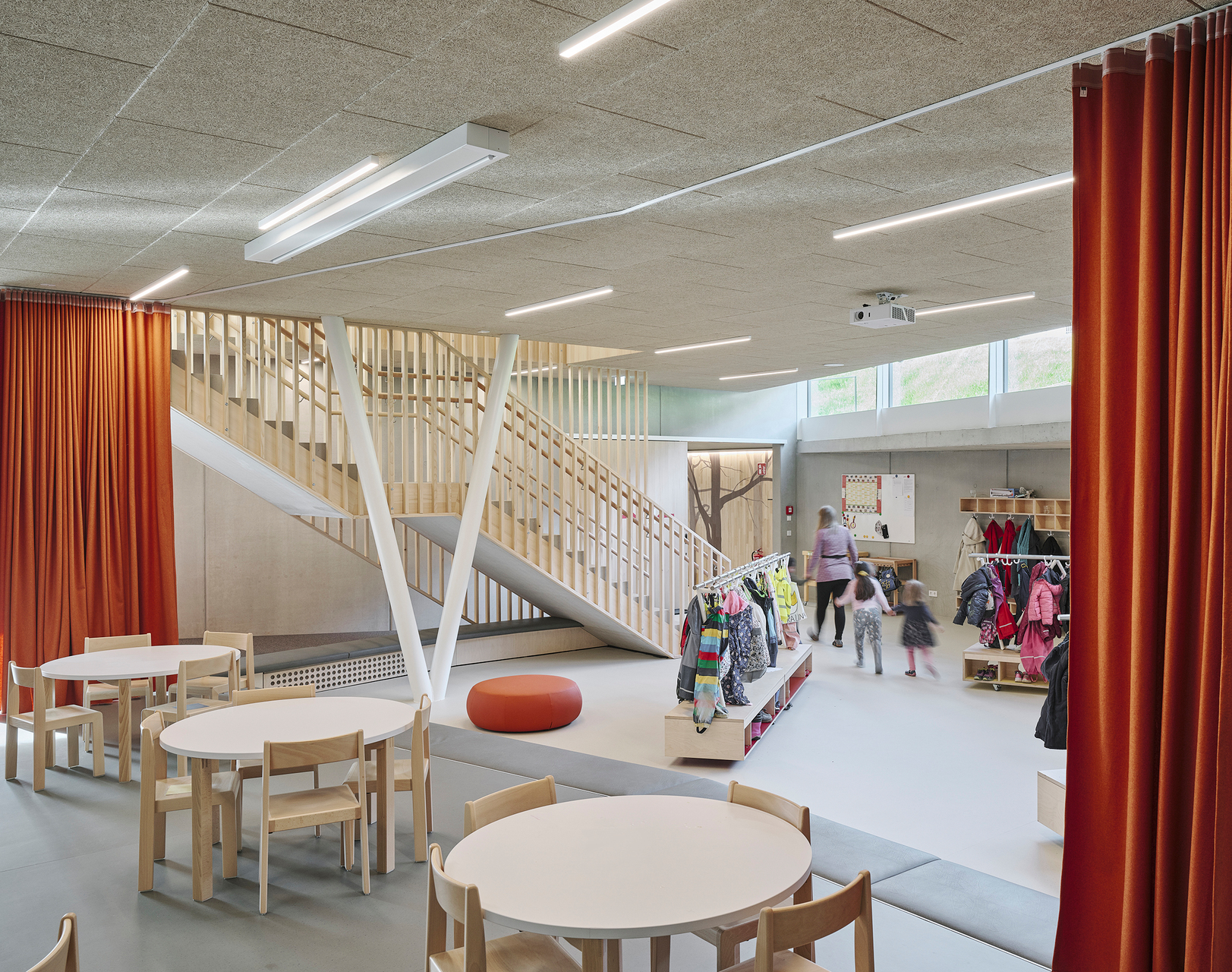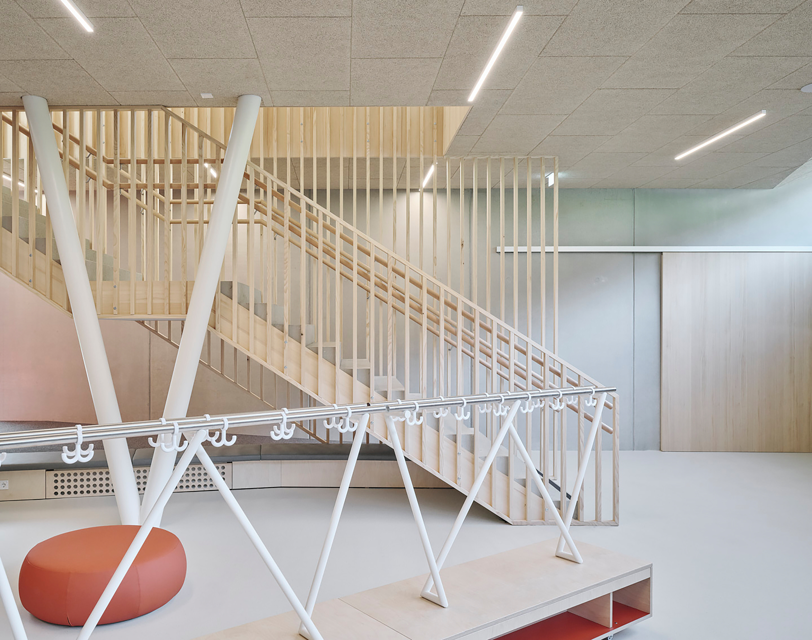 Der Hauptzugang erfolgt im Nordwesten über eine, die Straßenkrümmung fortführende Rampe, die zur barrierefreien Erschließung der Mittelschule beiträgt. Von hier aus kommt man ebenerdig in das eigentliche Obergeschoß, in dem sich der gemeinsame Bewegungsraum, die Personalräume und die Kinderkrippe samt vorgelagerter Spielterrasse befinden. Unter diesem, als Holzriegelwandkonstruktion mit hinterlüfteter Holzfassade realisierten Obergeschoß liegt der nach Südosten über raumhohe Fenster geöffnete Bereich des Kindergartens. Neben vier, über eine Lernlandschaft erschlossene Gruppenräume gibt es auf dieser, in Stahlbeton ausgeführten Ebene die Garderobe und den Essbereich, die zusammen aufgrund ihres beweglichen Mobiliars einen großen, flexibel nutzbaren Raum bilden. Oberlichter, raumhohe Fenster und der verglaste Boden der Rampe bringen viel Licht in das Innere, das durch offene Raumabfolgen und eine reduzierte Materialauswahl geprägt ist. (Text: Claudia Wedekind)