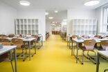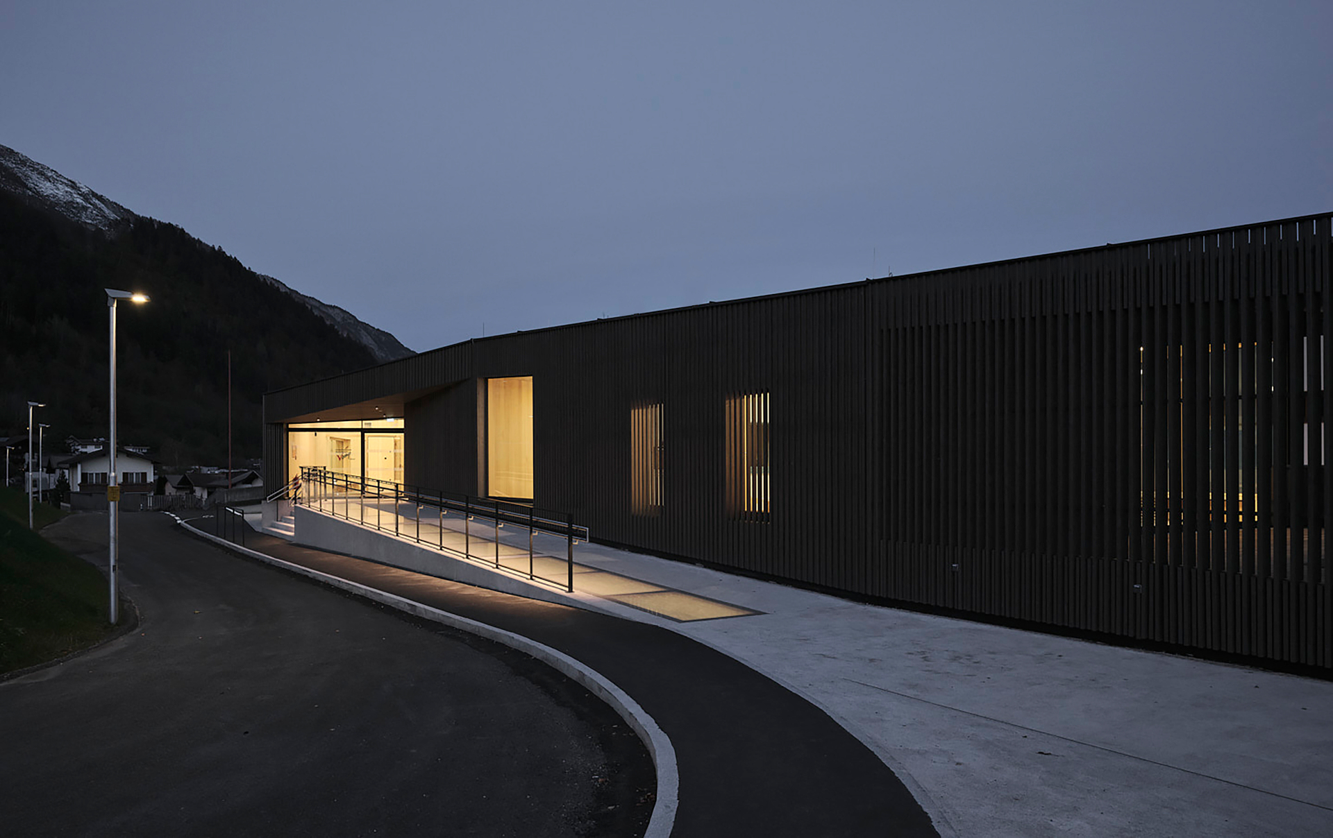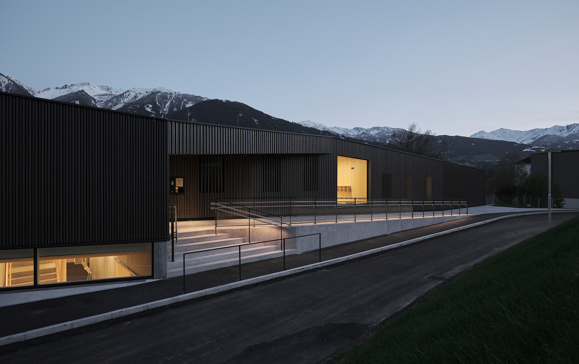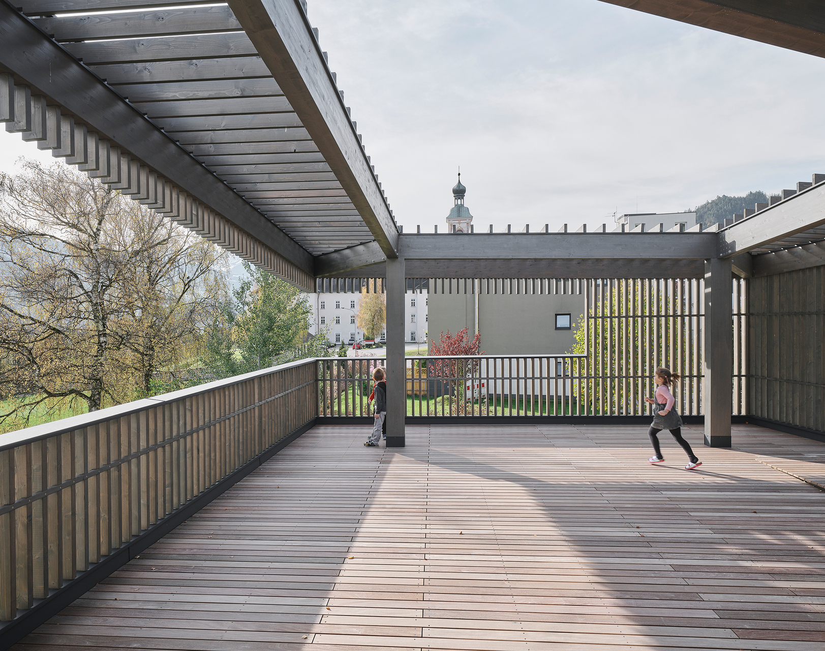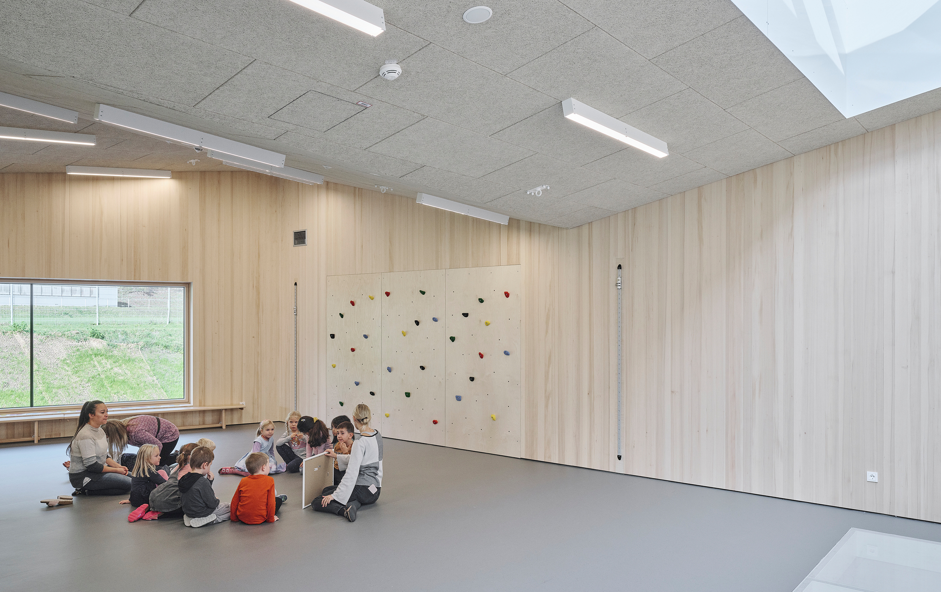 Der Hauptzugang erfolgt im Nordwesten über eine, die Straßenkrümmung fortführende Rampe, die zur barrierefreien Erschließung der Mittelschule beiträgt. Von hier aus kommt man ebenerdig in das eigentliche Obergeschoß, in dem sich der gemeinsame Bewegungsraum, die Personalräume und die Kinderkrippe samt vorgelagerter Spielterrasse befinden. Unter diesem, als Holzriegelwandkonstruktion mit hinterlüfteter Holzfassade realisierten Obergeschoß liegt der nach Südosten über raumhohe Fenster geöffnete Bereich des Kindergartens. Neben vier, über eine Lernlandschaft erschlossene Gruppenräume gibt es auf dieser, in Stahlbeton ausgeführten Ebene die Garderobe und den Essbereich, die zusammen aufgrund ihres beweglichen Mobiliars einen großen, flexibel nutzbaren Raum bilden. Oberlichter, raumhohe Fenster und der verglaste Boden der Rampe bringen viel Licht in das Innere, das durch offene Raumabfolgen und eine reduzierte Materialauswahl geprägt ist. (Text: Claudia Wedekind)