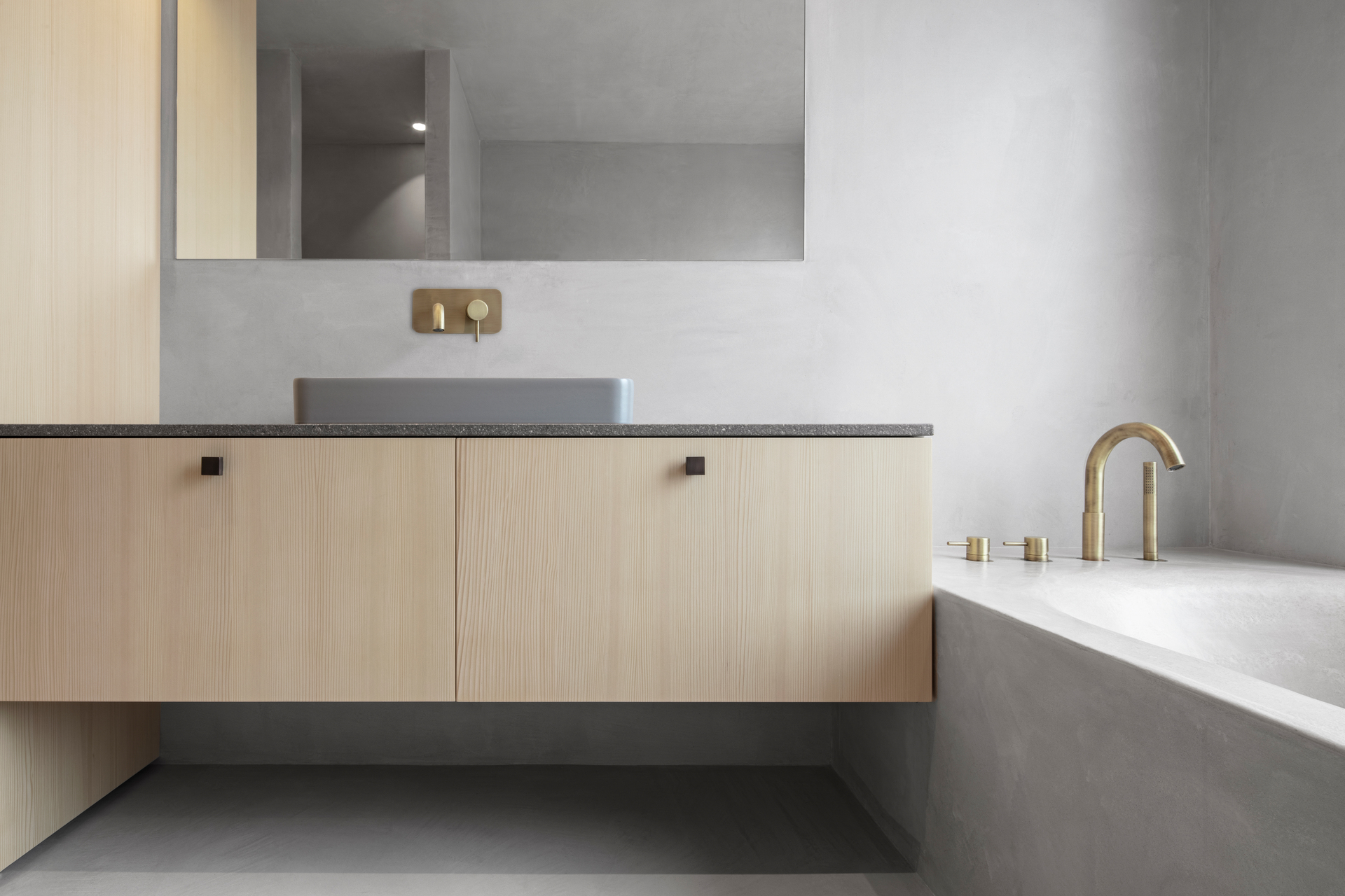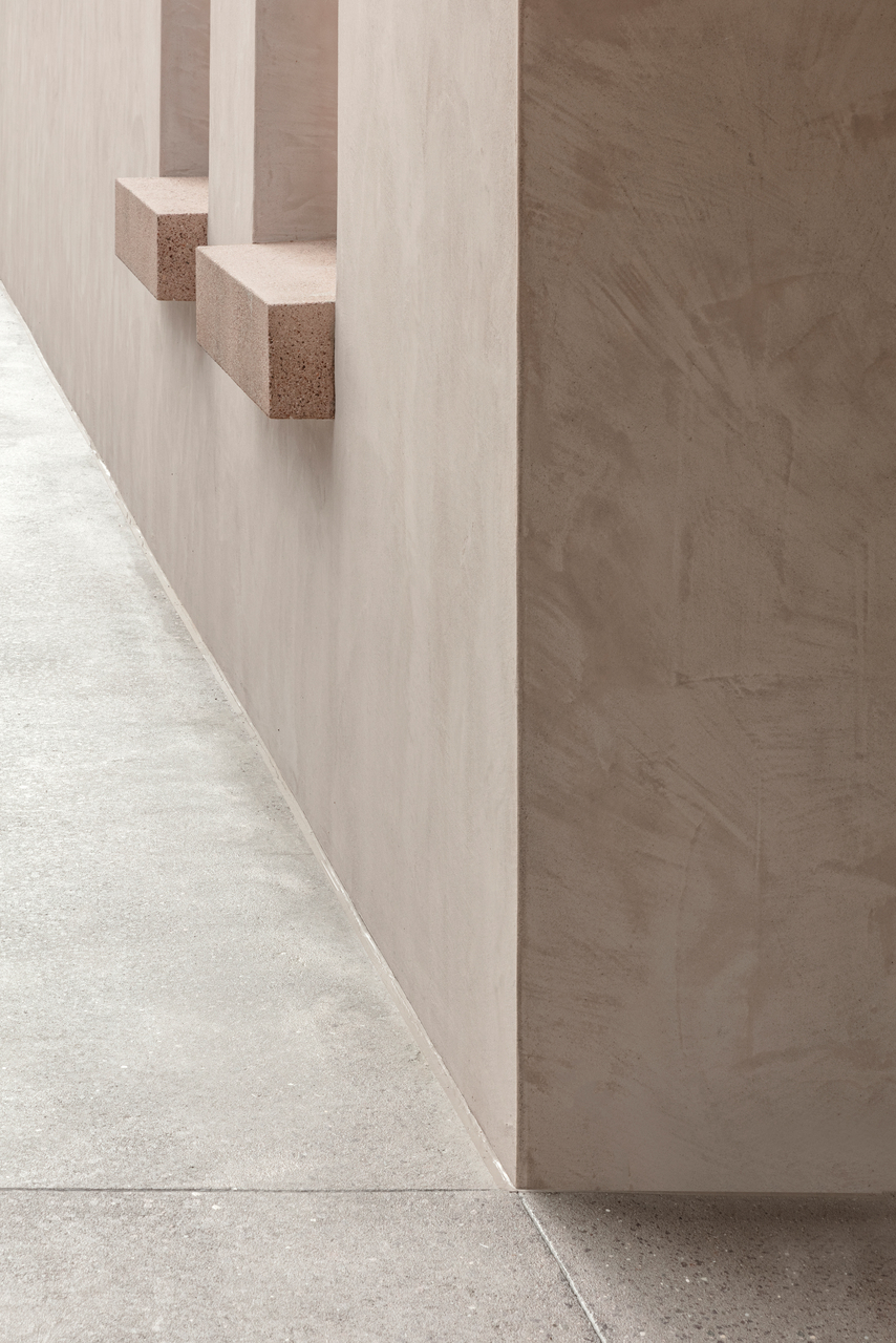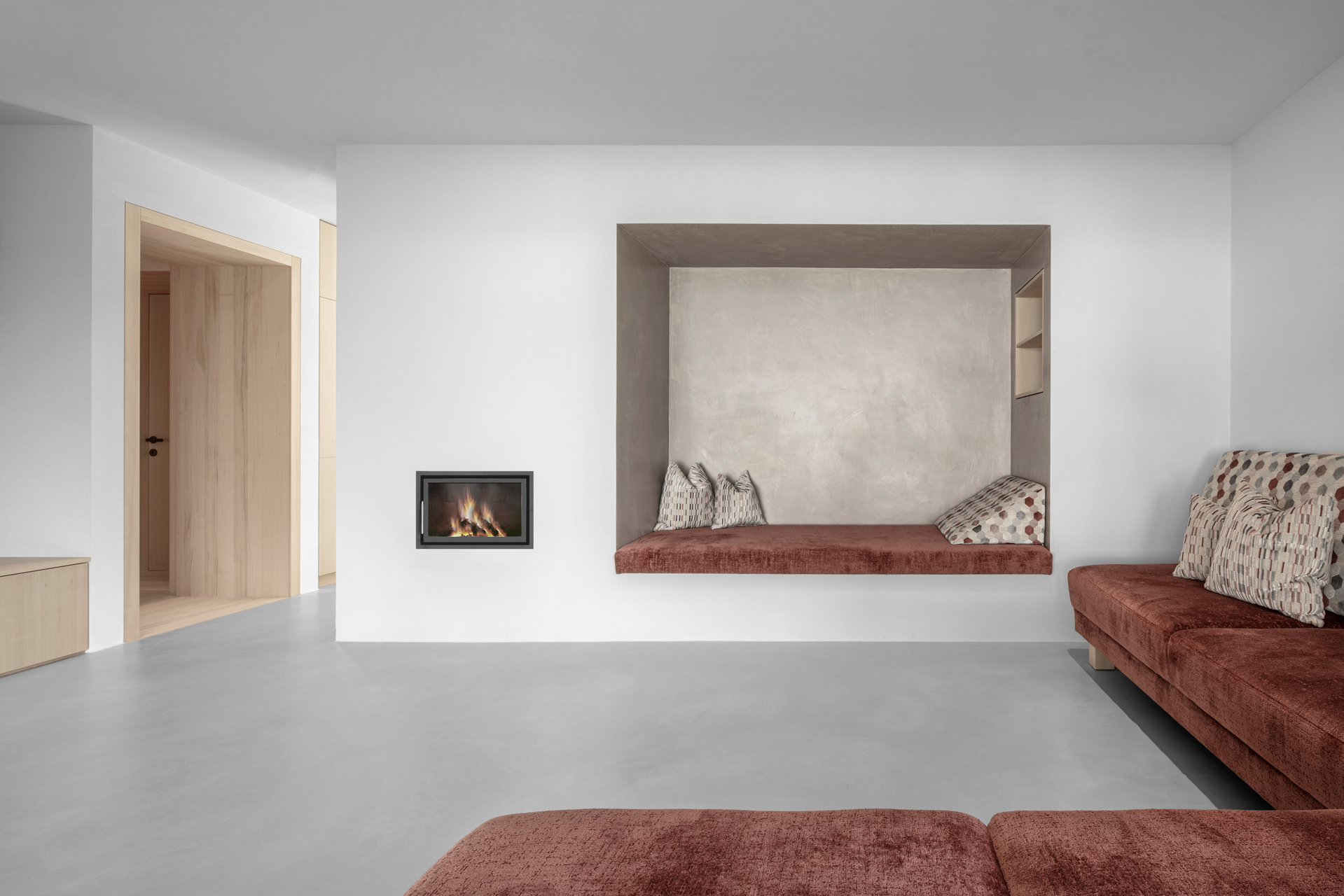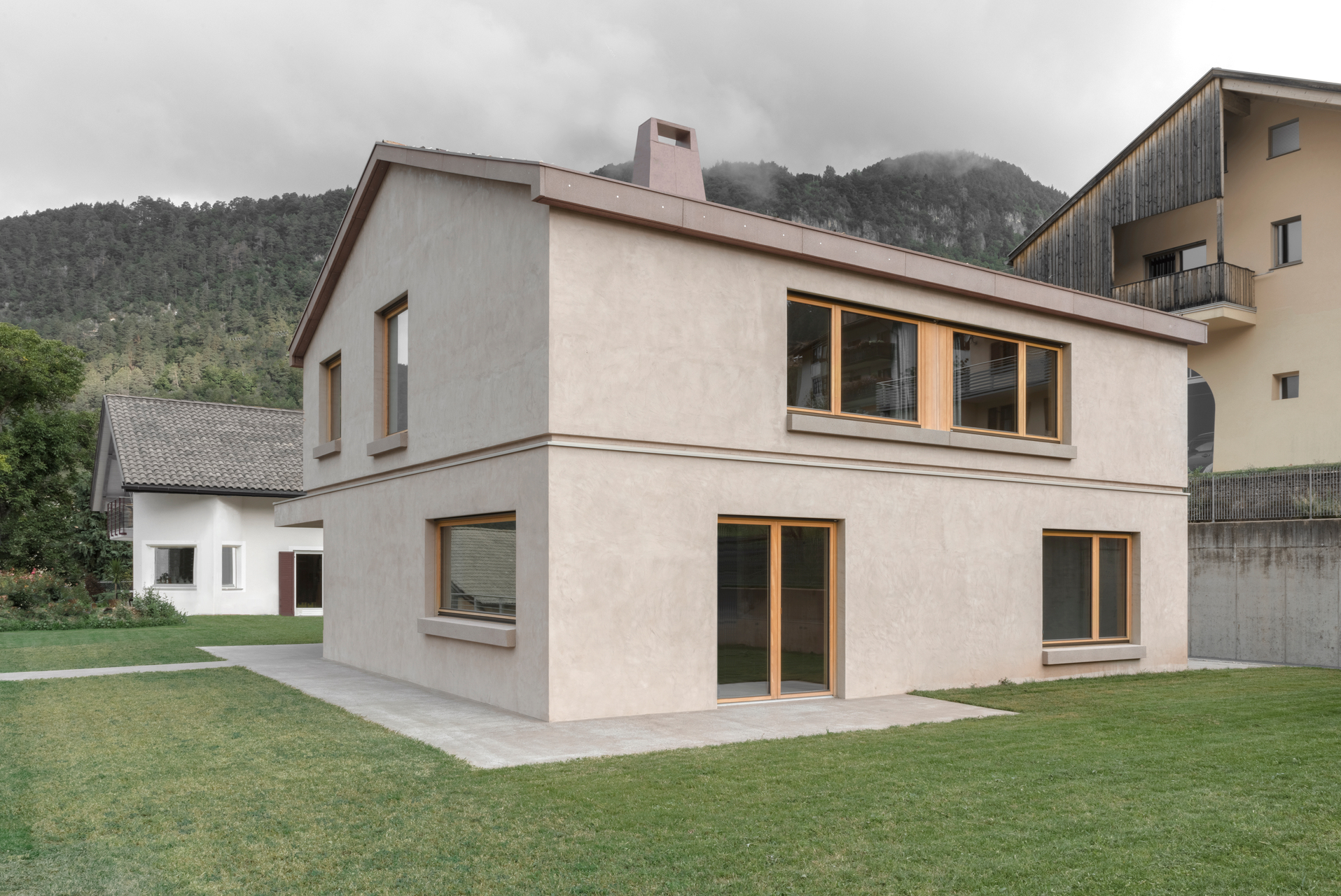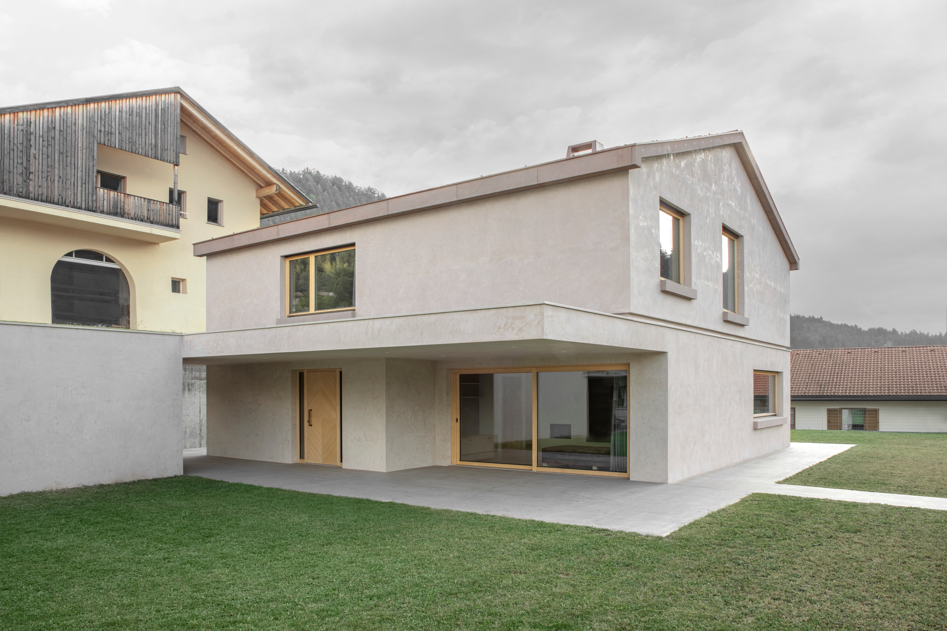 Der präsente und trotzdem zurückhaltende, in Massivbauweise errichtete Baukörper ist ganz frei von vorstehenden Elementen und geprägt von der klaren Lochfassade mit ihrem händisch glatt aufgetragenen Marmorino-Putz. Ortstypisch rötliche Porphyr-Zuschläge, akzentuierte, rotbraune gestockte Betonelemente und Fenster aus Weißtanne schaffen im Zusammenspiel mit der typischen Dacheindeckung mit Mönch und Nonne ein gleichermaßen zeitgemäßes wie an das Ortsbild angepasstes Gesamtbild.