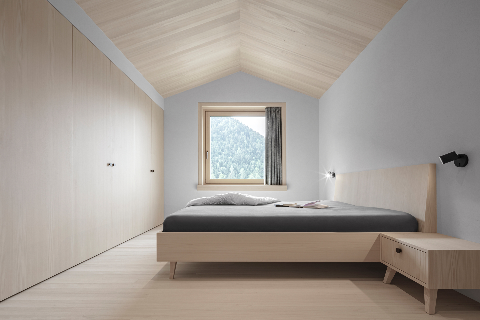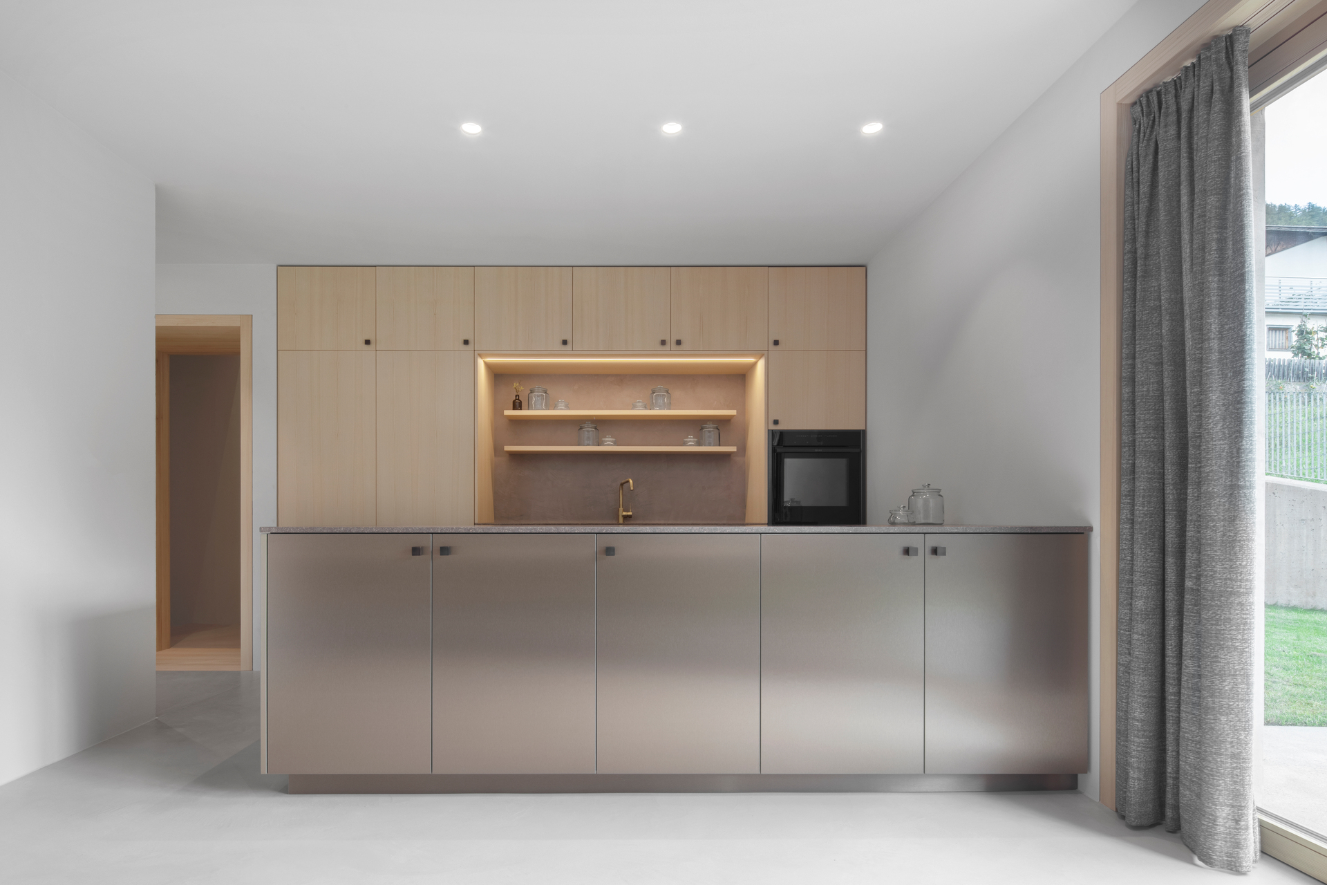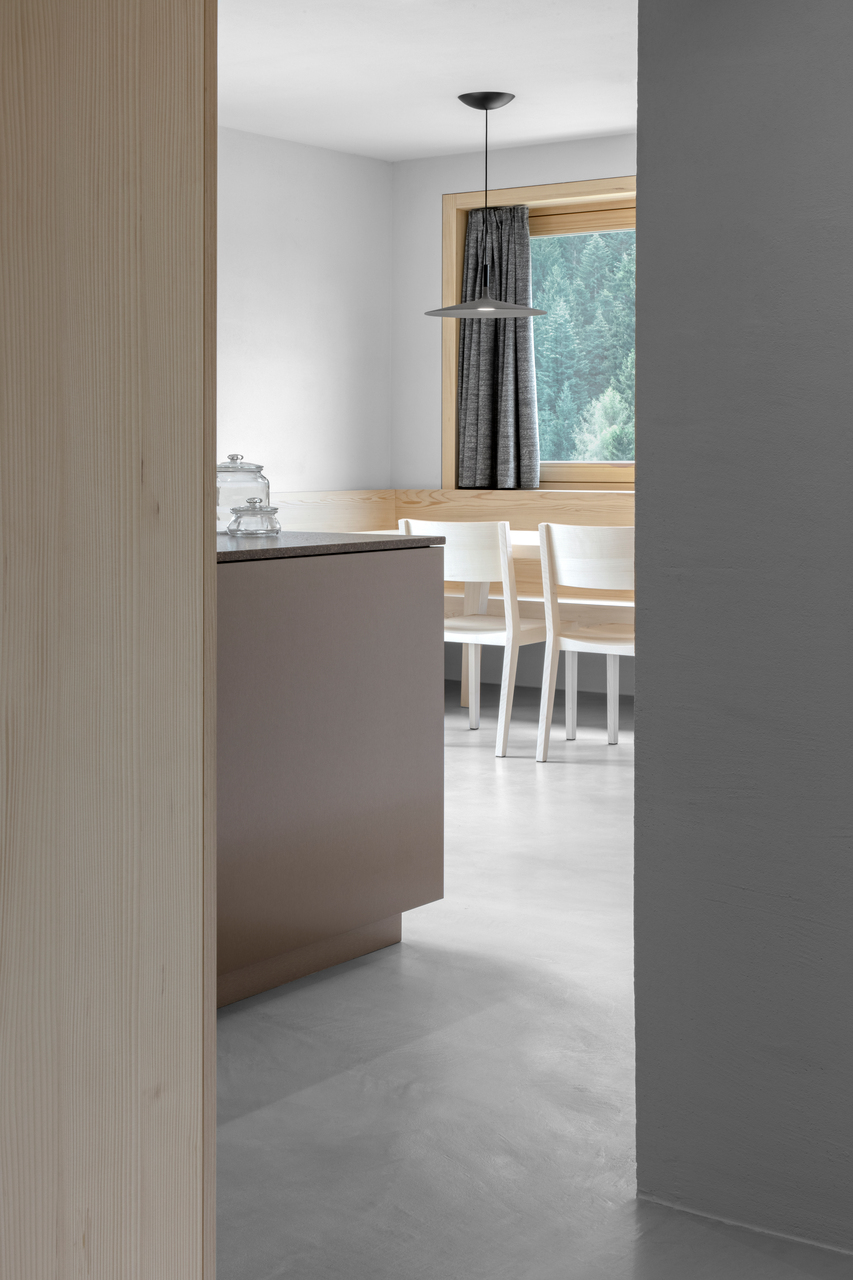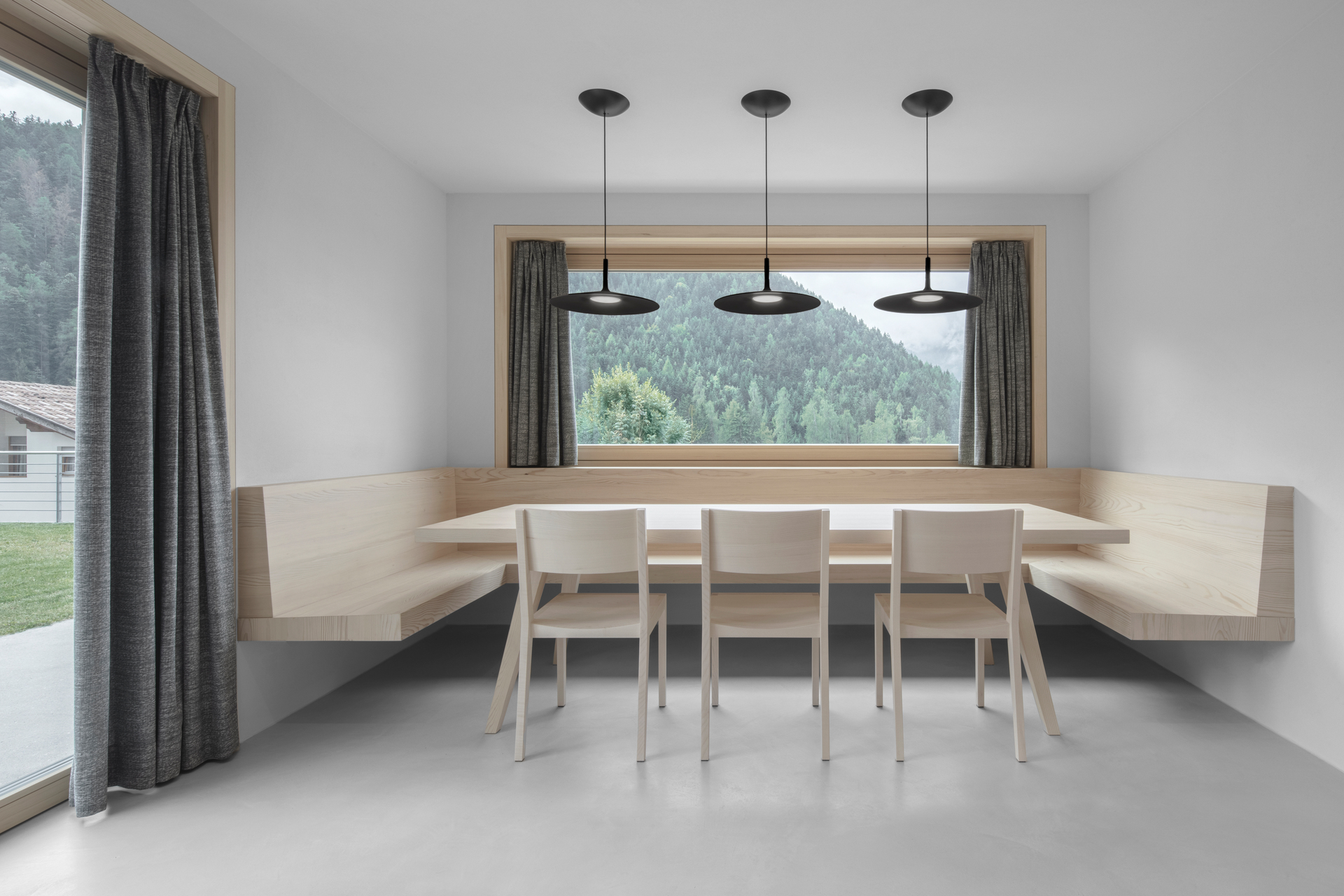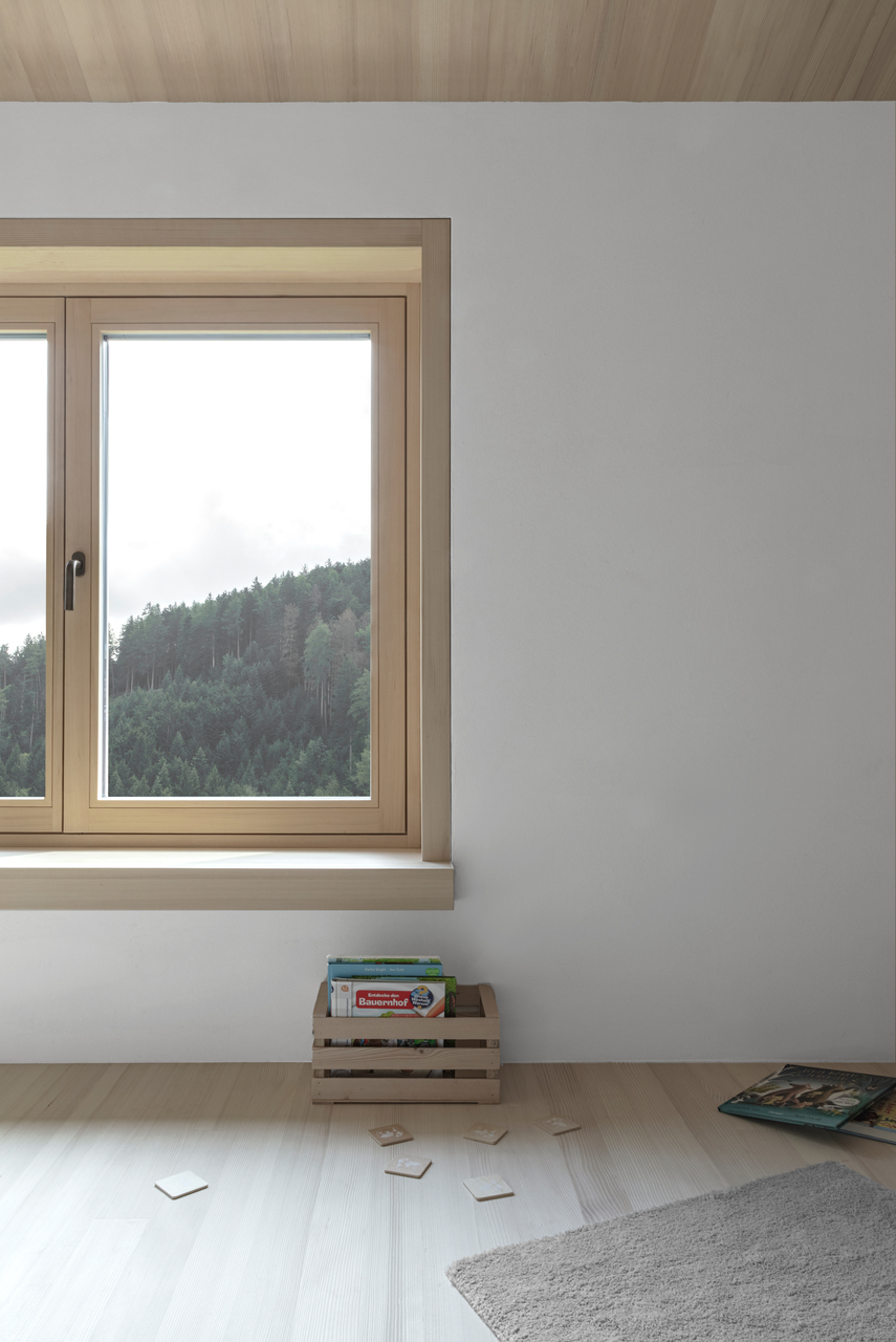 Im Erdgeschoss befinden sich die Wohnräume mit halboffenem Wohn-Ess-Kochbereich und einem Musizierraum. Nordseitig sind Hauswirtschaftsraum, Tages-WC und Abstellkammer untergebracht. Eine halbgewendelte Treppe führt in das Obergeschoss mit vier Schlafzimmern und Bad, die sich um einen kleinen, zur Belichtung nach oben und unten hin geöffneten Vorraum gruppieren. Die Klarheit des Entwurfs setzt sich im Innenraum in Form und Material fort: Sämtliche Holzelemente – Möbel, Türen, Fenster, Holzböden – sind aus heimischer Weißtanne gefertigt, alle Metallelemente, Türgriffe und Armaturen aus Bronze. Steinelemente wie etwa die Küchenplatte bestehen aus rotbraunem Porphyr. Raumprägend sind außergewöhnlich tiefe, mit Weißtanne ausgekleidete Türlaibungen ebenso wie bündig mit dem Putz ausgeführte Fensterlaibungen. Zentralen Stellenwert als typische Wohnelemente haben der Kochblock aus Bronze, rötliche Wandoberflächen und die in die Wand eingelassene Ofenbank. Wenige klare Elemente und Materialien bestimmen somit das stimmige Gesamtbild und münden in eine zeitgemäße Umsetzung ortstypischer Bautradition. (Autor: Achim Geissinger, nach einem Text der Architekten)