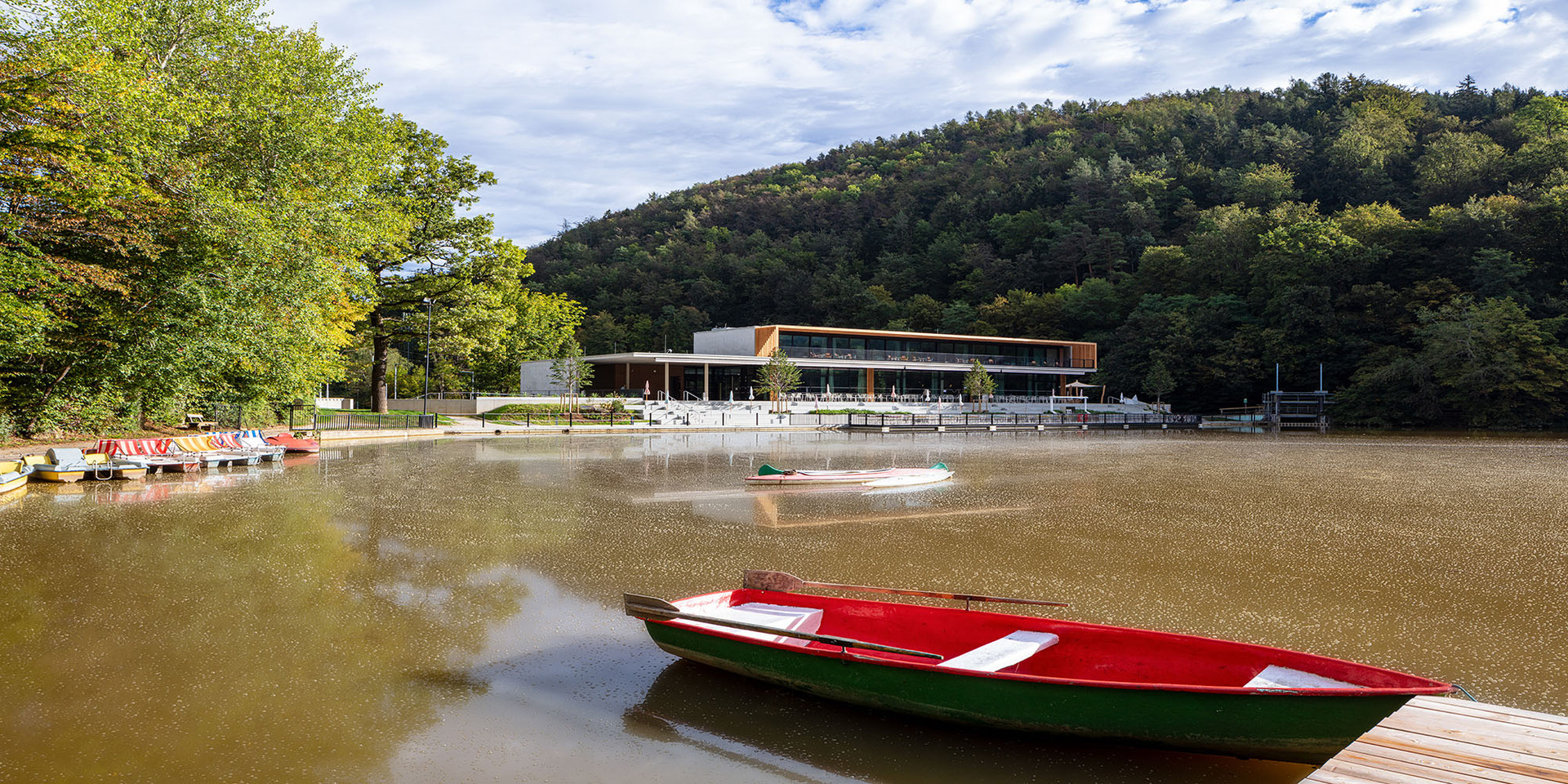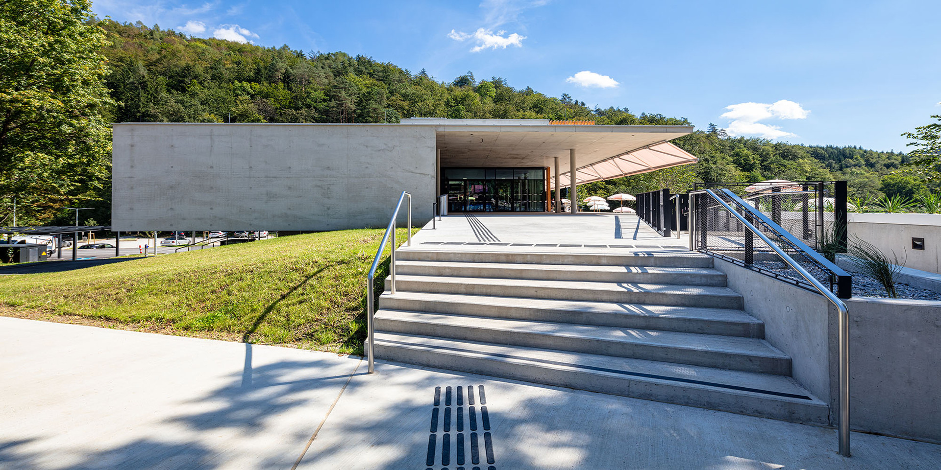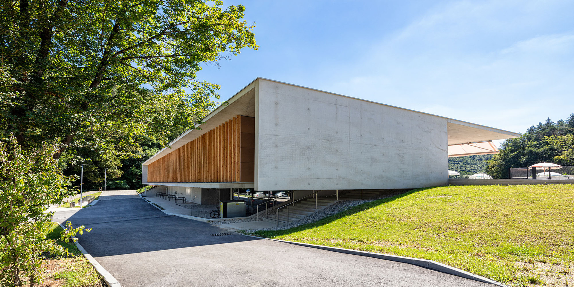 Der neue Baukörper folgt wie der Vorgängerbau parallel der Uferlinie des Sees und bleibt von der Straße abgerückt, um einem grosszügigen, multifunktionalen Vorplatz Raum zu geben. Die zum Haupteingang führende leicht geneigte Fläche bildet eine repräsentative Eingangssituation und trägt in Verbindung mit den vorgelagerten Terrassen und Erlebnisflächen zur Adressbildung bei. Straßenseitig – und vom Bus kommend – ist der direkte Ausblick zum See und in den weiteren Naturraum möglich.