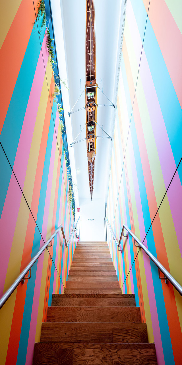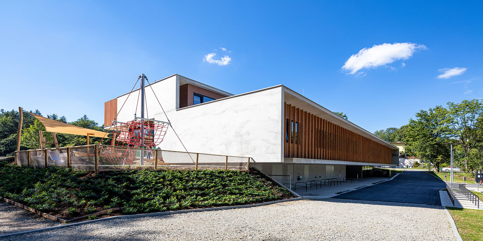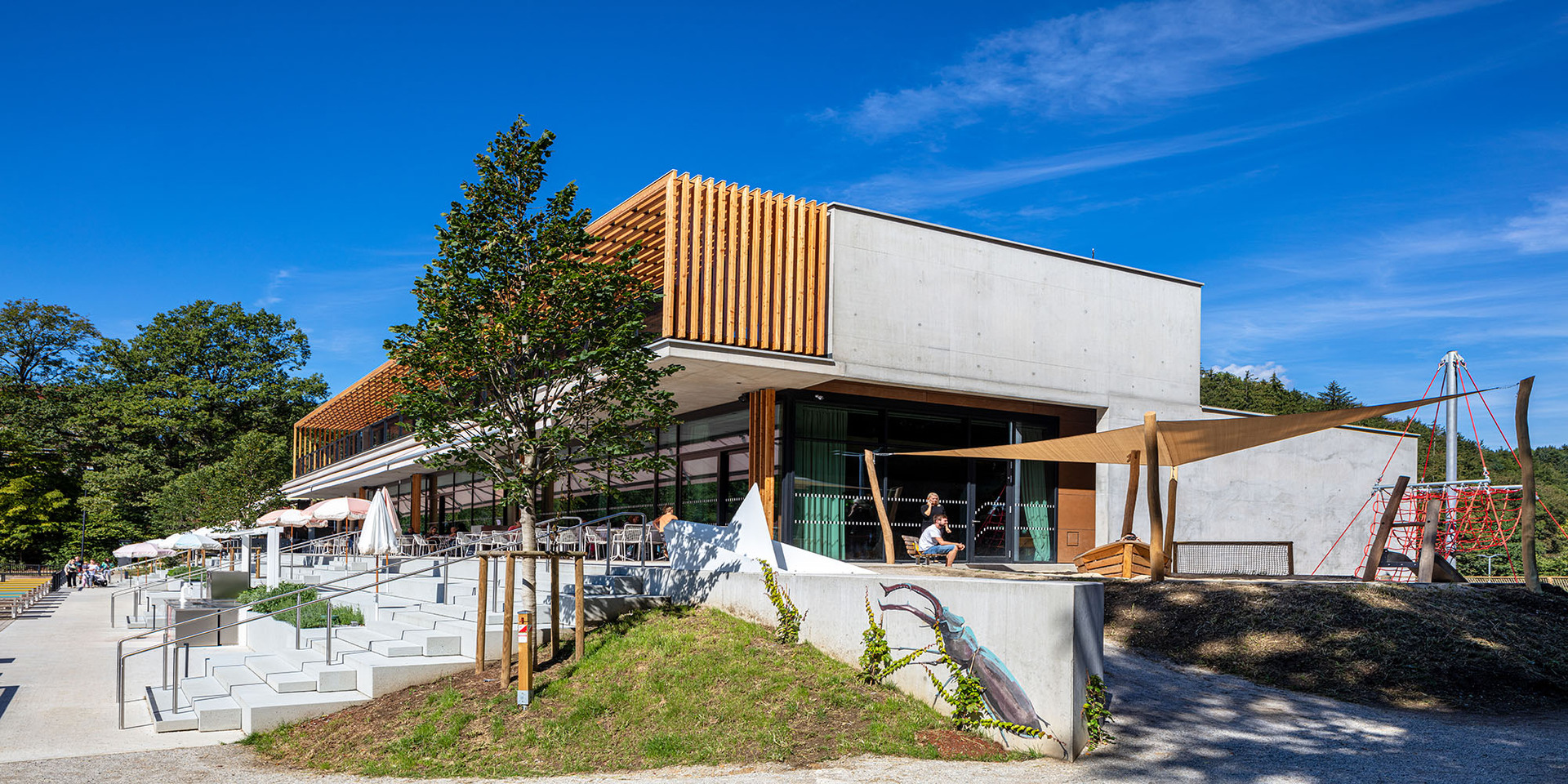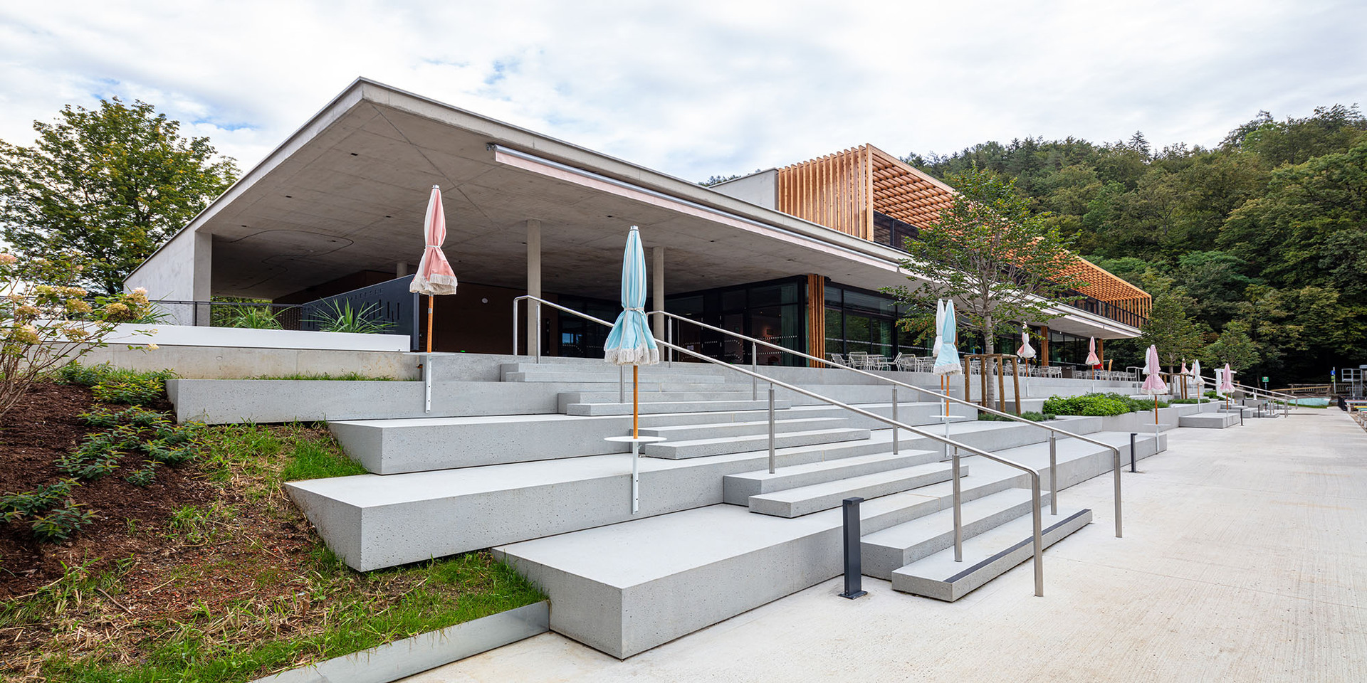 Der neue Baukörper folgt wie der Vorgängerbau parallel der Uferlinie des Sees und bleibt von der Straße abgerückt, um einem grosszügigen, multifunktionalen Vorplatz Raum zu geben. Die zum Haupteingang führende leicht geneigte Fläche bildet eine repräsentative Eingangssituation und trägt in Verbindung mit den vorgelagerten Terrassen und Erlebnisflächen zur Adressbildung bei. Straßenseitig – und vom Bus kommend – ist der direkte Ausblick zum See und in den weiteren Naturraum möglich.