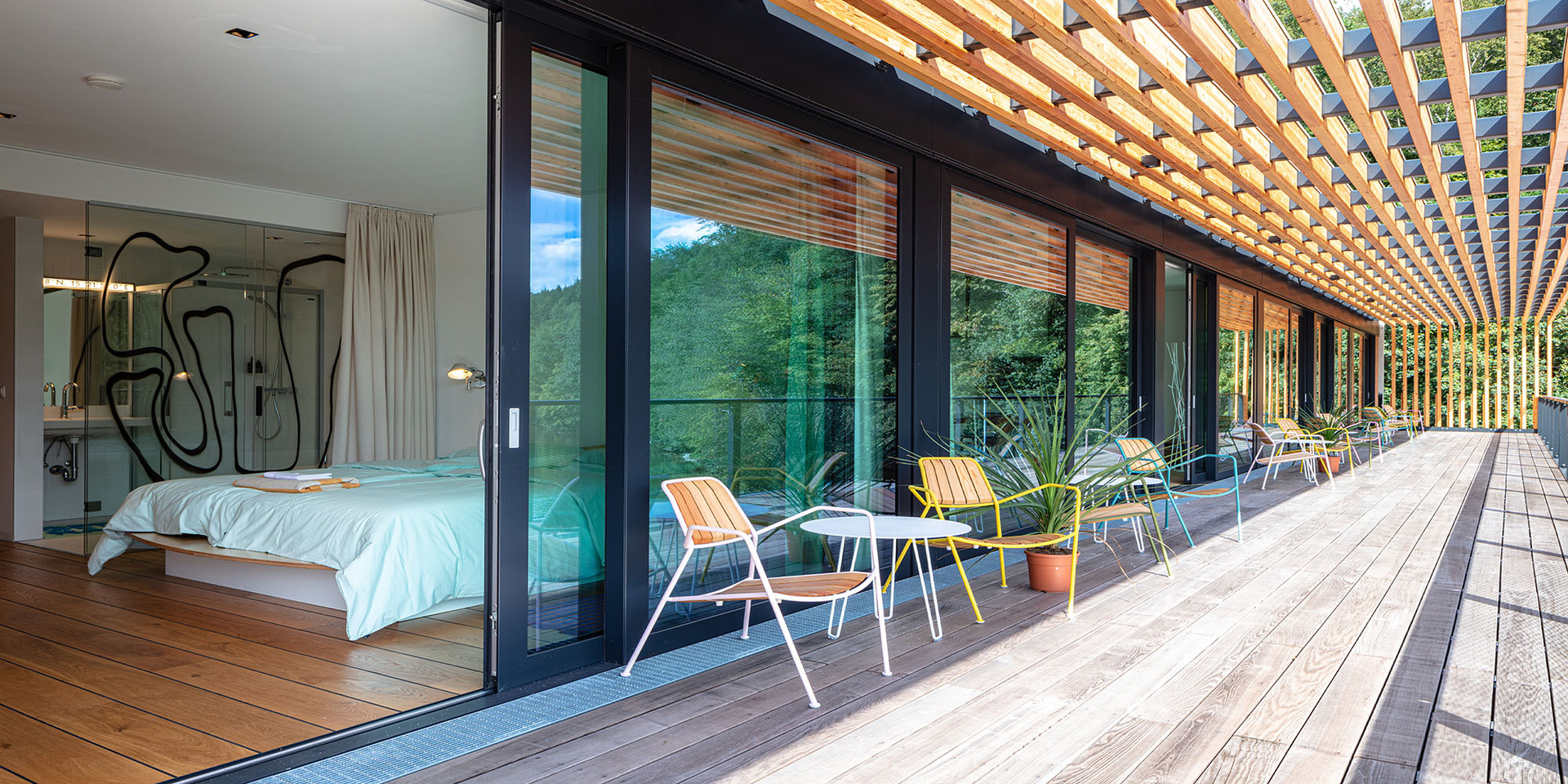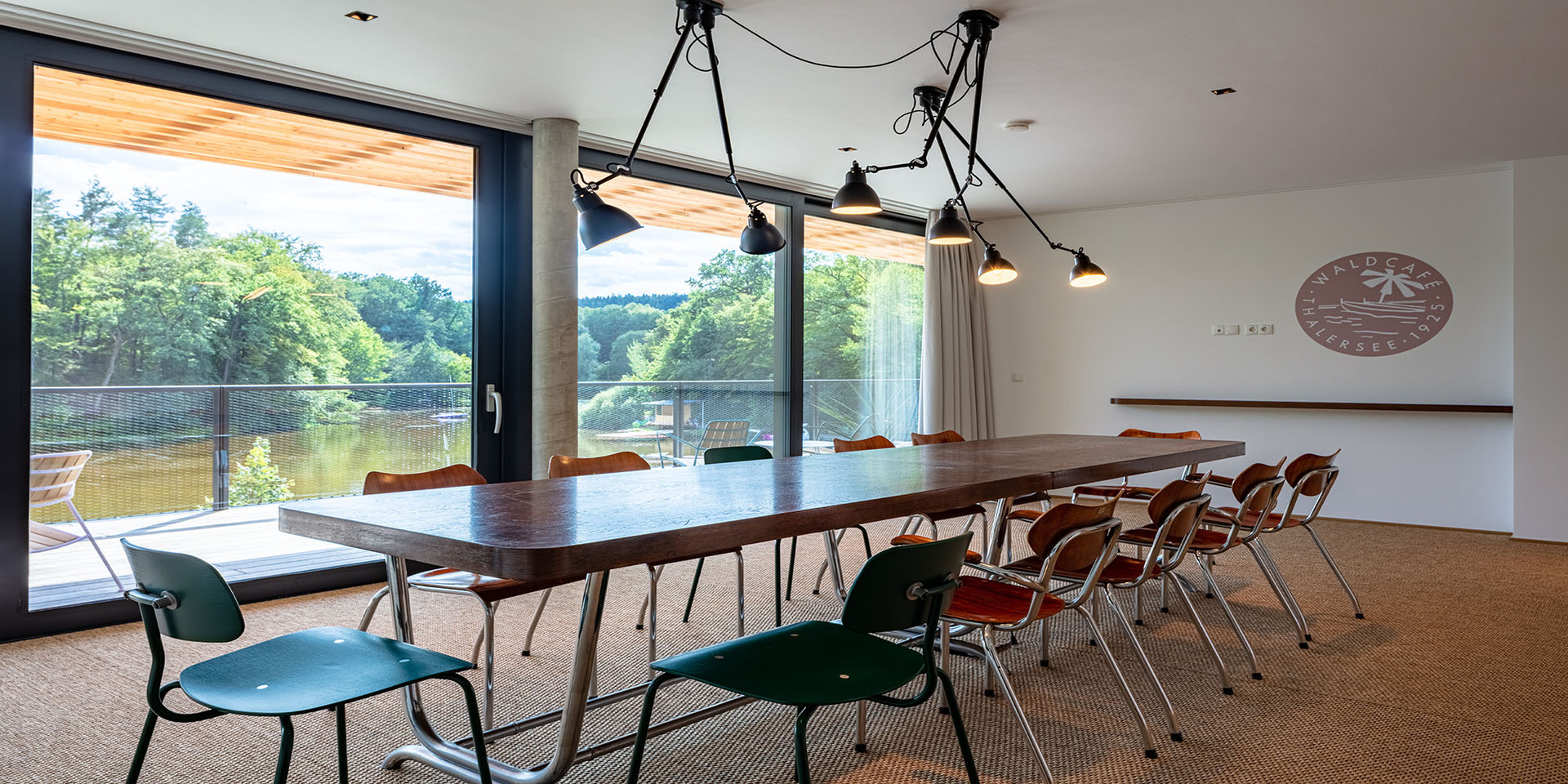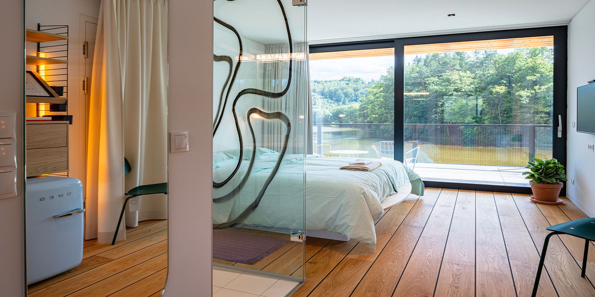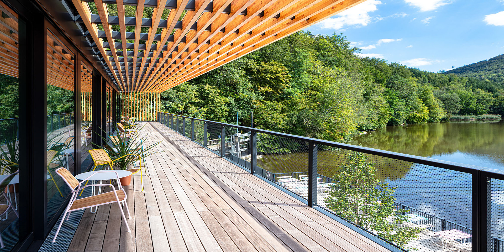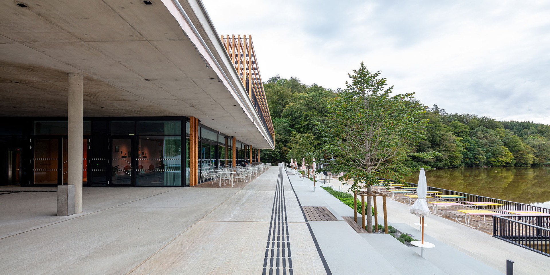 Die Gästezimmer sind als Funktionseinheit über dem Gastraum platziert und ebenfalls zum See hin ausgerichtet. Auskragende Vordachkonstruktionen in beiden Geschossen schützen und beschatten Fassaden- und Terrassenflächen, ohne den Ausblick in den Naturraum zu beeinträchtigen.