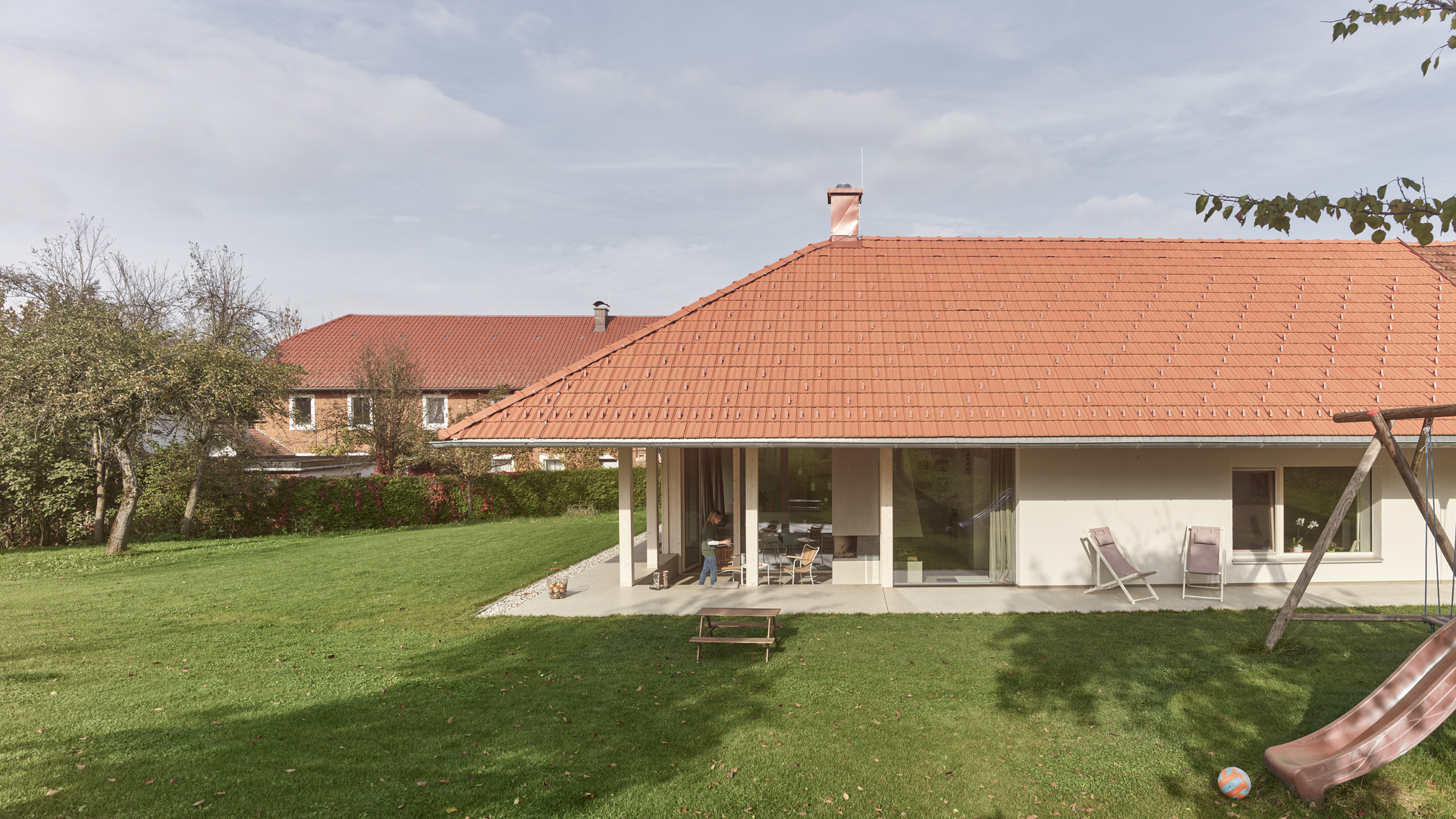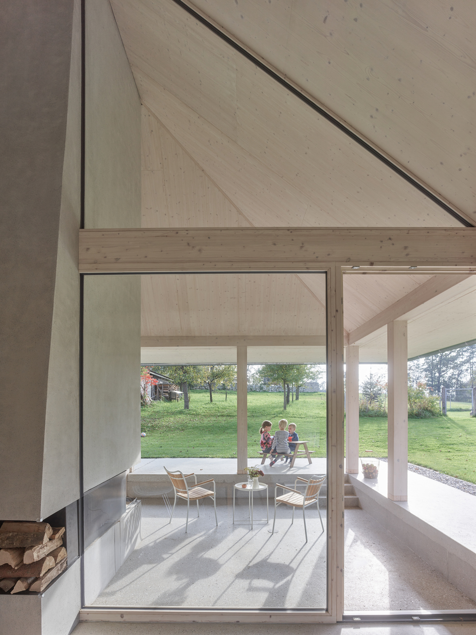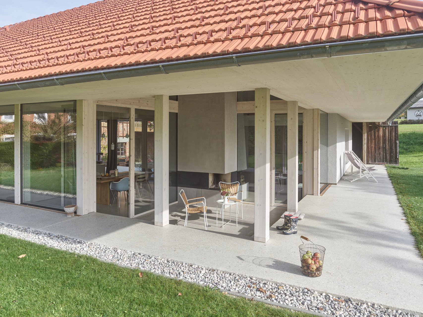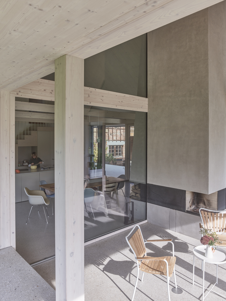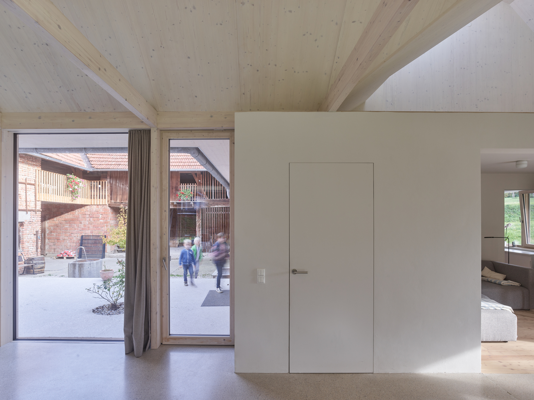 Der massive Bestand des Hofes war aufgrund des jahrzehntelangen Leerstands in so desolatem Zustand, dass er nicht mehr zu retten war. Gut nutzbar waren hingegen die Scheunen und die Wirtschaftsteile. Der Großteil des maroden Gemäuers wurde abgetragen, die Anlage um zwei massive Wohntrakte ergänzt. Zwischen ihnen spannt das Dach hoch über den Wohnraum mit dem Essbereich, bietet Luft und Helligkeit. Herzstück ist der offene Kamin, der zugleich zur räumlichen Zonierung dient. Die funktionalen Nebenräume, wie Schlafen, Badezimmer, WC und Abstellräume sind als privatere Bereiche zum Wirtschaftstrakt nach Nordwesten orientiert. Der bestehende Innenhof blieb auch nach dem Umbau in seiner vertrauten Form erhalten. Er verbindet sich über den Wohnraum mit dem Garten an der Südseite.