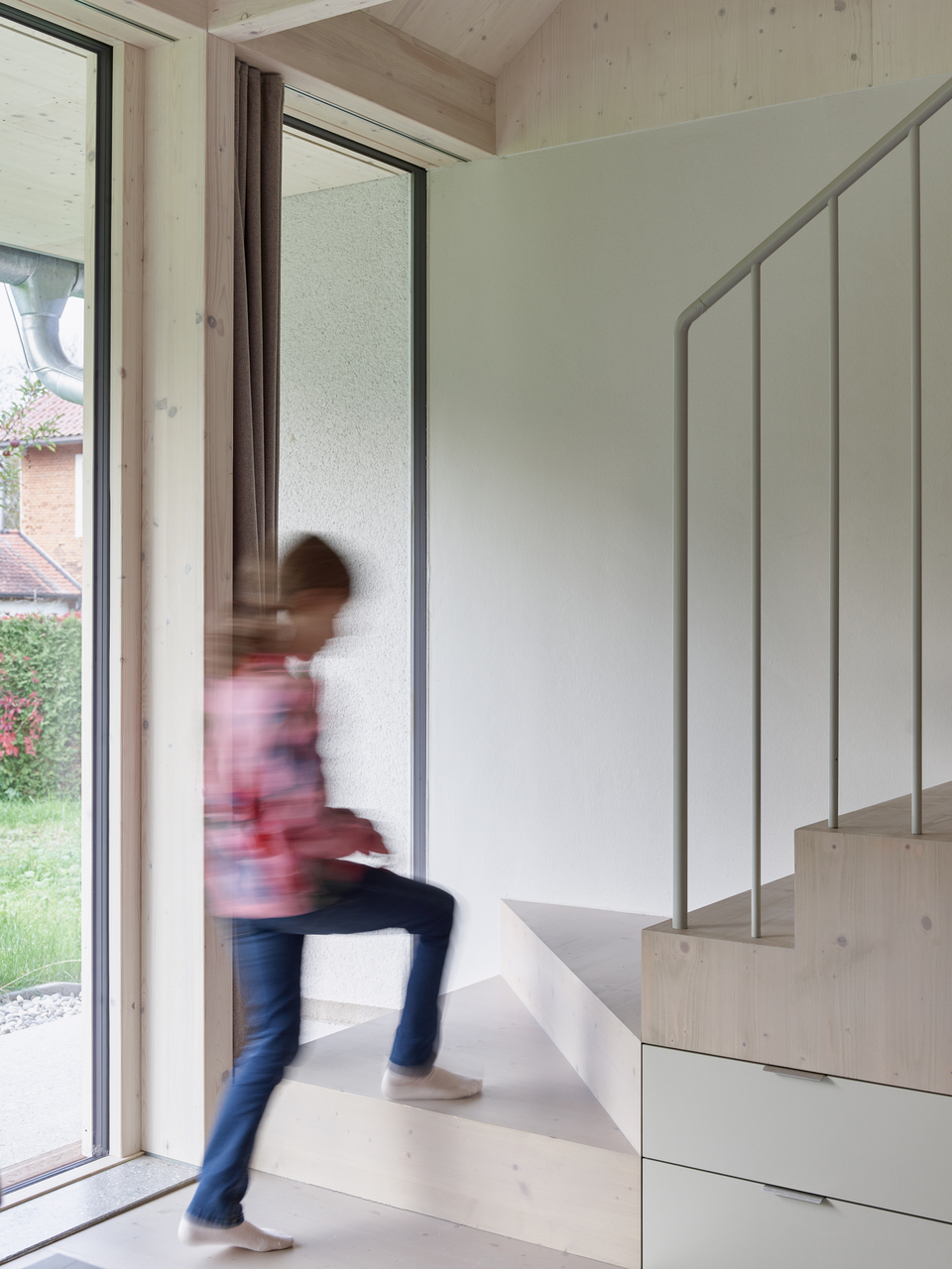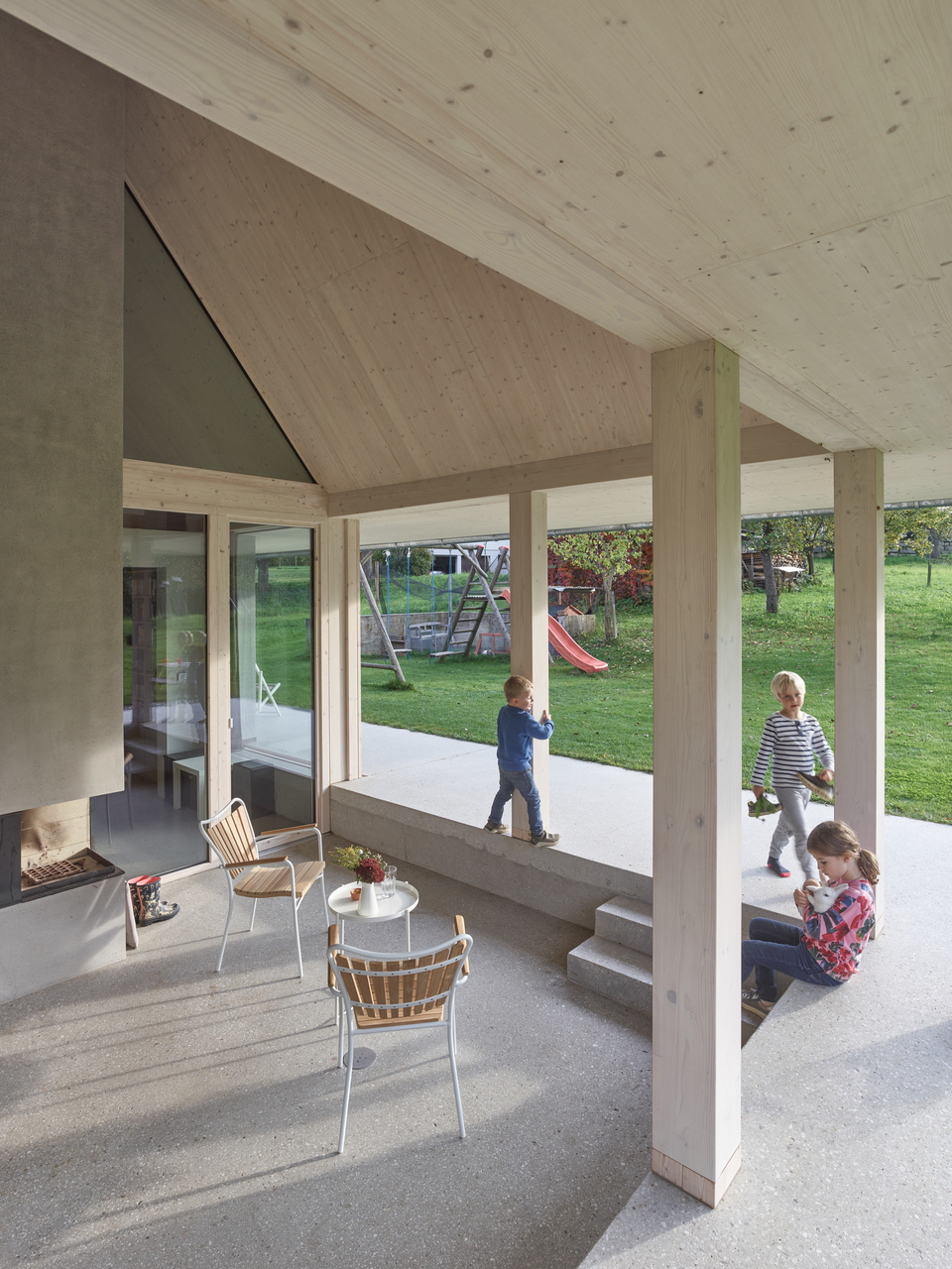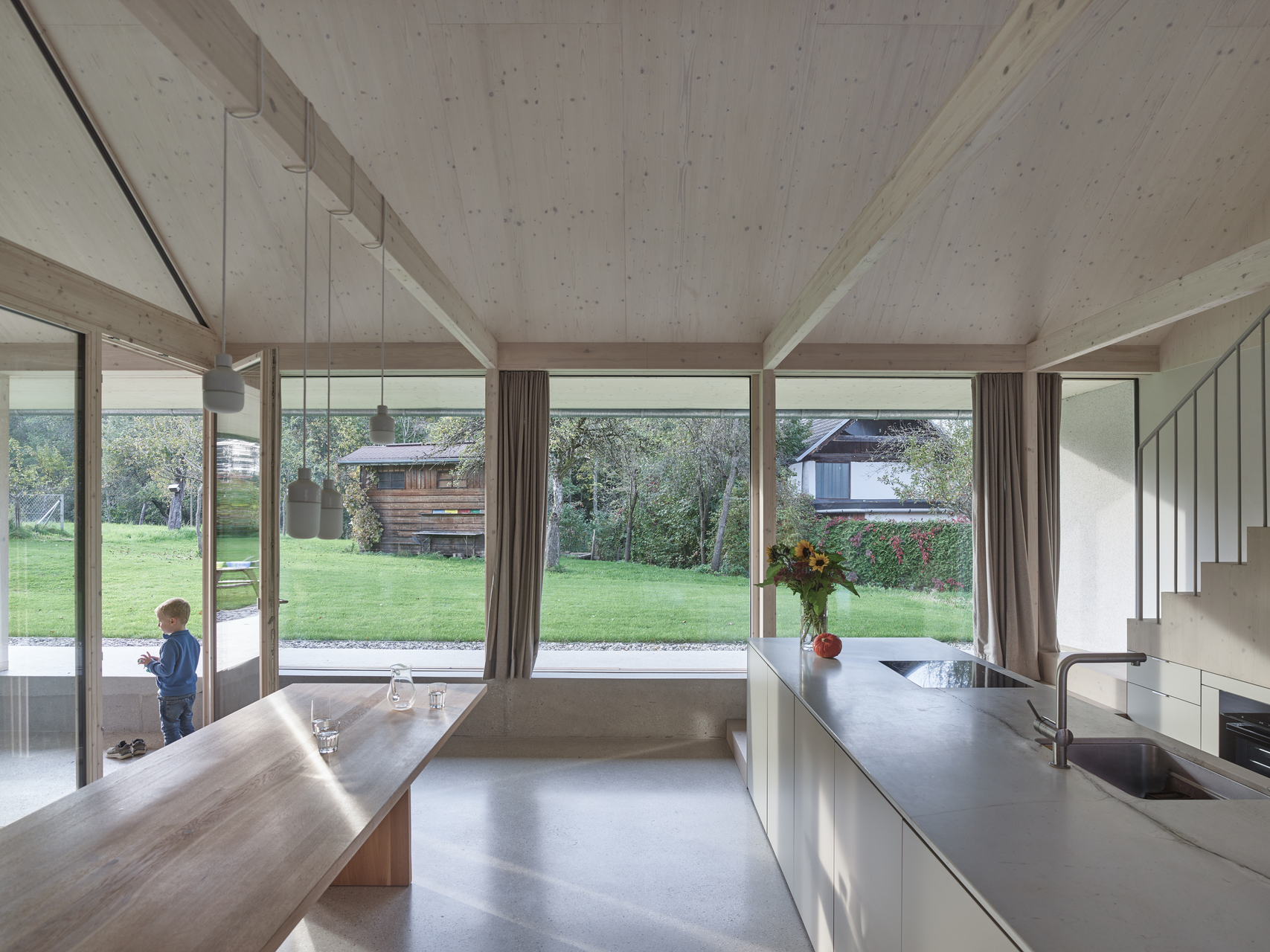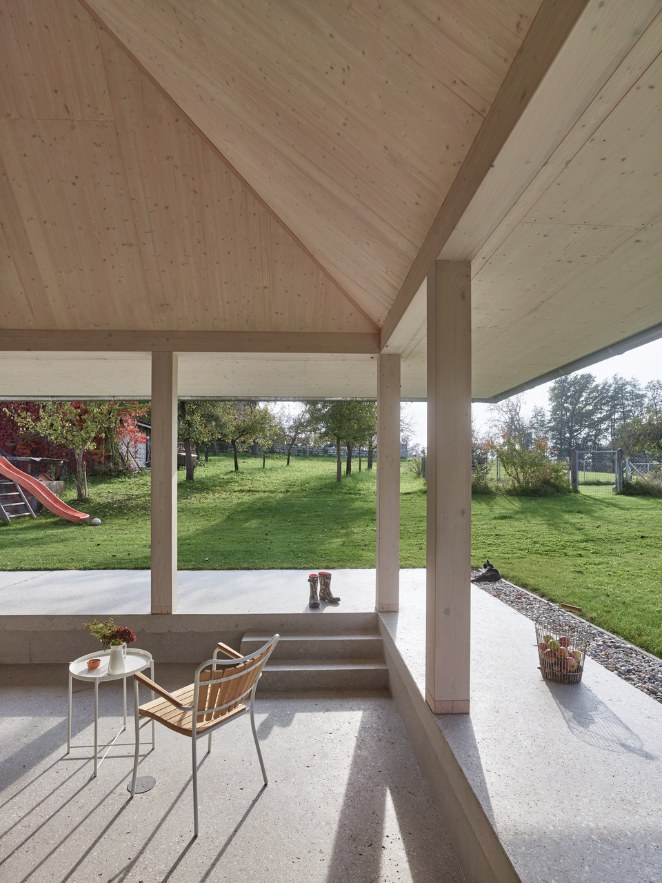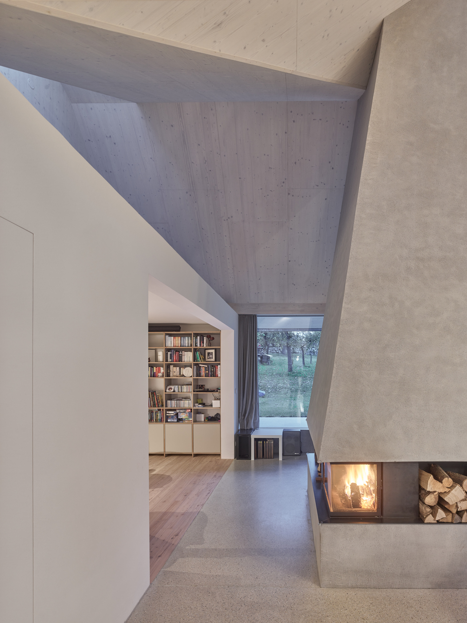 Der massive Bestand des Hofes war aufgrund des jahrzehntelangen Leerstands in so desolatem Zustand, dass er nicht mehr zu retten war. Gut nutzbar waren hingegen die Scheunen und die Wirtschaftsteile. Der Großteil des maroden Gemäuers wurde abgetragen, die Anlage um zwei massive Wohntrakte ergänzt. Zwischen ihnen spannt das Dach hoch über den Wohnraum mit dem Essbereich, bietet Luft und Helligkeit. Herzstück ist der offene Kamin, der zugleich zur räumlichen Zonierung dient. Die funktionalen Nebenräume, wie Schlafen, Badezimmer, WC und Abstellräume sind als privatere Bereiche zum Wirtschaftstrakt nach Nordwesten orientiert. Der bestehende Innenhof blieb auch nach dem Umbau in seiner vertrauten Form erhalten. Er verbindet sich über den Wohnraum mit dem Garten an der Südseite.