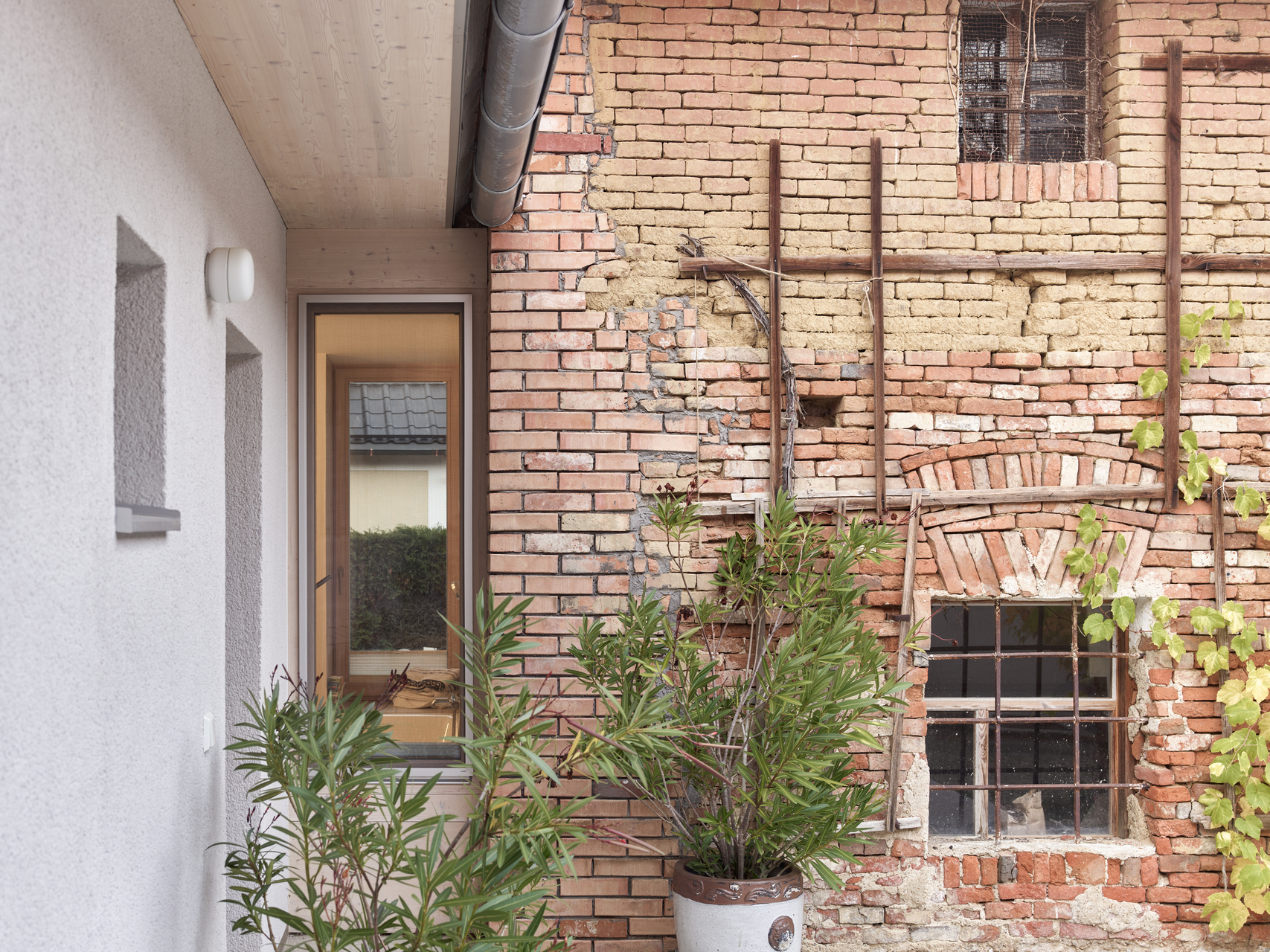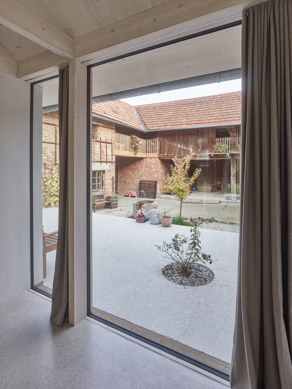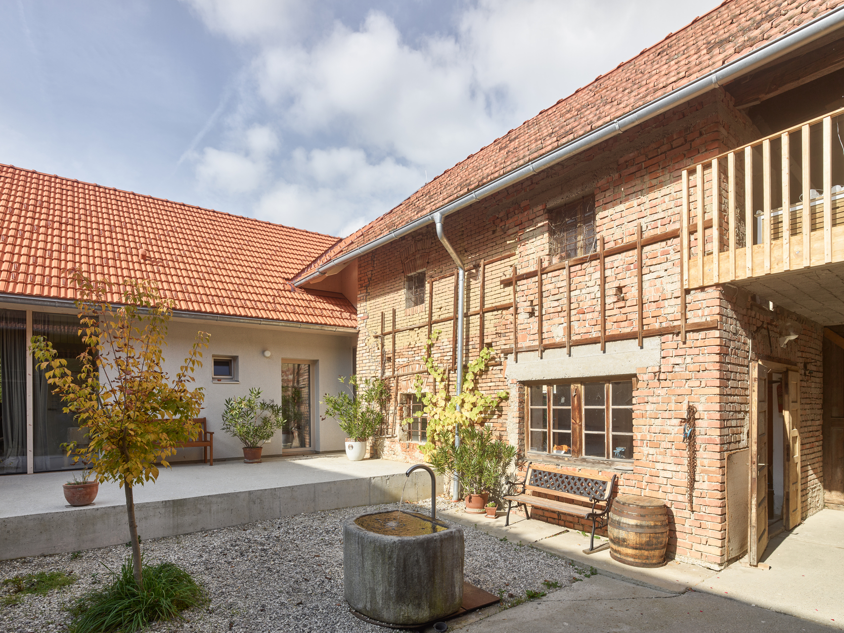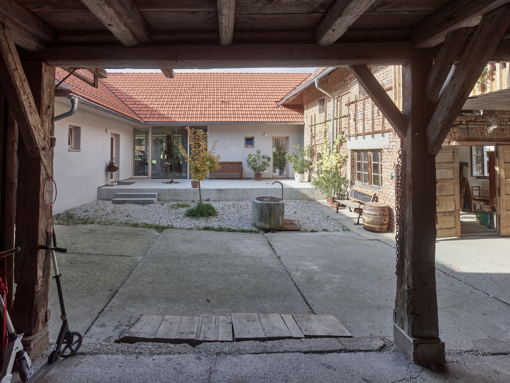Für die Sanierung ist der Umgang mit gegebenen beziehungsweise geerbten Materialien von wesentlicher Bedeutung. Die Substanz wurde, wo nötig, bereinigt, bauliche Eigenschaften und Funktionen wurden sichtbar gemacht. Es galt, den alten Teil des Hofes bestmöglich zu erhalten und seinen Charme wirken zu lassen. So ergibt sich eine Selbstverständlichkeit im Bestand, die im Neubau in ästhetisch wirksamer Kontrastierung weiterwirkt. (Text: Architekt:innen, bearbeitet)