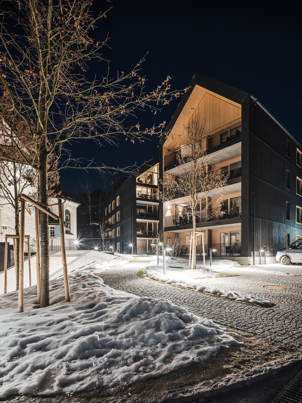 Die Gebäudehülle aus dunkel gefärbten Holzlamellen interpretiert das traditionelle Montafoner Haus neu. Die Fenster mit Rahmen und Laibungen aus hellem Holz sind je nach Raumnutzung bündig oder zurückversetzt angeordnet, wodurch die Fassade aufgelockert wird. Geräumige Loggien, Terrassen und großzügige Öffnungen an den Stirnseiten der Gebäude schaffen einen direkten Bezug zu den nahen Berghängen des Montafons.