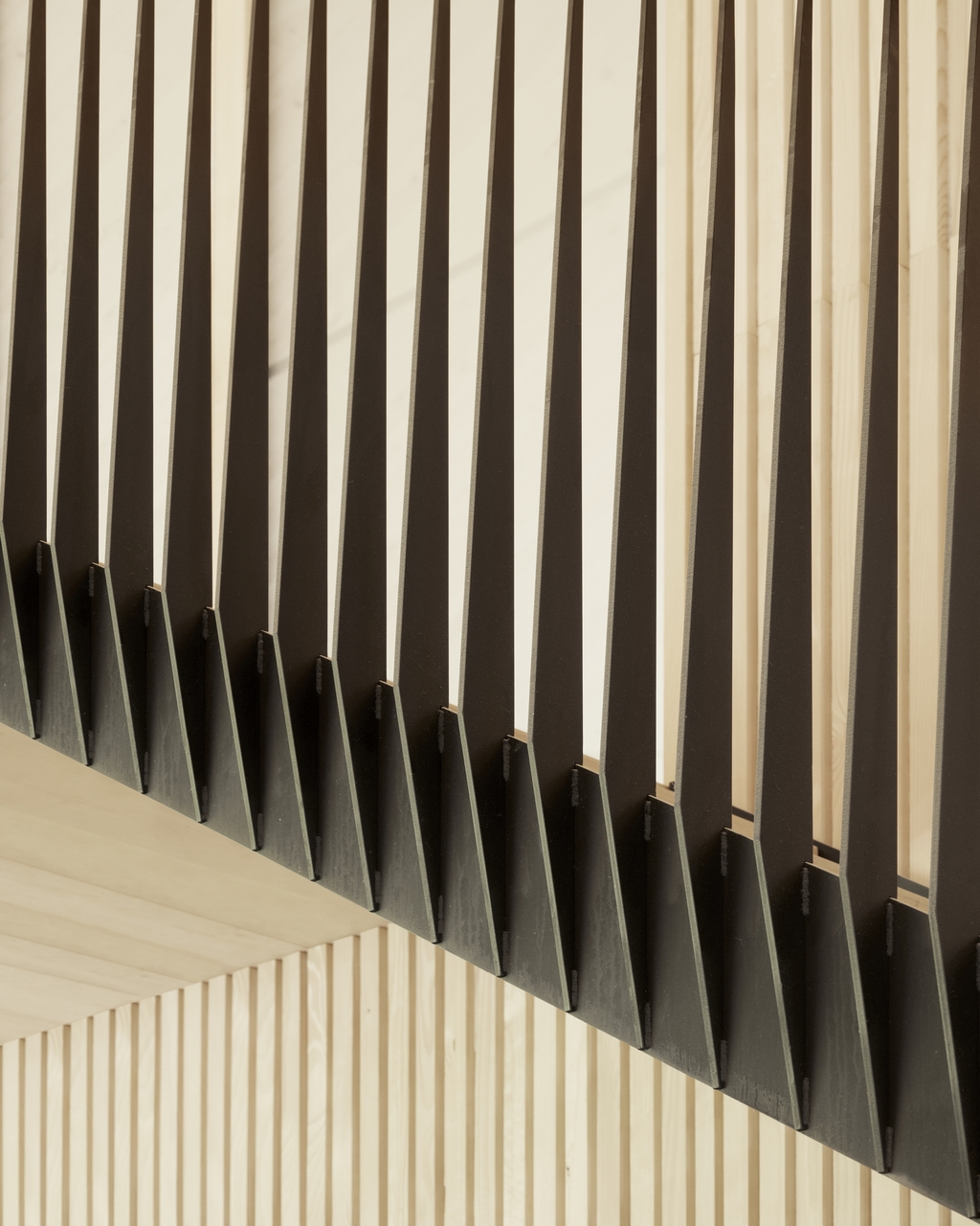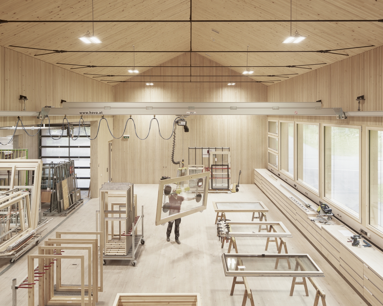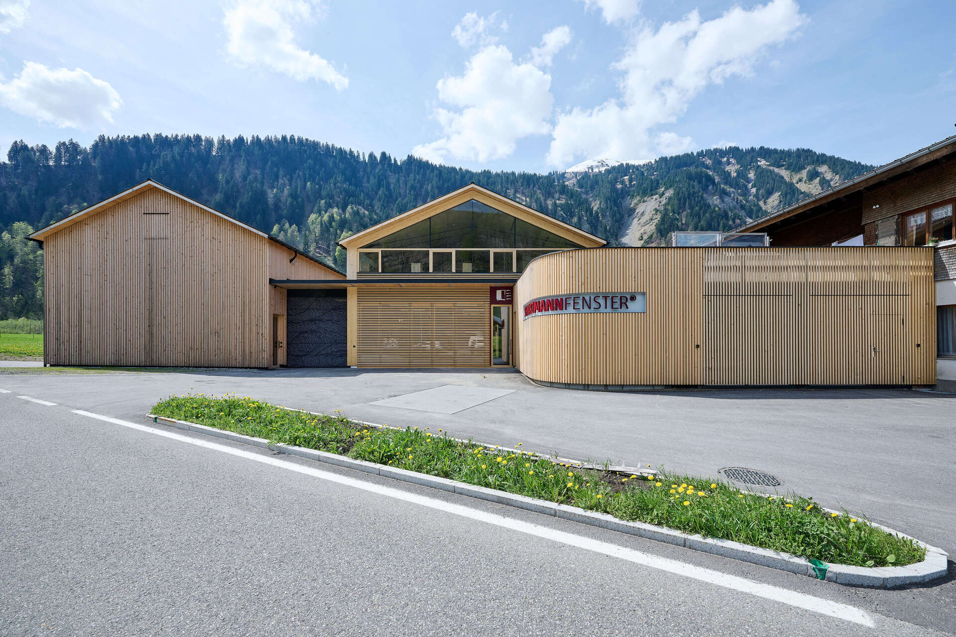 Die freitragende Dachkonstruktion ist als sichtbare, sich gegenseitig stützende Diagonaldübeldecke mit zinkenartiger Verzahnung am First ausgeführt. Die Zugkräfte werden durch eine filigrane, gespreizte Rundstahl-Unterspannung aufgenommen. Die Hauptstützen gliedern das ostseitige Kastenfenster (mit Blick zur Üntschenspitze), das außen als fassadenbündige Einscheiben-Ganzglaskonstruktion ausgeführt ist und innen durch großformatige Holzflügel ergänzt wird. Die Verschattung ist im wettergeschützten Zwischenraum untergebracht. Die Wände sind innenseitig mit Holzlatten beplankt, die offenen Fugen mit schallabsorbierendem Material hinterlegt. Die Fassaden sind als Deckelschirmkonstruktion mit quadratischem Deckel (40/40 mm) ausgeführt. Die Tiefendimension des Deckels verstärkt den reliefartigen Charakter und ermöglicht bei den großen Toren und den Geländerbereichen eine offene und lichtdurchlässige Ausführung ohne Strukturwechsel. Das große Tor der An- und Auslieferung zwischen den Hauptbaukörpern ist mit einem dezent bedruckten Screen bespannt, der die Firmenphilosophie künstlerisch verarbeitet und interpretiert (Gestaltung Anita Lehner).