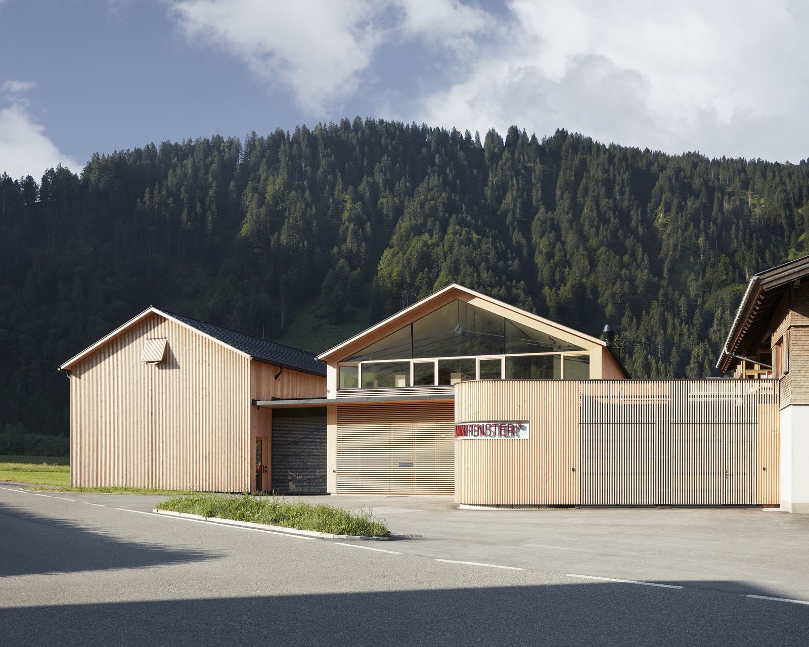 Die Dacheindeckung in ortsüblicher dunkler Farbe wird durch komplett integrierte Photovoltaik-Solardachplatten unauffällig ergänzt. Kurz nach der Fertigstellung des beschriebenen ostseitigen Zubaus kam es durch einen technischen Defekt der CNC-Anlage zu einem Brand im mittleren Bestandsgebäude, der zu einem Totalschaden führte. Innerhalb kürzester Zeit wurde ein Ersatzbau analog zum ostseitigen Konstruktionsprinzip auf den bestehenden Keller aufgesetzt und somit eine stimmige Gesamtlösung realisiert. (Text: Architekten, bearbeitet)