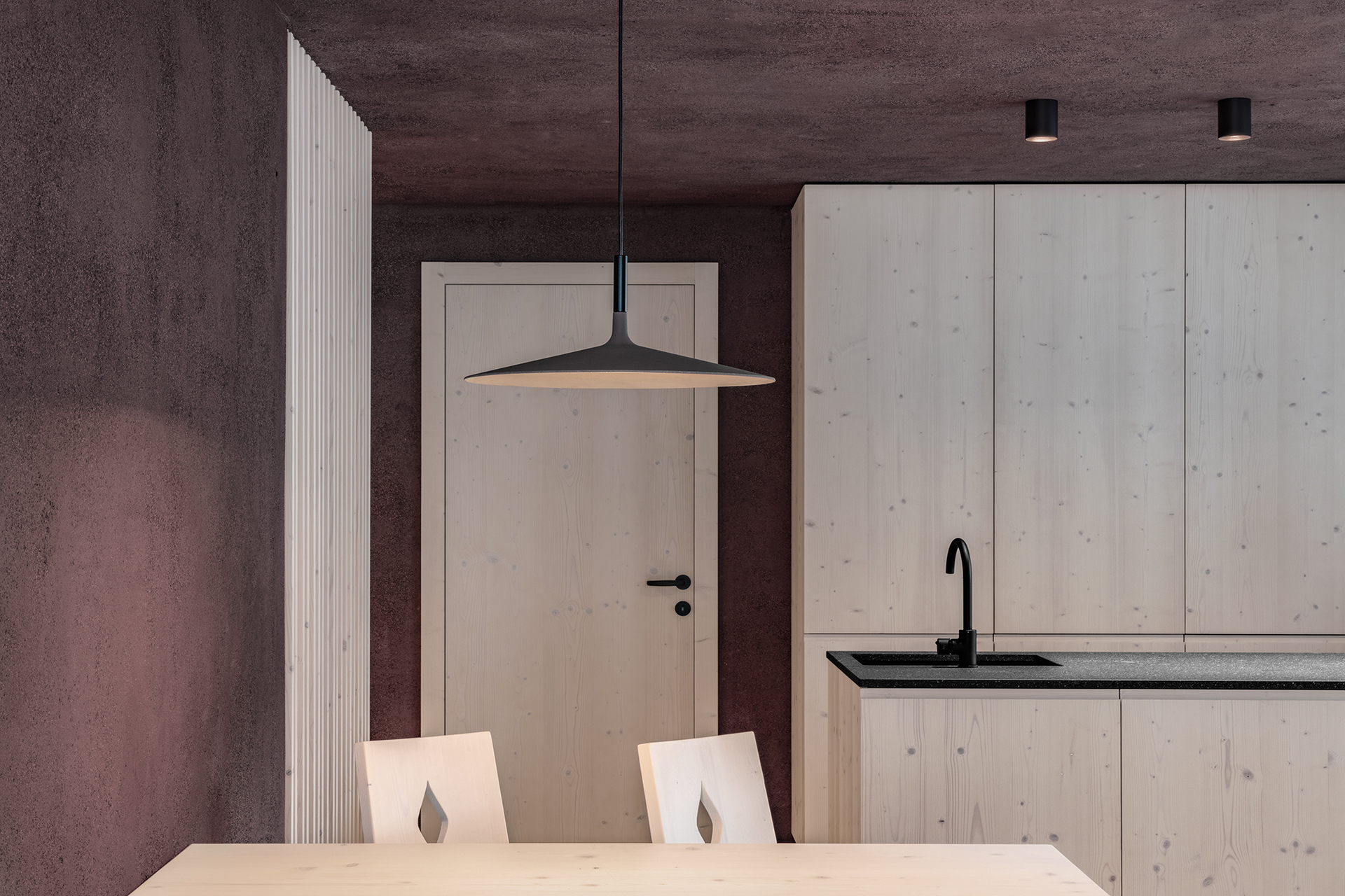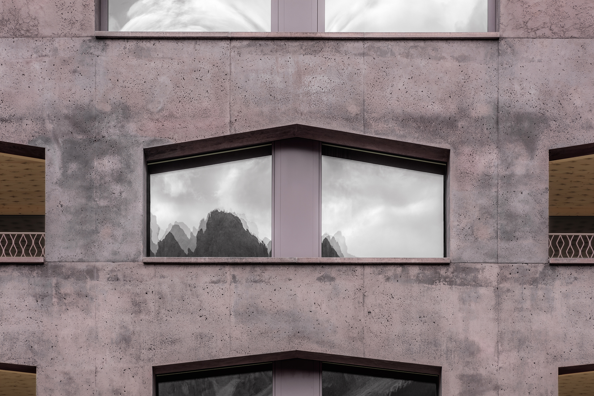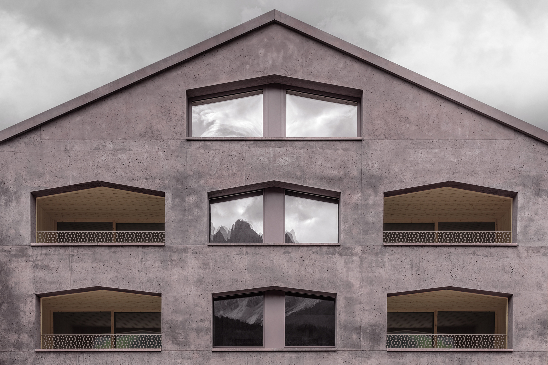 In den darüberliegenden Geschossen entstanden sieben hochwertige, allesamt mindestens zweiseitig orientierte Ferienwohnungen, die jeweils über eine eigene Loggia verfügen und nach Art einer Theaterloge spektakulären Blick auf die Dolomiten bieten.