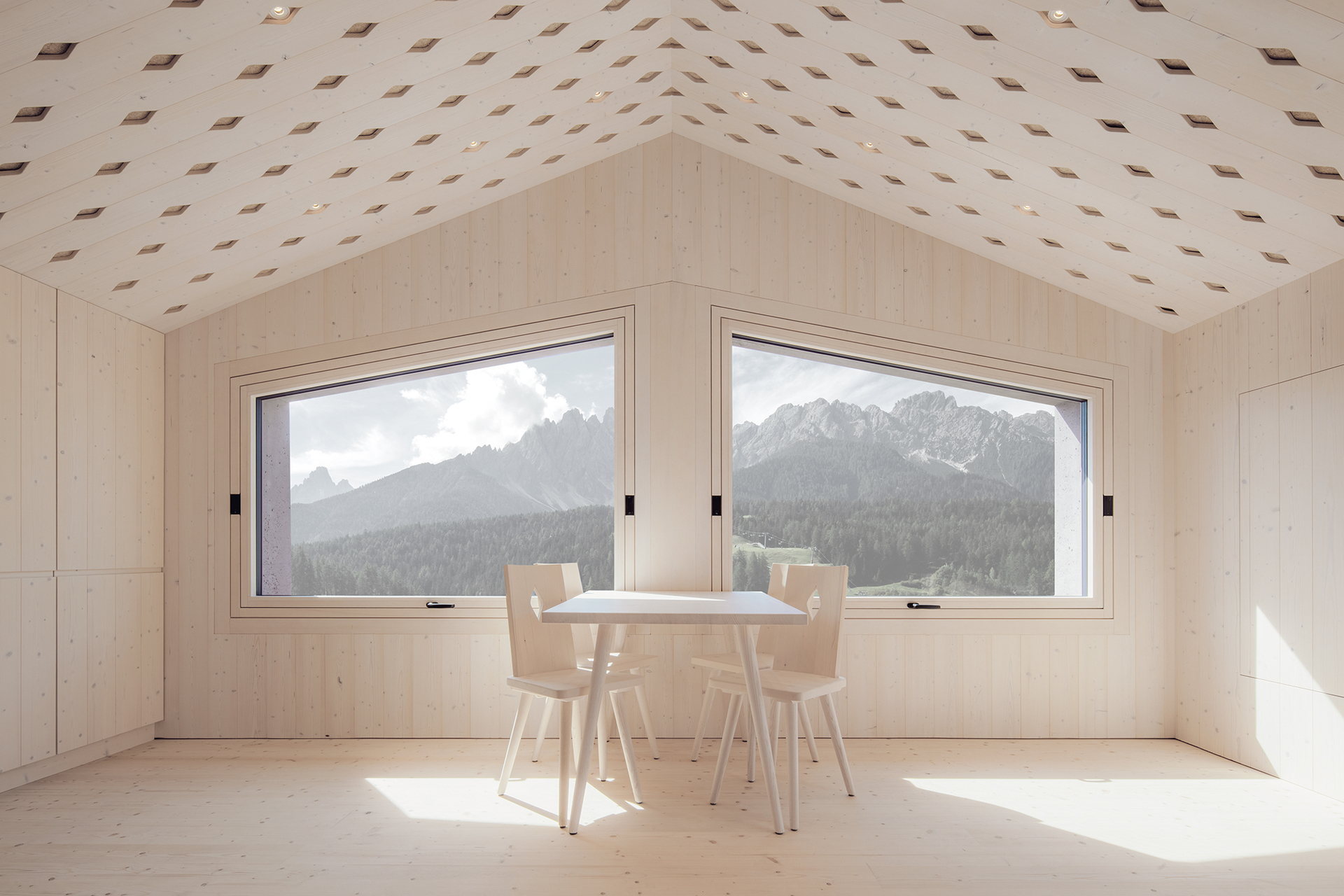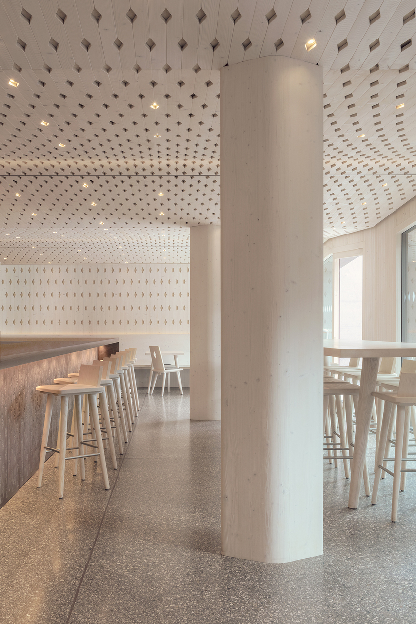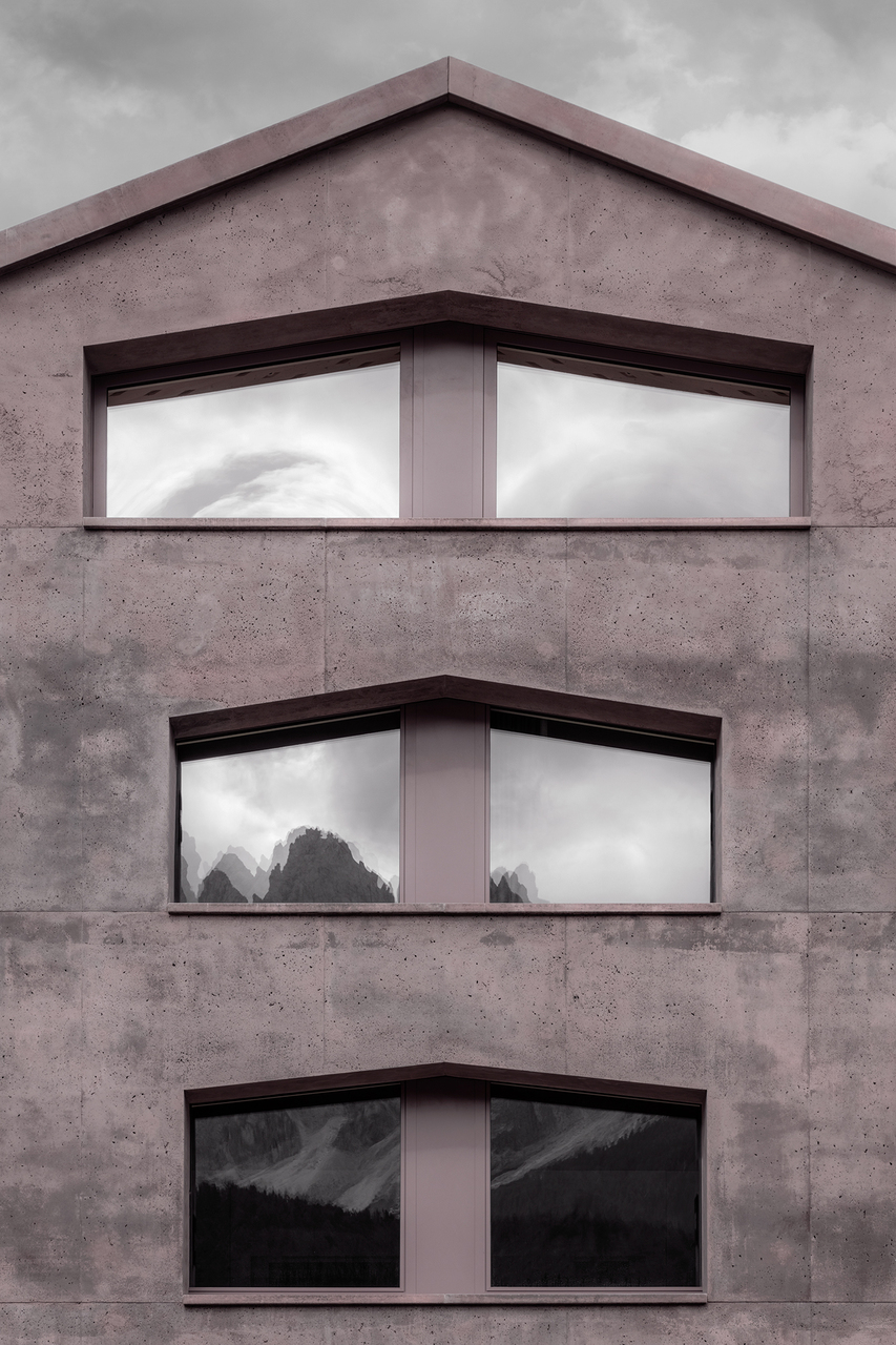 Die rautenförmige, tropfenartige Ornamentik zieht sich durch Restaurant und Penthouse und stellt, ausgehend vom Gedanken einer „veredelten Stube“, einen Traditionsbezug her. Aus der Fichtenvertäfelung herausgeschnitten, übernimmt es Aufgaben der Beleuchtung, Akustik und Belüftung. Auch die verwendeten Materialien spiegeln die Geschichte des Orts wider. Der Einsatz regionaler Hölzer wie unbehandelte Fichte und wohlriechende Zirbe steht im handwerklichen Einklang mit handgefertigten Terrazzoböden, Putzen und Dachplatten. Als raumseitige, akustisch wirksame Dämmstoffe kamen Hanf und Schafswolle zum Einsatz. Die bräunlich eingefärbte Dämmbetonfassade aus Leichtbeton mit Blähton verweist in Farbe und Körnung auf den ortstypischen Sextner Bachstein, aus dem im nächsten Umkreis viele historische Bauwerke errichtet wurden – darunter die Stiftskirche aus dem 12. Jahrhundert. (Autor: Achim Geissinger, nach einem Text der Architekten)