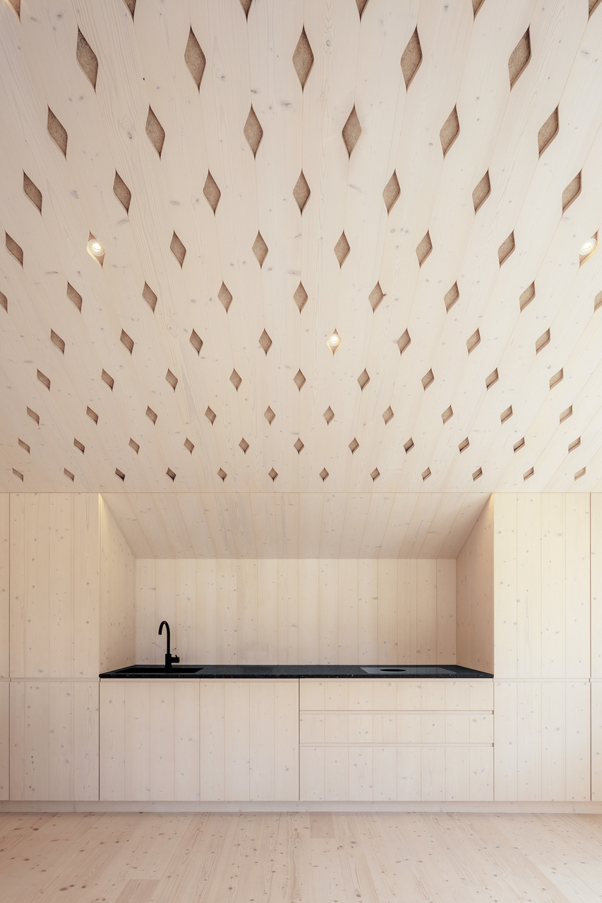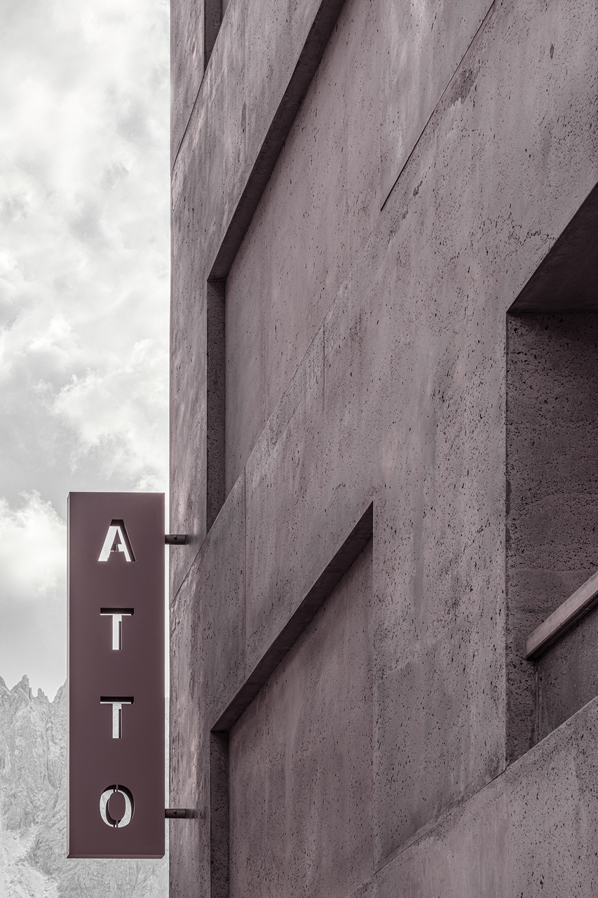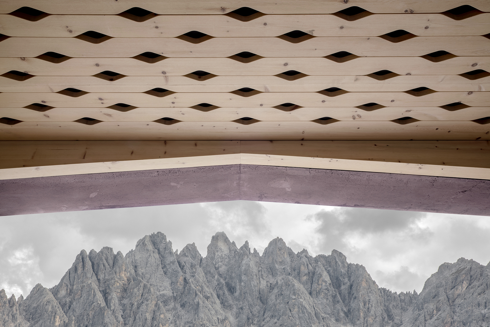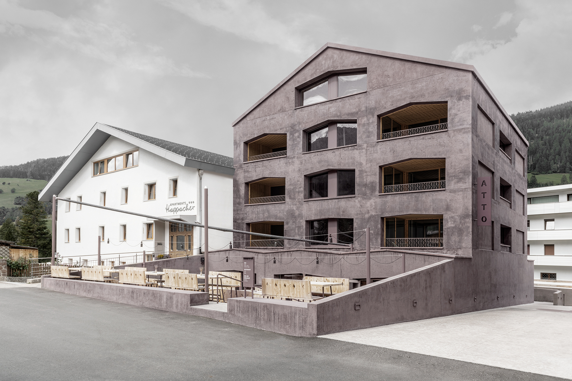 Die rautenförmige, tropfenartige Ornamentik zieht sich durch Restaurant und Penthouse und stellt, ausgehend vom Gedanken einer „veredelten Stube“, einen Traditionsbezug her. Aus der Fichtenvertäfelung herausgeschnitten, übernimmt es Aufgaben der Beleuchtung, Akustik und Belüftung. Auch die verwendeten Materialien spiegeln die Geschichte des Orts wider. Der Einsatz regionaler Hölzer wie unbehandelte Fichte und wohlriechende Zirbe steht im handwerklichen Einklang mit handgefertigten Terrazzoböden, Putzen und Dachplatten. Als raumseitige, akustisch wirksame Dämmstoffe kamen Hanf und Schafswolle zum Einsatz. Die bräunlich eingefärbte Dämmbetonfassade aus Leichtbeton mit Blähton verweist in Farbe und Körnung auf den ortstypischen Sextner Bachstein, aus dem im nächsten Umkreis viele historische Bauwerke errichtet wurden – darunter die Stiftskirche aus dem 12. Jahrhundert. (Autor: Achim Geissinger, nach einem Text der Architekten)