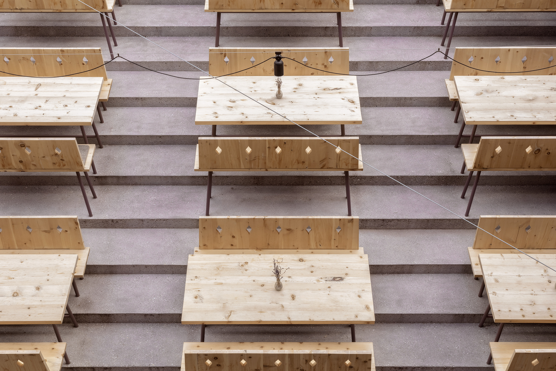 Im Erdgeschoss nutzt ein Restaurantbetrieb mit Farm-to-table-Konzept den in Richtung des Hochgebirgspanoramas angelegten und in Stufen zum Haus hin absinkenden Gastgarten. Eine neue Wegeverbindung verknüpft ihn direkt mit der Fußgängerzone.