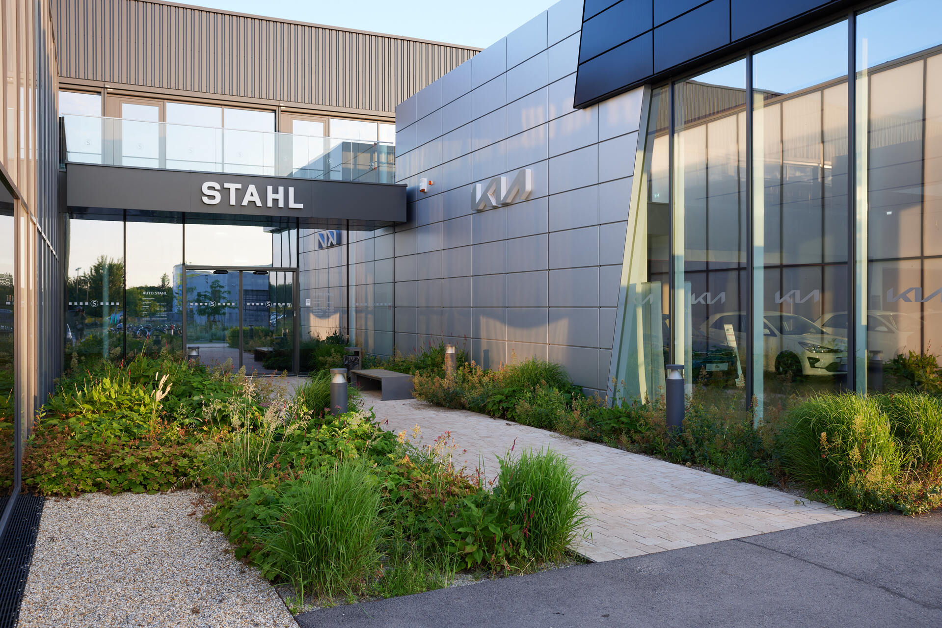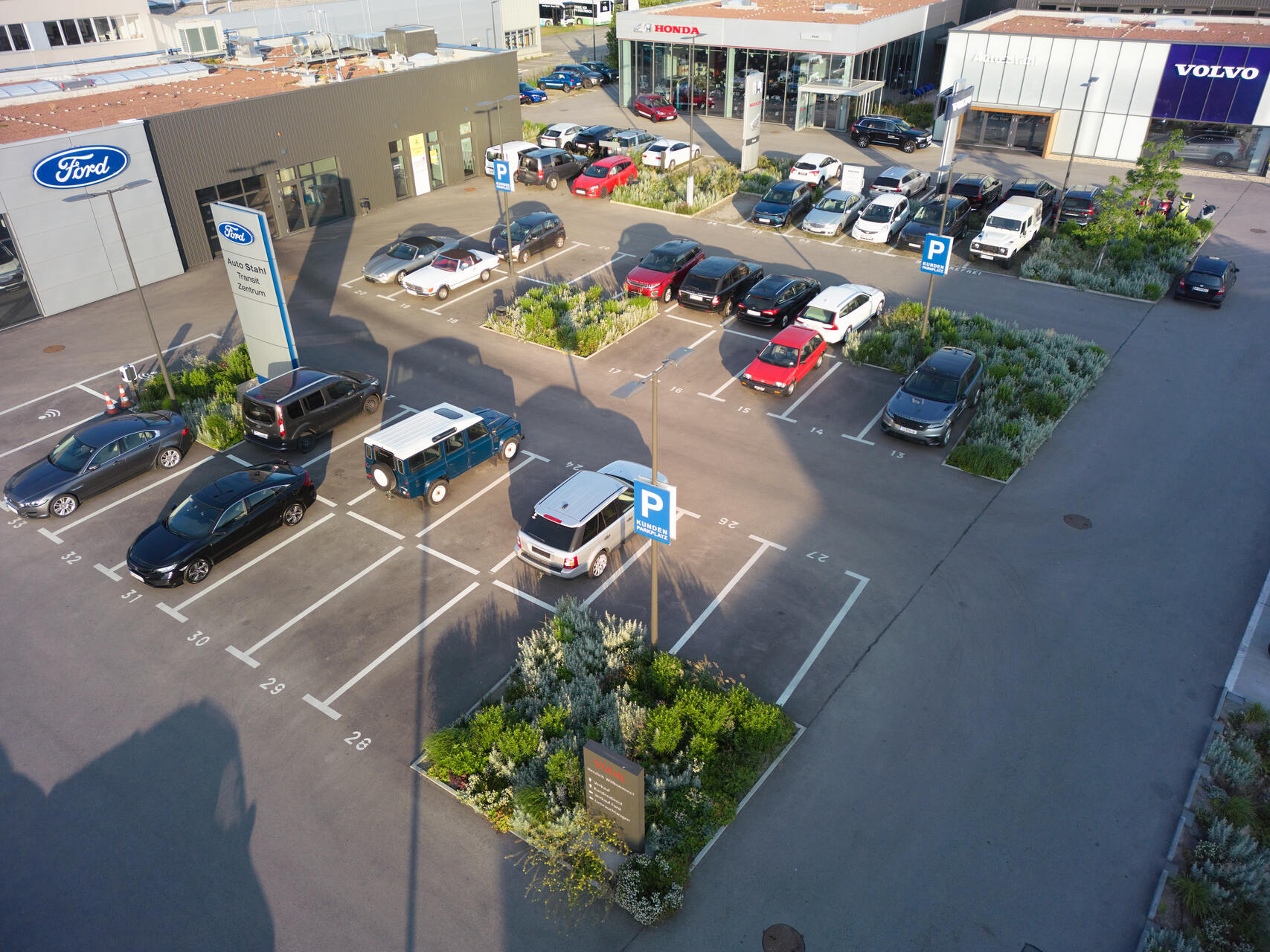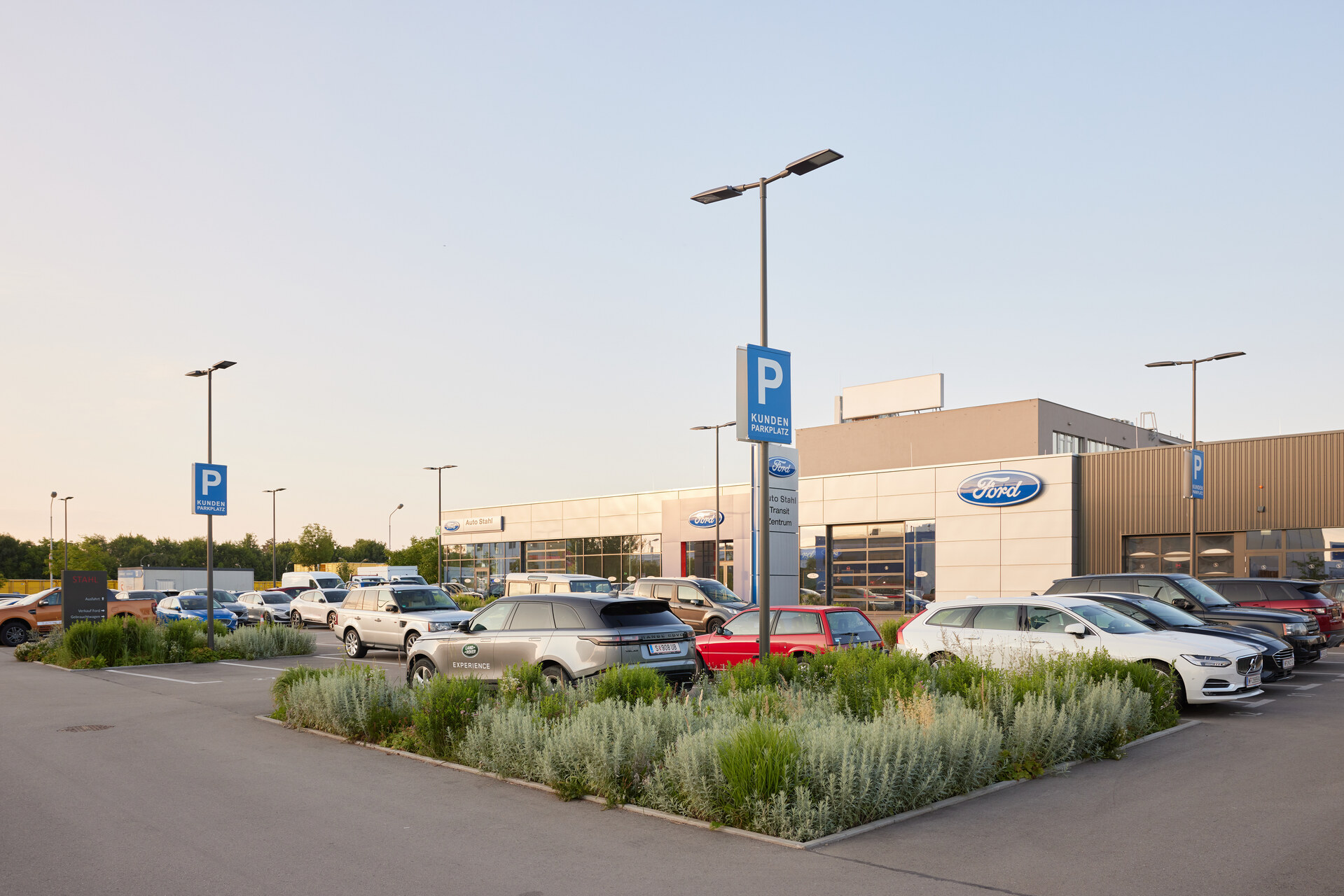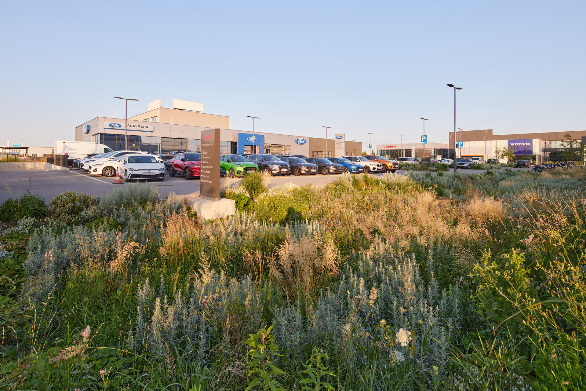Auch die ausgedehnten oberirdischen Sickeranlagen wurden in die Pflanzflächen integriert. (Text: Landschaftsplanerinnen)