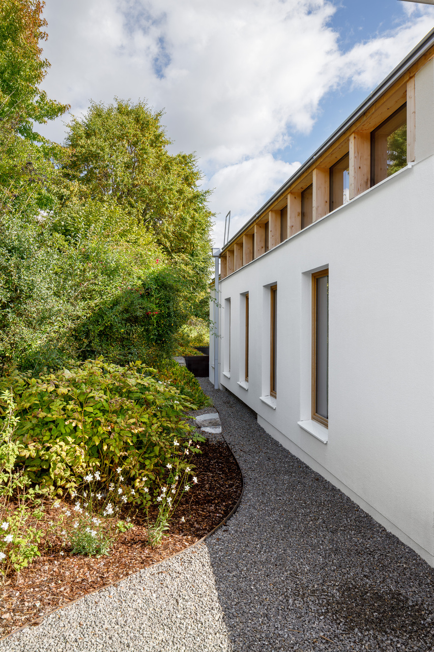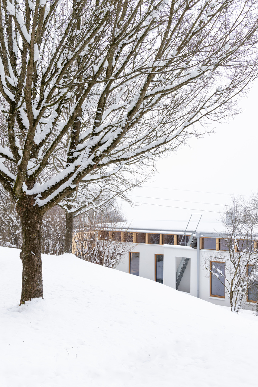Das äußere Erscheinungsbild wurde der Landschaft entsprechend neu interpretiert: Parallel zu den Höhenschichtlinien des Hangs entwickelt sich ein flacher, langgezogener Baukörper mit großzügigen, geschützten Außenräumen. Für eine barrierefreie Erschließung wurde der westliche Gebäudeteil ergänzt bzw. die baufällige Struktur ersetzt. Lift und Stiegenhaus wurden altersgerecht gestaltet.