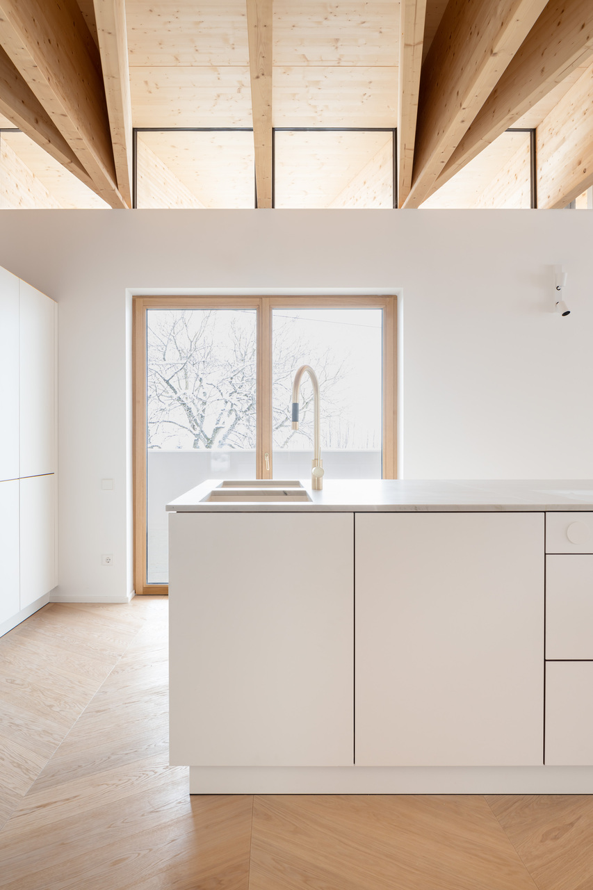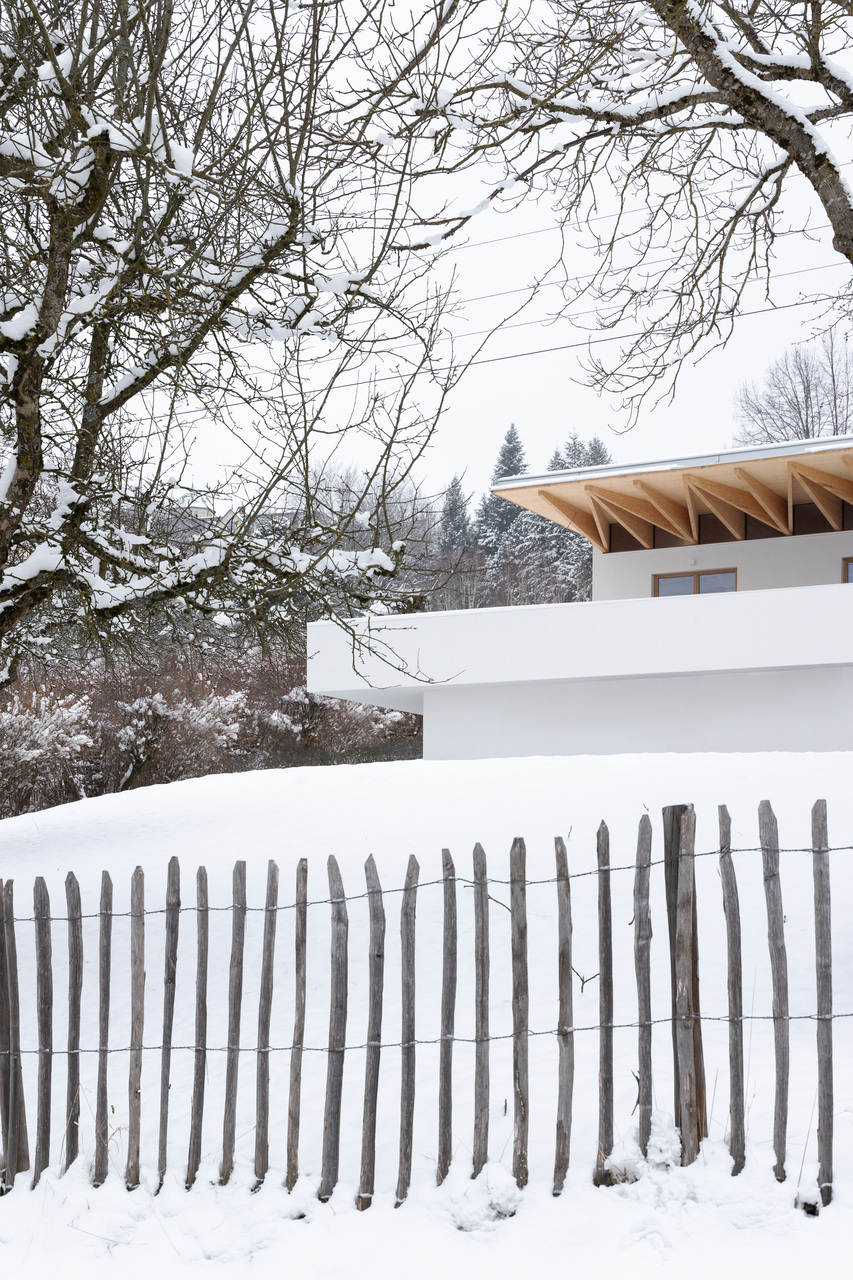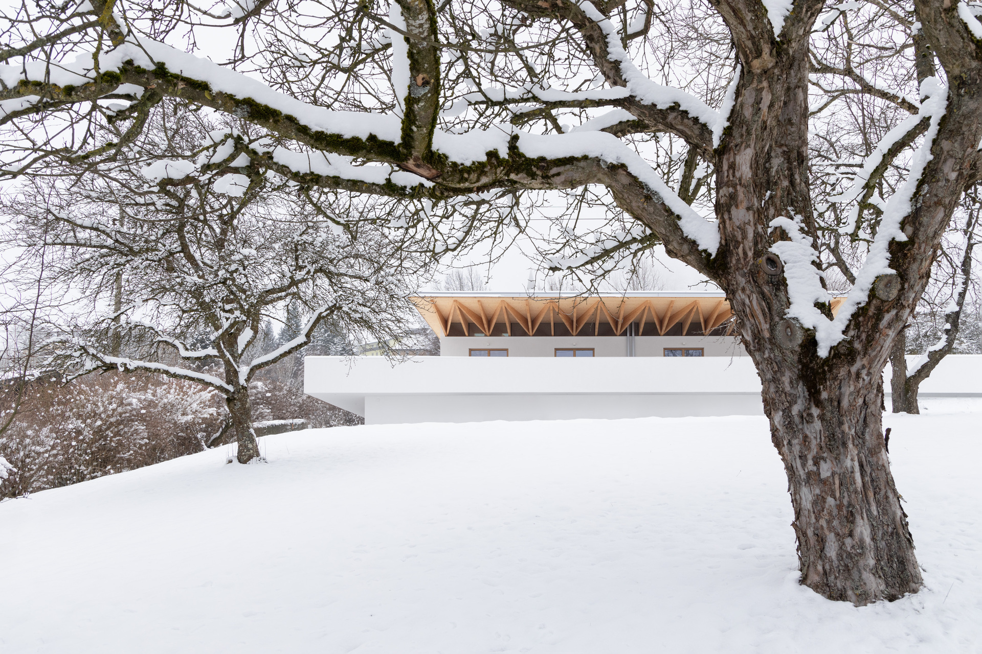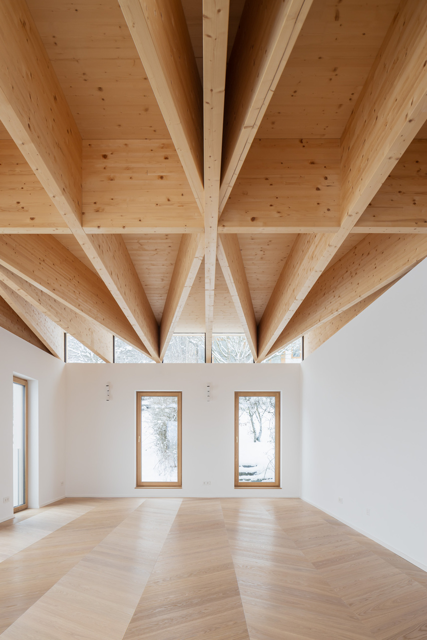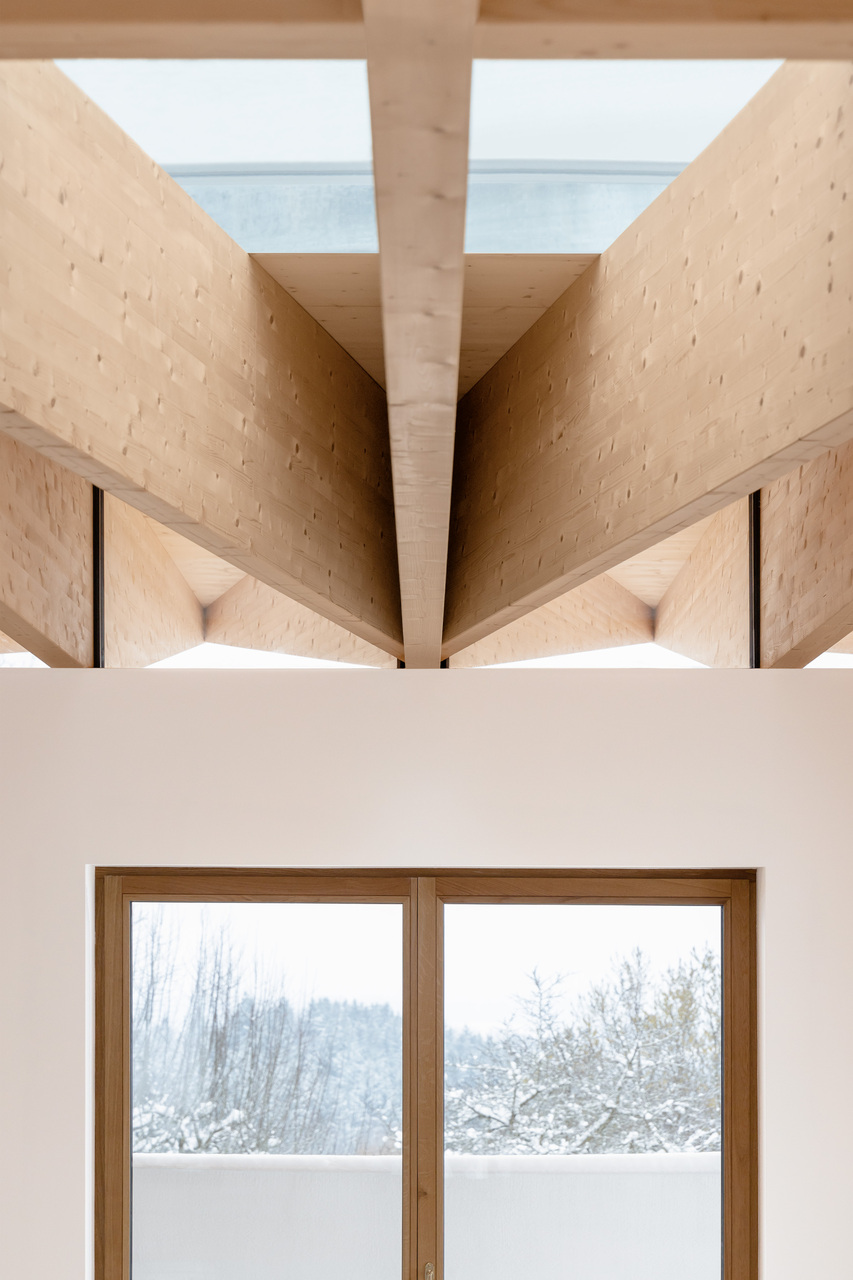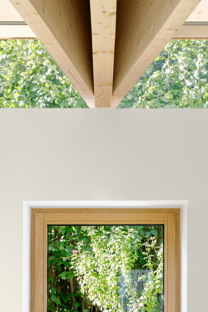 Den Kern des Hauses bildet das obere Geschoss, wo das Wohnen nun auf einer Ebene stattfindet. Außen- und Innenwände blieben hier großteils bestehen, zwei Außenwände wurden in Holzriegelbauweise neu errichtet. Statt des alten Satteldachs überspannen siebzig Zentimeter hohe Brettsperrholzträger das gesamte Geschoss. Fixverglaste Oberlichtbänder holen Licht und das Grün der Umgebung in den Wohnraum. Südseitig kragen die Träger beinahe vier Meter aus, verjüngen sich nach vorne und bilden zusammen mit der geschlossenen Brüstung einen geschützten Außenraum, der sich fast ganzjährig als einladender Wohnbereich im Freien anbietet.