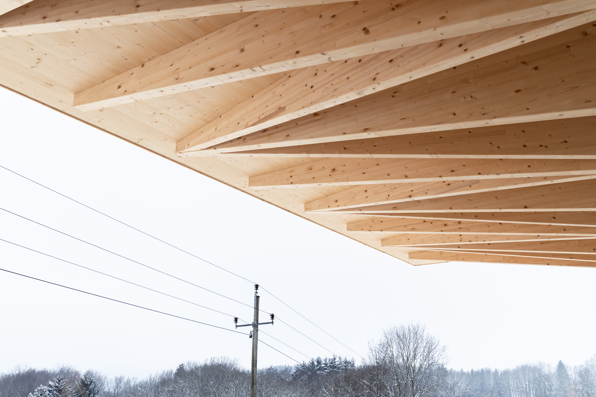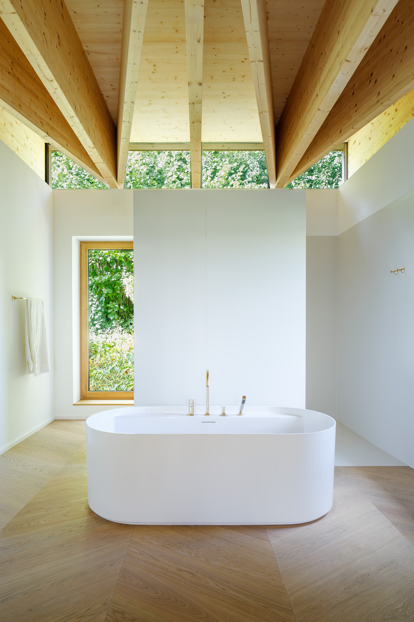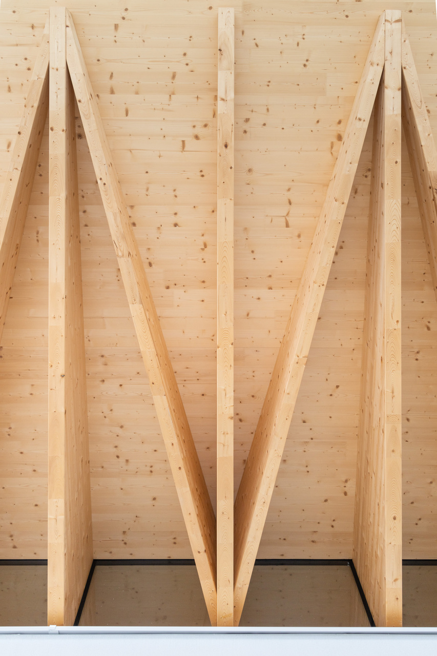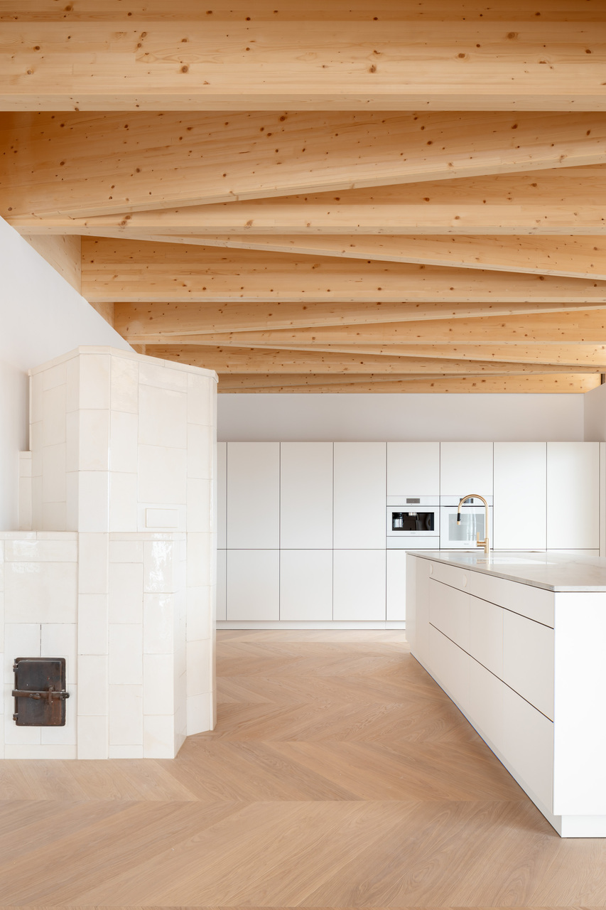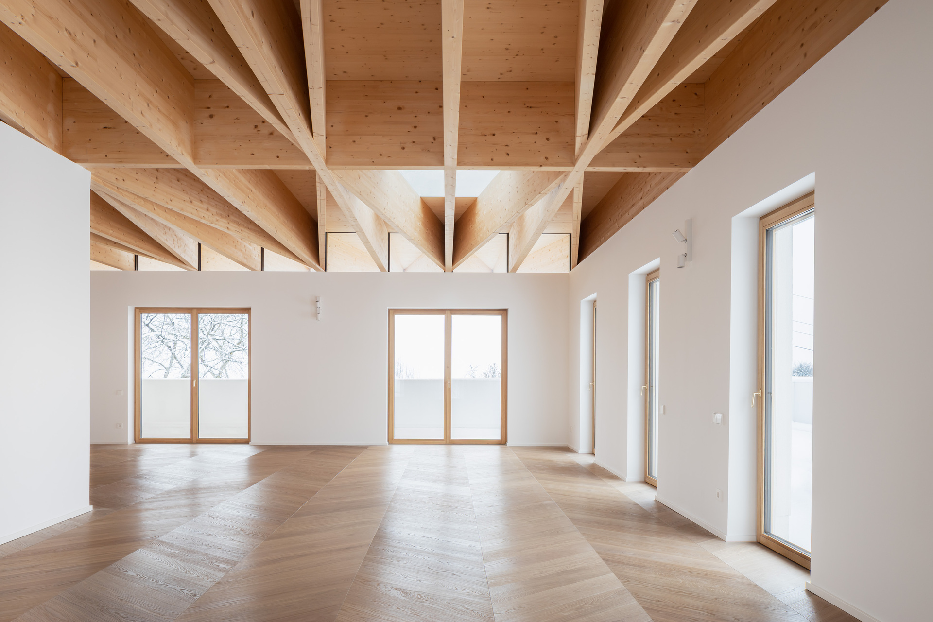 Den Kern des Hauses bildet das obere Geschoss, wo das Wohnen nun auf einer Ebene stattfindet. Außen- und Innenwände blieben hier großteils bestehen, zwei Außenwände wurden in Holzriegelbauweise neu errichtet. Statt des alten Satteldachs überspannen siebzig Zentimeter hohe Brettsperrholzträger das gesamte Geschoss. Fixverglaste Oberlichtbänder holen Licht und das Grün der Umgebung in den Wohnraum. Südseitig kragen die Träger beinahe vier Meter aus, verjüngen sich nach vorne und bilden zusammen mit der geschlossenen Brüstung einen geschützten Außenraum, der sich fast ganzjährig als einladender Wohnbereich im Freien anbietet.