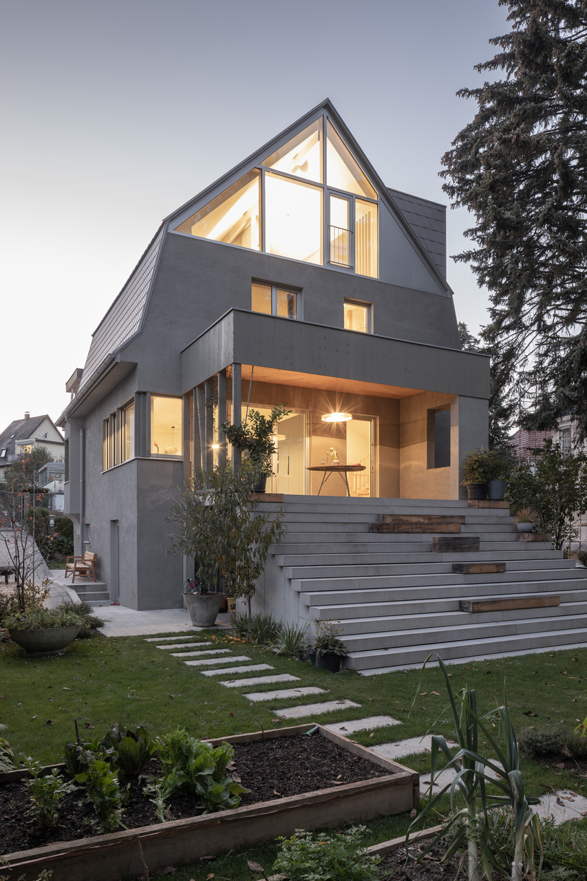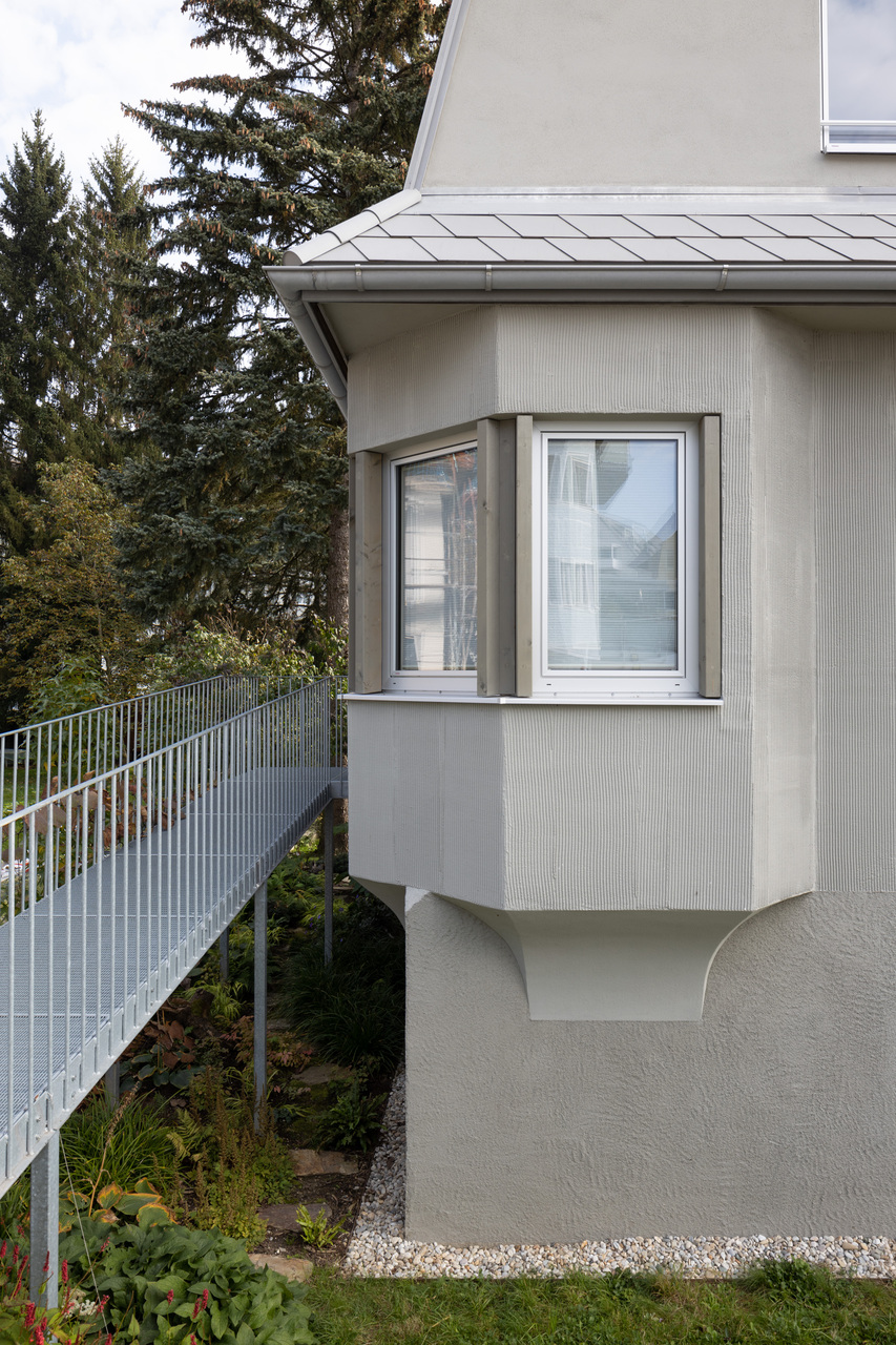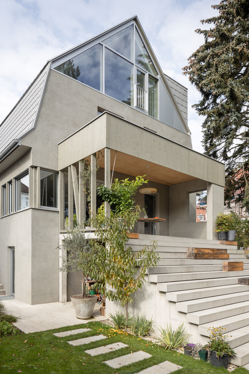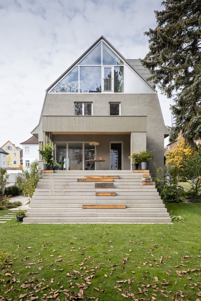 Der Eingang wurde also an die Nordseite gelegt, wo das Erdgeschoss über einen Steg barrierefrei zugänglich gemacht werden konnte. Neben dem Steg gibt es Platz für Fahrräder und Müll, Adresse und Hauseingang ließen sich eindeutig platzieren. Das Erdgeschoss wurde von Unnötigem befreit, ein großzügiger Wohn-Essbereich wurde geschaffen. Auf der Gartenseite steht anstelle des alten Vorbaus eine Holzveranda mit einer breiten, offenen Freitreppe aus Betonfertigteilen. Sie erweitert den Wohnbereich ins Freie und verbindet ihn mit dem Garten. Unter der Treppe findet sich ausreichend Stauraum für alles, was im Garten nützlich ist.
