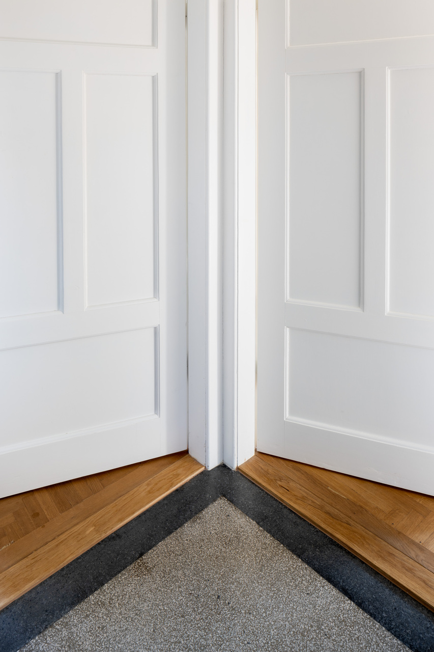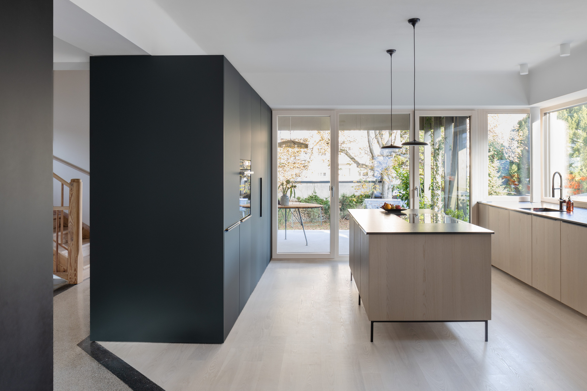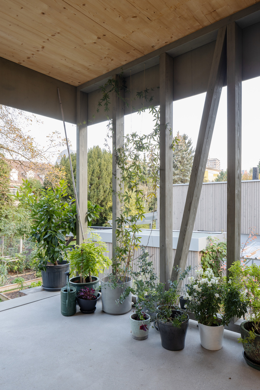 Der Eingang wurde also an die Nordseite gelegt, wo das Erdgeschoss über einen Steg barrierefrei zugänglich gemacht werden konnte. Neben dem Steg gibt es Platz für Fahrräder und Müll, Adresse und Hauseingang ließen sich eindeutig platzieren. Das Erdgeschoss wurde von Unnötigem befreit, ein großzügiger Wohn-Essbereich wurde geschaffen. Auf der Gartenseite steht anstelle des alten Vorbaus eine Holzveranda mit einer breiten, offenen Freitreppe aus Betonfertigteilen. Sie erweitert den Wohnbereich ins Freie und verbindet ihn mit dem Garten. Unter der Treppe findet sich ausreichend Stauraum für alles, was im Garten nützlich ist.