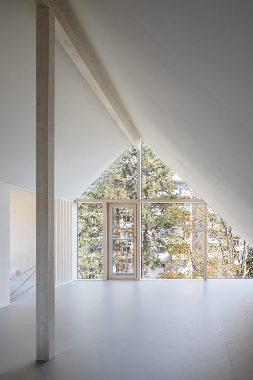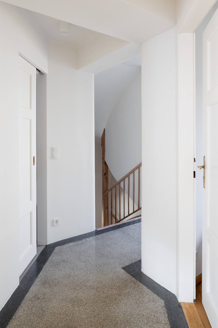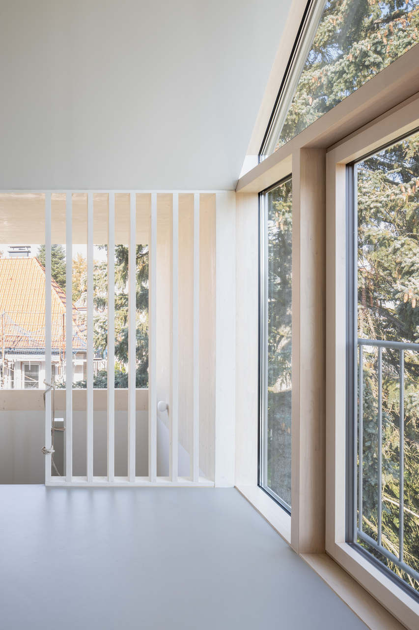 Während sich die Eingriffe im Obergeschoss auf Bad und Oberflächen konzentrierten, wurde der vormals kalte Dachboden zu einem offenen Studio ausgebaut. Die fast vollflächige Verglasung im Ostgiebel holt viel Licht herein und bietet romantische Blicke in die Baumkronen. Das Projekt wurde von der Bauherrschaft mit viel Liebe für den Bestand und mit hohem Anteil an Eigenleistung umgesetzt. (Text: Architekt:innen, bearbeitet)